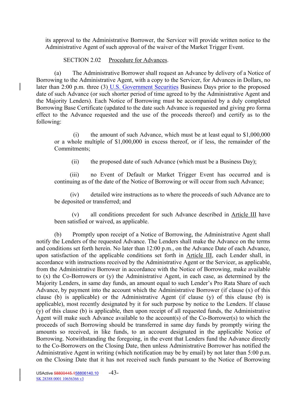 its approval to the Administrative Borrower, the Servicer will provide written notice to the Administrative Agent of such approval of the waiver of the Market Trigger Event. SECTION 2.02 Procedure for Advances. (a) The Administrative Borrower shall request an Advance by delivery of a Notice of Borrowing to the Administrative Agent, with a copy to the Servicer, for Advances in Dollars, no later than 2:00 p.m. three (3) U.S. Government Securities Business Days prior to the proposed date of such Advance (or such shorter period of time agreed to by the Administrative Agent and the Majority Lenders). Each Notice of Borrowing must be accompanied by a duly completed Borrowing Base Certificate (updated to the date such Advance is requested and giving pro forma effect to the Advance requested and the use of the proceeds thereof) and certify as to the following: (i) the amount of such Advance, which must be at least equal to $1,000,000 or a whole multiple of $1,000,000 in excess thereof, or if less, the remainder of the Commitments; (ii) the proposed date of such Advance (which must be a Business Day); (iii) no Event of Default or Market Trigger Event has occurred and is continuing as of the date of the Notice of Borrowing or will occur from such Advance; (iv) detailed wire instructions as to where the proceeds of such Advance are to be deposited or transferred; and (v) all conditions precedent for such Advance described in Article III have been satisfied or waived, as applicable. (b) Promptly upon receipt of a Notice of Borrowing, the Administrative Agent shall notify the Lenders of the requested Advance. The Lenders shall make the Advance on the terms and conditions set forth herein. No later than 12:00 p.m., on the Advance Date of each Advance, upon satisfaction of the applicable conditions set forth in Article III, each Lender shall, in accordance with instructions received by the Administrative Agent or the Servicer, as applicable, from the Administrative Borrower in accordance with the Notice of Borrowing, make available to (x) the Co‐Borrowers or (y) the Administrative Agent, in each case, as determined by the Majority Lenders, in same day funds, an amount equal to such Lender’s Pro Rata Share of such Advance, by payment into the account which the Administrative Borrower (if clause (x) of this clause (b) is applicable) or the Administrative Agent (if clause (y) of this clause (b) is applicable), most recently designated by it for such purpose by notice to the Lenders. If clause (y) of this clause (b) is applicable, then upon receipt of all requested funds, the Administrative Agent will make such Advance available to the account(s) of the Co‐Borrower(s) to which the proceeds of such Borrowing should be transferred in same day funds by promptly wiring the amounts so received, in like funds, to an account designated in the applicable Notice of Borrowing. Notwithstanding the foregoing, in the event that Lenders fund the Advance directly to the Co‐Borrowers on the Closing Date, then unless Administrative Borrower has notified the Administrative Agent in writing (which notification may be by email) by not later than 5:00 p.m. on the Closing Date that it has not received such funds pursuant to the Notice of Borrowing USActive 58800445.158806140.10 -43- SK 28388 0001 10656366 v3