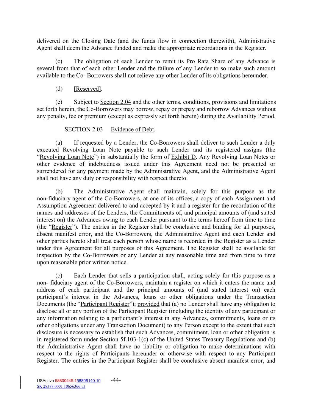 delivered on the Closing Date (and the funds flow in connection therewith), Administrative Agent shall deem the Advance funded and make the appropriate recordations in the Register. (c) The obligation of each Lender to remit its Pro Rata Share of any Advance is several from that of each other Lender and the failure of any Lender to so make such amount available to the Co‐ Borrowers shall not relieve any other Lender of its obligations hereunder. (d) [Reserved]. (e) Subject to Section 2.04 and the other terms, conditions, provisions and limitations set forth herein, the Co‐Borrowers may borrow, repay or prepay and reborrow Advances without any penalty, fee or premium (except as expressly set forth herein) during the Availability Period. SECTION 2.03 Evidence of Debt. (a) If requested by a Lender, the Co‐Borrowers shall deliver to such Lender a duly executed Revolving Loan Note payable to such Lender and its registered assigns (the “Revolving Loan Note”) in substantially the form of Exhibit D. Any Revolving Loan Notes or other evidence of indebtedness issued under this Agreement need not be presented or surrendered for any payment made by the Administrative Agent, and the Administrative Agent shall not have any duty or responsibility with respect thereto. (b) The Administrative Agent shall maintain, solely for this purpose as the non‐fiduciary agent of the Co‐Borrowers, at one of its offices, a copy of each Assignment and Assumption Agreement delivered to and accepted by it and a register for the recordation of the names and addresses of the Lenders, the Commitments of, and principal amounts of (and stated interest on) the Advances owing to each Lender pursuant to the terms hereof from time to time (the “Register”). The entries in the Register shall be conclusive and binding for all purposes, absent manifest error, and the Co‐Borrowers, the Administrative Agent and each Lender and other parties hereto shall treat each person whose name is recorded in the Register as a Lender under this Agreement for all purposes of this Agreement. The Register shall be available for inspection by the Co‐Borrowers or any Lender at any reasonable time and from time to time upon reasonable prior written notice. (c) Each Lender that sells a participation shall, acting solely for this purpose as a non‐ fiduciary agent of the Co‐Borrowers, maintain a register on which it enters the name and address of each participant and the principal amounts of (and stated interest on) each participant’s interest in the Advances, loans or other obligations under the Transaction Documents (the “Participant Register”); provided that (a) no Lender shall have any obligation to disclose all or any portion of the Participant Register (including the identity of any participant or any information relating to a participant’s interest in any Advances, commitments, loans or its other obligations under any Transaction Document) to any Person except to the extent that such disclosure is necessary to establish that such Advances, commitment, loan or other obligation is in registered form under Section 5f.103‐1(c) of the United States Treasury Regulations and (b) the Administrative Agent shall have no liability or obligation to make determinations with respect to the rights of Participants hereunder or otherwise with respect to any Participant Register. The entries in the Participant Register shall be conclusive absent manifest error, and USActive 58800445.158806140.10 -44- SK 28388 0001 10656366 v3