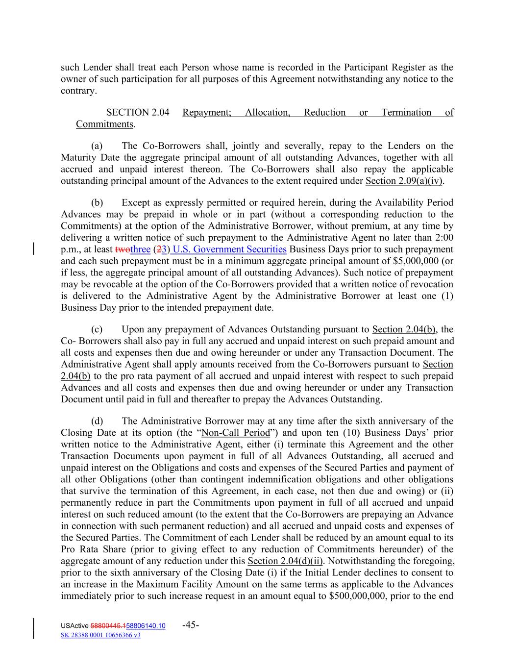 such Lender shall treat each Person whose name is recorded in the Participant Register as the owner of such participation for all purposes of this Agreement notwithstanding any notice to the contrary. SECTION 2.04 Repayment; Allocation, Reduction or Termination of Commitments. (a) The Co‐Borrowers shall, jointly and severally, repay to the Lenders on the Maturity Date the aggregate principal amount of all outstanding Advances, together with all accrued and unpaid interest thereon. The Co‐Borrowers shall also repay the applicable outstanding principal amount of the Advances to the extent required under Section 2.09(a)(iv). (b) Except as expressly permitted or required herein, during the Availability Period Advances may be prepaid in whole or in part (without a corresponding reduction to the Commitments) at the option of the Administrative Borrower, without premium, at any time by delivering a written notice of such prepayment to the Administrative Agent no later than 2:00 p.m., at least twothree (23) U.S. Government Securities Business Days prior to such prepayment and each such prepayment must be in a minimum aggregate principal amount of $5,000,000 (or if less, the aggregate principal amount of all outstanding Advances). Such notice of prepayment may be revocable at the option of the Co‐Borrowers provided that a written notice of revocation is delivered to the Administrative Agent by the Administrative Borrower at least one (1) Business Day prior to the intended prepayment date. (c) Upon any prepayment of Advances Outstanding pursuant to Section 2.04(b), the Co‐ Borrowers shall also pay in full any accrued and unpaid interest on such prepaid amount and all costs and expenses then due and owing hereunder or under any Transaction Document. The Administrative Agent shall apply amounts received from the Co‐Borrowers pursuant to Section 2.04(b) to the pro rata payment of all accrued and unpaid interest with respect to such prepaid Advances and all costs and expenses then due and owing hereunder or under any Transaction Document until paid in full and thereafter to prepay the Advances Outstanding. (d) The Administrative Borrower may at any time after the sixth anniversary of the Closing Date at its option (the “Non‐Call Period”) and upon ten (10) Business Days’ prior written notice to the Administrative Agent, either (i) terminate this Agreement and the other Transaction Documents upon payment in full of all Advances Outstanding, all accrued and unpaid interest on the Obligations and costs and expenses of the Secured Parties and payment of all other Obligations (other than contingent indemnification obligations and other obligations that survive the termination of this Agreement, in each case, not then due and owing) or (ii) permanently reduce in part the Commitments upon payment in full of all accrued and unpaid interest on such reduced amount (to the extent that the Co‐Borrowers are prepaying an Advance in connection with such permanent reduction) and all accrued and unpaid costs and expenses of the Secured Parties. The Commitment of each Lender shall be reduced by an amount equal to its Pro Rata Share (prior to giving effect to any reduction of Commitments hereunder) of the aggregate amount of any reduction under this Section 2.04(d)(ii). Notwithstanding the foregoing, prior to the sixth anniversary of the Closing Date (i) if the Initial Lender declines to consent to an increase in the Maximum Facility Amount on the same terms as applicable to the Advances immediately prior to such increase request in an amount equal to $500,000,000, prior to the end USActive 58800445.158806140.10 -45- SK 28388 0001 10656366 v3