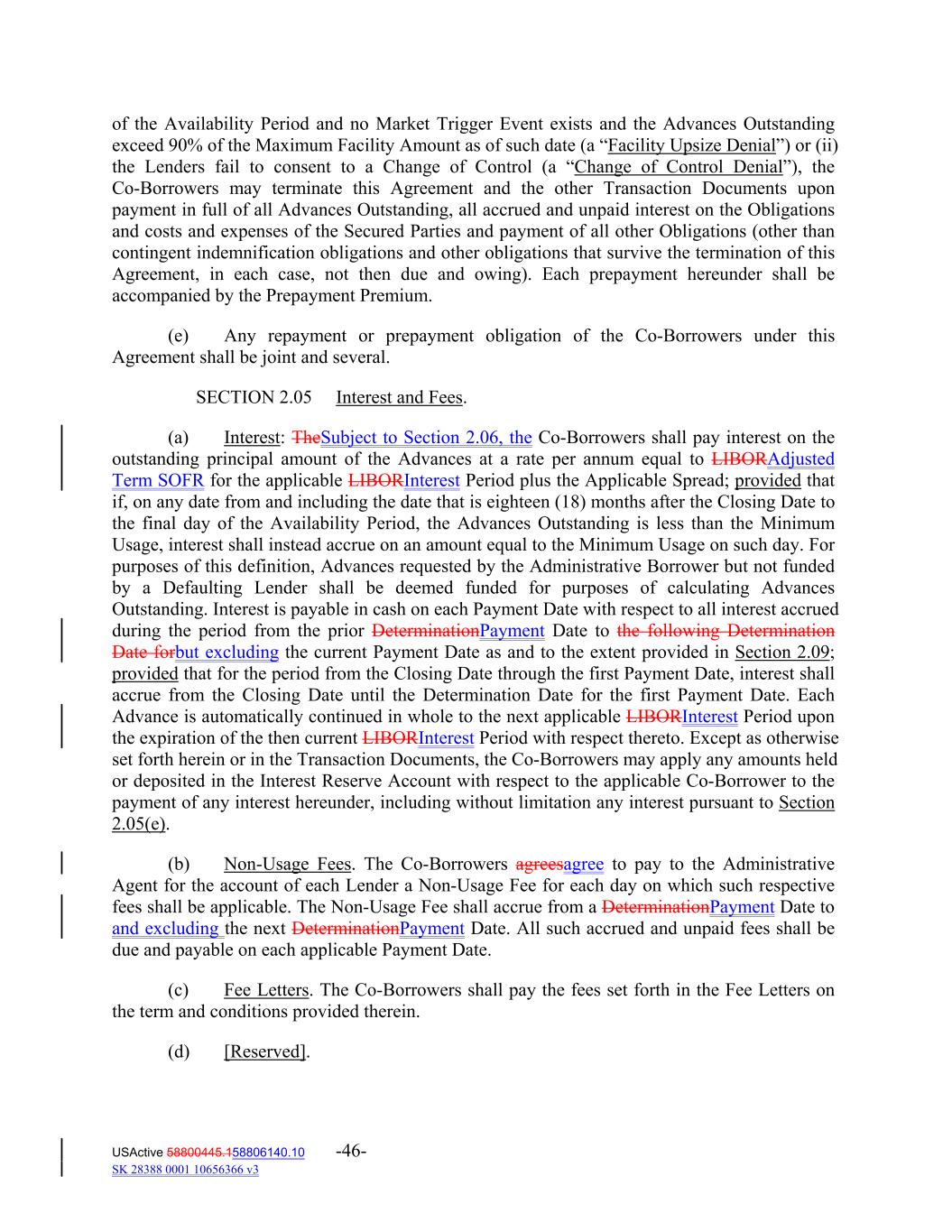 of the Availability Period and no Market Trigger Event exists and the Advances Outstanding exceed 90% of the Maximum Facility Amount as of such date (a “Facility Upsize Denial”) or (ii) the Lenders fail to consent to a Change of Control (a “Change of Control Denial”), the Co‐Borrowers may terminate this Agreement and the other Transaction Documents upon payment in full of all Advances Outstanding, all accrued and unpaid interest on the Obligations and costs and expenses of the Secured Parties and payment of all other Obligations (other than contingent indemnification obligations and other obligations that survive the termination of this Agreement, in each case, not then due and owing). Each prepayment hereunder shall be accompanied by the Prepayment Premium. (e) Any repayment or prepayment obligation of the Co‐Borrowers under this Agreement shall be joint and several. SECTION 2.05 Interest and Fees. (a) Interest: TheSubject to Section 2.06, the Co‐Borrowers shall pay interest on the outstanding principal amount of the Advances at a rate per annum equal to LIBORAdjusted Term SOFR for the applicable LIBORInterest Period plus the Applicable Spread; provided that if, on any date from and including the date that is eighteen (18) months after the Closing Date to the final day of the Availability Period, the Advances Outstanding is less than the Minimum Usage, interest shall instead accrue on an amount equal to the Minimum Usage on such day. For purposes of this definition, Advances requested by the Administrative Borrower but not funded by a Defaulting Lender shall be deemed funded for purposes of calculating Advances Outstanding. Interest is payable in cash on each Payment Date with respect to all interest accrued during the period from the prior DeterminationPayment Date to the following Determination Date forbut excluding the current Payment Date as and to the extent provided in Section 2.09; provided that for the period from the Closing Date through the first Payment Date, interest shall accrue from the Closing Date until the Determination Date for the first Payment Date. Each Advance is automatically continued in whole to the next applicable LIBORInterest Period upon the expiration of the then current LIBORInterest Period with respect thereto. Except as otherwise set forth herein or in the Transaction Documents, the Co‐Borrowers may apply any amounts held or deposited in the Interest Reserve Account with respect to the applicable Co‐Borrower to the payment of any interest hereunder, including without limitation any interest pursuant to Section 2.05(e). (b) Non‐Usage Fees. The Co‐Borrowers agreesagree to pay to the Administrative Agent for the account of each Lender a Non‐Usage Fee for each day on which such respective fees shall be applicable. The Non‐Usage Fee shall accrue from a DeterminationPayment Date to and excluding the next DeterminationPayment Date. All such accrued and unpaid fees shall be due and payable on each applicable Payment Date. (c) Fee Letters. The Co‐Borrowers shall pay the fees set forth in the Fee Letters on the term and conditions provided therein. (d) [Reserved]. USActive 58800445.158806140.10 -46- SK 28388 0001 10656366 v3
