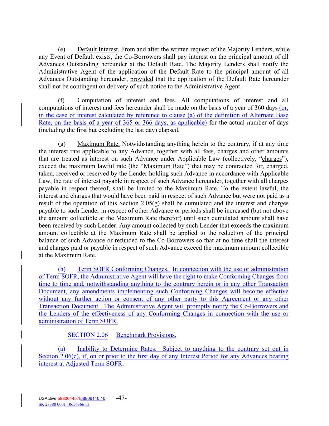 (e) Default Interest. From and after the written request of the Majority Lenders, while any Event of Default exists, the Co‐Borrowers shall pay interest on the principal amount of all Advances Outstanding hereunder at the Default Rate. The Majority Lenders shall notify the Administrative Agent of the application of the Default Rate to the principal amount of all Advances Outstanding hereunder, provided that the application of the Default Rate hereunder shall not be contingent on delivery of such notice to the Administrative Agent. (f) Computation of interest and fees. All computations of interest and all computations of interest and fees hereunder shall be made on the basis of a year of 360 days (or, in the case of interest calculated by reference to clause (a) of the definition of Alternate Base Rate, on the basis of a year of 365 or 366 days, as applicable) for the actual number of days (including the first but excluding the last day) elapsed. (g) Maximum Rate. Notwithstanding anything herein to the contrary, if at any time the interest rate applicable to any Advance, together with all fees, charges and other amounts that are treated as interest on such Advance under Applicable Law (collectively, “charges”), exceed the maximum lawful rate (the “Maximum Rate”) that may be contracted for, charged, taken, received or reserved by the Lender holding such Advance in accordance with Applicable Law, the rate of interest payable in respect of such Advance hereunder, together with all charges payable in respect thereof, shall be limited to the Maximum Rate. To the extent lawful, the interest and charges that would have been paid in respect of such Advance but were not paid as a result of the operation of this Section 2.05(g) shall be cumulated and the interest and charges payable to such Lender in respect of other Advance or periods shall be increased (but not above the amount collectible at the Maximum Rate therefor) until such cumulated amount shall have been received by such Lender. Any amount collected by such Lender that exceeds the maximum amount collectible at the Maximum Rate shall be applied to the reduction of the principal balance of such Advance or refunded to the Co‐Borrowers so that at no time shall the interest and charges paid or payable in respect of such Advance exceed the maximum amount collectible at the Maximum Rate. (h) Term SOFR Conforming Changes. In connection with the use or administration of Term SOFR, the Administrative Agent will have the right to make Conforming Changes from time to time and, notwithstanding anything to the contrary herein or in any other Transaction Document, any amendments implementing such Conforming Changes will become effective without any further action or consent of any other party to this Agreement or any other Transaction Document. The Administrative Agent will promptly notify the Co-Borrowers and the Lenders of the effectiveness of any Conforming Changes in connection with the use or administration of Term SOFR. SECTION 2.06 Benchmark Provisions. (a) Inability to Determine Rates. Subject to anything to the contrary set out in Section 2.06(c), if, on or prior to the first day of any Interest Period for any Advances bearing interest at Adjusted Term SOFR: USActive 58800445.158806140.10 -47- SK 28388 0001 10656366 v3