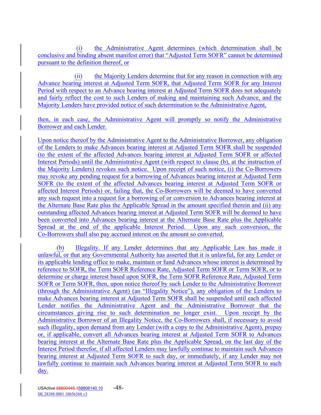 (i) the Administrative Agent determines (which determination shall be conclusive and binding absent manifest error) that “Adjusted Term SOFR” cannot be determined pursuant to the definition thereof, or (ii) the Majority Lenders determine that for any reason in connection with any Advance bearing interest at Adjusted Term SOFR, that Adjusted Term SOFR for any Interest Period with respect to an Advance bearing interest at Adjusted Term SOFR does not adequately and fairly reflect the cost to such Lenders of making and maintaining such Advance, and the Majority Lenders have provided notice of such determination to the Administrative Agent, then, in each case, the Administrative Agent will promptly so notify the Administrative Borrower and each Lender. Upon notice thereof by the Administrative Agent to the Administrative Borrower, any obligation of the Lenders to make Advances bearing interest at Adjusted Term SOFR shall be suspended (to the extent of the affected Advances bearing interest at Adjusted Term SOFR or affected Interest Periods) until the Administrative Agent (with respect to clause (b), at the instruction of the Majority Lenders) revokes such notice. Upon receipt of such notice, (i) the Co-Borrowers may revoke any pending request for a borrowing of Advances bearing interest at Adjusted Term SOFR (to the extent of the affected Advances bearing interest at Adjusted Term SOFR or affected Interest Periods) or, failing that, the Co-Borrowers will be deemed to have converted any such request into a request for a borrowing of or conversion to Advances bearing interest at the Alternate Base Rate plus the Applicable Spread in the amount specified therein and (ii) any outstanding affected Advances bearing interest at Adjusted Term SOFR will be deemed to have been converted into Advances bearing interest at the Alternate Base Rate plus the Applicable Spread at the end of the applicable Interest Period. Upon any such conversion, the Co-Borrowers shall also pay accrued interest on the amount so converted. (b) Illegality. If any Lender determines that any Applicable Law has made it unlawful, or that any Governmental Authority has asserted that it is unlawful, for any Lender or its applicable lending office to make, maintain or fund Advances whose interest is determined by reference to SOFR, the Term SOFR Reference Rate, Adjusted Term SOFR or Term SOFR, or to determine or charge interest based upon SOFR, the Term SOFR Reference Rate, Adjusted Term SOFR or Term SOFR, then, upon notice thereof by such Lender to the Administrative Borrower (through the Administrative Agent) (an “Illegality Notice”), any obligation of the Lenders to make Advances bearing interest at Adjusted Term SOFR shall be suspended until each affected Lender notifies the Administrative Agent and the Administrative Borrower that the circumstances giving rise to such determination no longer exist. Upon receipt by the Administrative Borrower of an Illegality Notice, the Co-Borrowers shall, if necessary to avoid such illegality, upon demand from any Lender (with a copy to the Administrative Agent), prepay or, if applicable, convert all Advances bearing interest at Adjusted Term SOFR to Advances bearing interest at the Alternate Base Rate plus the Applicable Spread, on the last day of the Interest Period therefor, if all affected Lenders may lawfully continue to maintain such Advances bearing interest at Adjusted Term SOFR to such day, or immediately, if any Lender may not lawfully continue to maintain such Advances bearing interest at Adjusted Term SOFR to such day. USActive 58800445.158806140.10 -48- SK 28388 0001 10656366 v3