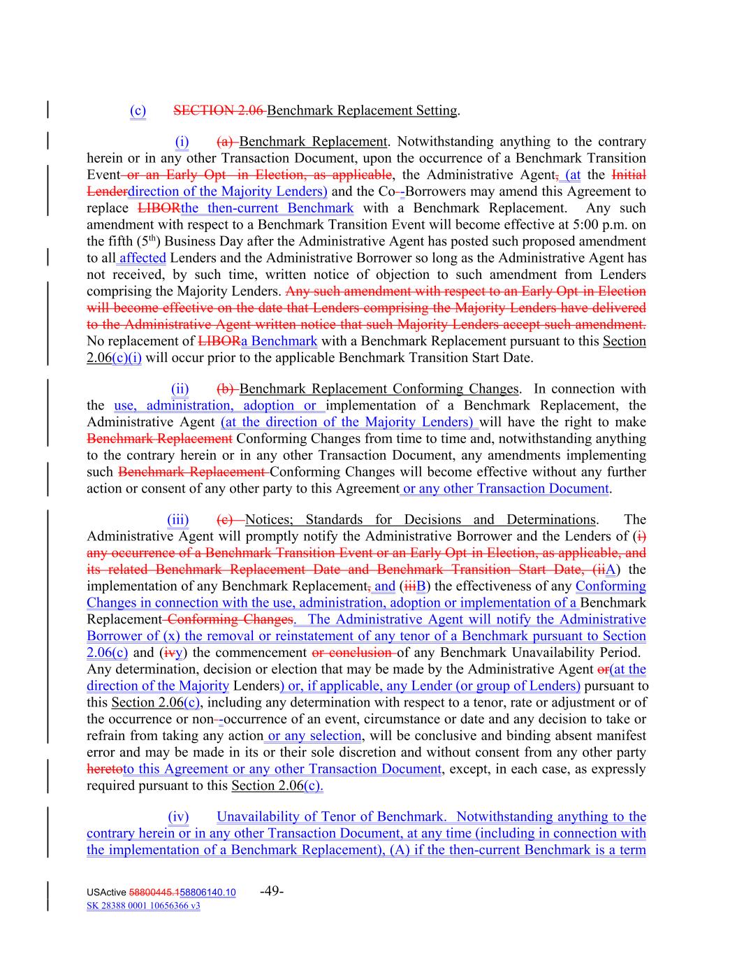 (c) SECTION 2.06 Benchmark Replacement Setting. (i) (a) Benchmark Replacement. Notwithstanding anything to the contrary herein or in any other Transaction Document, upon the occurrence of a Benchmark Transition Event or an Early Opt in Election, as applicable, the Administrative Agent, (at the Initial Lenderdirection of the Majority Lenders) and the Co -Borrowers may amend this Agreement to replace LIBORthe then-current Benchmark with a Benchmark Replacement. Any such amendment with respect to a Benchmark Transition Event will become effective at 5:00 p.m. on the fifth (5th) Business Day after the Administrative Agent has posted such proposed amendment to all affected Lenders and the Administrative Borrower so long as the Administrative Agent has not received, by such time, written notice of objection to such amendment from Lenders comprising the Majority Lenders. Any such amendment with respect to an Early Opt in Election will become effective on the date that Lenders comprising the Majority Lenders have delivered to the Administrative Agent written notice that such Majority Lenders accept such amendment. No replacement of LIBORa Benchmark with a Benchmark Replacement pursuant to this Section 2.06(c)(i) will occur prior to the applicable Benchmark Transition Start Date. (ii) (b) Benchmark Replacement Conforming Changes. In connection with the use, administration, adoption or implementation of a Benchmark Replacement, the Administrative Agent (at the direction of the Majority Lenders) will have the right to make Benchmark Replacement Conforming Changes from time to time and, notwithstanding anything to the contrary herein or in any other Transaction Document, any amendments implementing such Benchmark Replacement Conforming Changes will become effective without any further action or consent of any other party to this Agreement or any other Transaction Document. (iii) (c) Notices; Standards for Decisions and Determinations. The Administrative Agent will promptly notify the Administrative Borrower and the Lenders of (i) any occurrence of a Benchmark Transition Event or an Early Opt in Election, as applicable, and its related Benchmark Replacement Date and Benchmark Transition Start Date, (iiA) the implementation of any Benchmark Replacement, and (iiiB) the effectiveness of any Conforming Changes in connection with the use, administration, adoption or implementation of a Benchmark Replacement Conforming Changes. The Administrative Agent will notify the Administrative Borrower of (x) the removal or reinstatement of any tenor of a Benchmark pursuant to Section 2.06(c) and (ivy) the commencement or conclusion of any Benchmark Unavailability Period. Any determination, decision or election that may be made by the Administrative Agent or(at the direction of the Majority Lenders) or, if applicable, any Lender (or group of Lenders) pursuant to this Section 2.06(c), including any determination with respect to a tenor, rate or adjustment or of the occurrence or non -occurrence of an event, circumstance or date and any decision to take or refrain from taking any action or any selection, will be conclusive and binding absent manifest error and may be made in its or their sole discretion and without consent from any other party heretoto this Agreement or any other Transaction Document, except, in each case, as expressly required pursuant to this Section 2.06(c). (iv) Unavailability of Tenor of Benchmark. Notwithstanding anything to the contrary herein or in any other Transaction Document, at any time (including in connection with the implementation of a Benchmark Replacement), (A) if the then-current Benchmark is a term USActive 58800445.158806140.10 -49- SK 28388 0001 10656366 v3