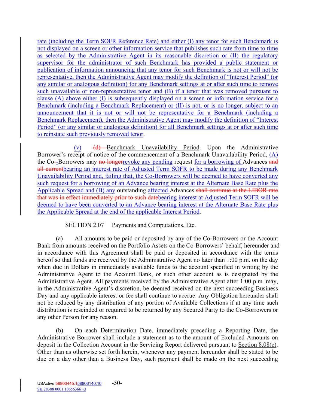 rate (including the Term SOFR Reference Rate) and either (I) any tenor for such Benchmark is not displayed on a screen or other information service that publishes such rate from time to time as selected by the Administrative Agent in its reasonable discretion or (II) the regulatory supervisor for the administrator of such Benchmark has provided a public statement or publication of information announcing that any tenor for such Benchmark is not or will not be representative, then the Administrative Agent may modify the definition of “Interest Period” (or any similar or analogous definition) for any Benchmark settings at or after such time to remove such unavailable or non-representative tenor and (B) if a tenor that was removed pursuant to clause (A) above either (I) is subsequently displayed on a screen or information service for a Benchmark (including a Benchmark Replacement) or (II) is not, or is no longer, subject to an announcement that it is not or will not be representative for a Benchmark (including a Benchmark Replacement), then the Administrative Agent may modify the definition of “Interest Period” (or any similar or analogous definition) for all Benchmark settings at or after such time to reinstate such previously removed tenor. (v) (d) Benchmark Unavailability Period. Upon the Administrative Borrower’s receipt of notice of the commencement of a Benchmark Unavailability Period, (A) the Co -Borrowers may no longerrevoke any pending request for a borrowing of Advances and all currentbearing an interest rate of Adjusted Term SOFR to be made during any Benchmark Unavailability Period and, failing that, the Co-Borrowers will be deemed to have converted any such request for a borrowing of an Advance bearing interest at the Alternate Base Rate plus the Applicable Spread and (B) any outstanding affected Advances shall continue at the LIBOR rate that was in effect immediately prior to such datebearing interest at Adjusted Term SOFR will be deemed to have been converted to an Advance bearing interest at the Alternate Base Rate plus the Applicable Spread at the end of the applicable Interest Period. SECTION 2.07 Payments and Computations, Etc. (a) All amounts to be paid or deposited by any of the Co‐Borrowers or the Account Bank from amounts received on the Portfolio Assets on the Co‐Borrowers’ behalf, hereunder and in accordance with this Agreement shall be paid or deposited in accordance with the terms hereof so that funds are received by the Administrative Agent no later than 1:00 p.m. on the day when due in Dollars in immediately available funds to the account specified in writing by the Administrative Agent to the Account Bank, or such other account as is designated by the Administrative Agent. All payments received by the Administrative Agent after 1:00 p.m. may, in the Administrative Agent’s discretion, be deemed received on the next succeeding Business Day and any applicable interest or fee shall continue to accrue. Any Obligation hereunder shall not be reduced by any distribution of any portion of Available Collections if at any time such distribution is rescinded or required to be returned by any Secured Party to the Co‐Borrowers or any other Person for any reason. (b) On each Determination Date, immediately preceding a Reporting Date, the Administrative Borrower shall include a statement as to the amount of Excluded Amounts on deposit in the Collection Account in the Servicing Report delivered pursuant to Section 8.08(c). Other than as otherwise set forth herein, whenever any payment hereunder shall be stated to be due on a day other than a Business Day, such payment shall be made on the next succeeding USActive 58800445.158806140.10 -50- SK 28388 0001 10656366 v3