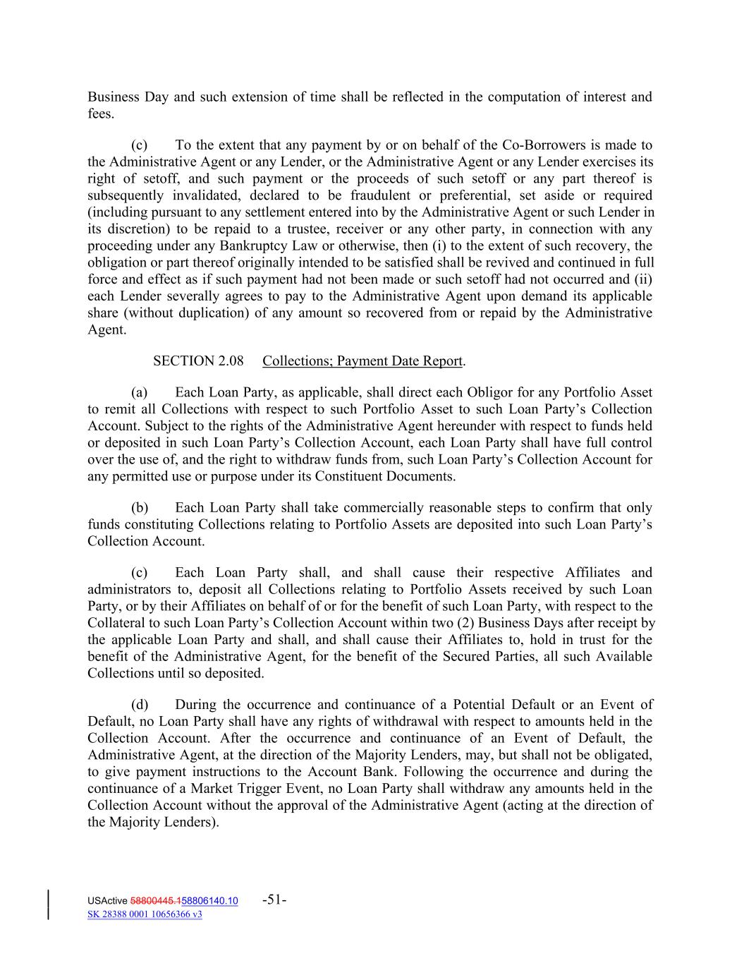 Business Day and such extension of time shall be reflected in the computation of interest and fees. (c) To the extent that any payment by or on behalf of the Co‐Borrowers is made to the Administrative Agent or any Lender, or the Administrative Agent or any Lender exercises its right of setoff, and such payment or the proceeds of such setoff or any part thereof is subsequently invalidated, declared to be fraudulent or preferential, set aside or required (including pursuant to any settlement entered into by the Administrative Agent or such Lender in its discretion) to be repaid to a trustee, receiver or any other party, in connection with any proceeding under any Bankruptcy Law or otherwise, then (i) to the extent of such recovery, the obligation or part thereof originally intended to be satisfied shall be revived and continued in full force and effect as if such payment had not been made or such setoff had not occurred and (ii) each Lender severally agrees to pay to the Administrative Agent upon demand its applicable share (without duplication) of any amount so recovered from or repaid by the Administrative Agent. SECTION 2.08 Collections; Payment Date Report. (a) Each Loan Party, as applicable, shall direct each Obligor for any Portfolio Asset to remit all Collections with respect to such Portfolio Asset to such Loan Party’s Collection Account. Subject to the rights of the Administrative Agent hereunder with respect to funds held or deposited in such Loan Party’s Collection Account, each Loan Party shall have full control over the use of, and the right to withdraw funds from, such Loan Party’s Collection Account for any permitted use or purpose under its Constituent Documents. (b) Each Loan Party shall take commercially reasonable steps to confirm that only funds constituting Collections relating to Portfolio Assets are deposited into such Loan Party’s Collection Account. (c) Each Loan Party shall, and shall cause their respective Affiliates and administrators to, deposit all Collections relating to Portfolio Assets received by such Loan Party, or by their Affiliates on behalf of or for the benefit of such Loan Party, with respect to the Collateral to such Loan Party’s Collection Account within two (2) Business Days after receipt by the applicable Loan Party and shall, and shall cause their Affiliates to, hold in trust for the benefit of the Administrative Agent, for the benefit of the Secured Parties, all such Available Collections until so deposited. (d) During the occurrence and continuance of a Potential Default or an Event of Default, no Loan Party shall have any rights of withdrawal with respect to amounts held in the Collection Account. After the occurrence and continuance of an Event of Default, the Administrative Agent, at the direction of the Majority Lenders, may, but shall not be obligated, to give payment instructions to the Account Bank. Following the occurrence and during the continuance of a Market Trigger Event, no Loan Party shall withdraw any amounts held in the Collection Account without the approval of the Administrative Agent (acting at the direction of the Majority Lenders). USActive 58800445.158806140.10 -51- SK 28388 0001 10656366 v3