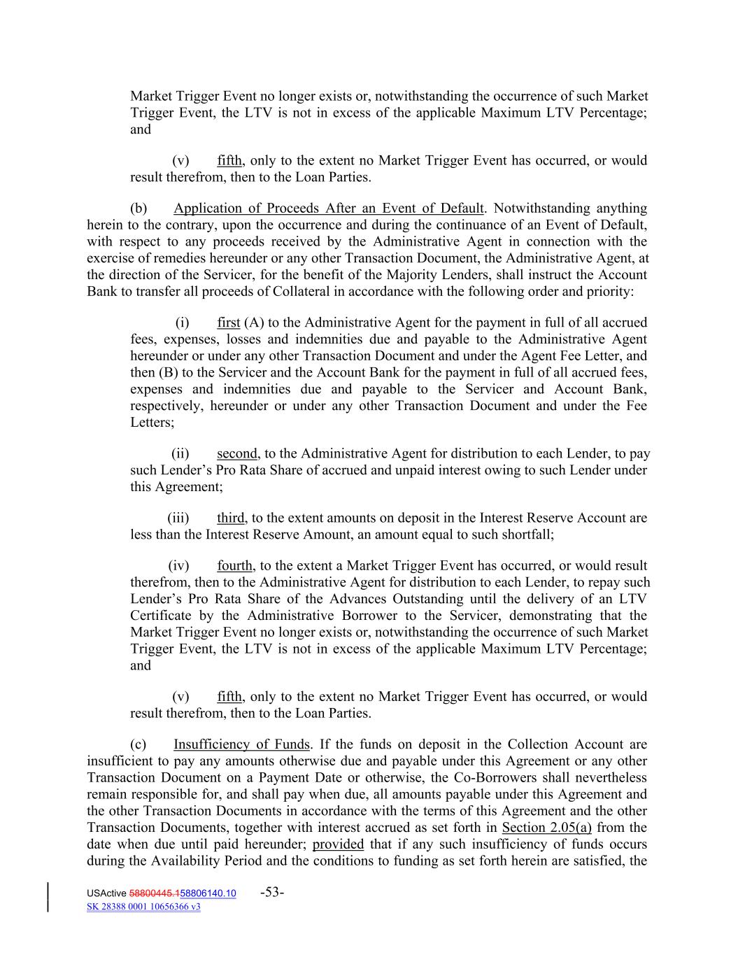 Market Trigger Event no longer exists or, notwithstanding the occurrence of such Market Trigger Event, the LTV is not in excess of the applicable Maximum LTV Percentage; and (v) fifth, only to the extent no Market Trigger Event has occurred, or would result therefrom, then to the Loan Parties. (b) Application of Proceeds After an Event of Default. Notwithstanding anything herein to the contrary, upon the occurrence and during the continuance of an Event of Default, with respect to any proceeds received by the Administrative Agent in connection with the exercise of remedies hereunder or any other Transaction Document, the Administrative Agent, at the direction of the Servicer, for the benefit of the Majority Lenders, shall instruct the Account Bank to transfer all proceeds of Collateral in accordance with the following order and priority: (i) first (A) to the Administrative Agent for the payment in full of all accrued fees, expenses, losses and indemnities due and payable to the Administrative Agent hereunder or under any other Transaction Document and under the Agent Fee Letter, and then (B) to the Servicer and the Account Bank for the payment in full of all accrued fees, expenses and indemnities due and payable to the Servicer and Account Bank, respectively, hereunder or under any other Transaction Document and under the Fee Letters; (ii) second, to the Administrative Agent for distribution to each Lender, to pay such Lender’s Pro Rata Share of accrued and unpaid interest owing to such Lender under this Agreement; (iii) third, to the extent amounts on deposit in the Interest Reserve Account are less than the Interest Reserve Amount, an amount equal to such shortfall; (iv) fourth, to the extent a Market Trigger Event has occurred, or would result therefrom, then to the Administrative Agent for distribution to each Lender, to repay such Lender’s Pro Rata Share of the Advances Outstanding until the delivery of an LTV Certificate by the Administrative Borrower to the Servicer, demonstrating that the Market Trigger Event no longer exists or, notwithstanding the occurrence of such Market Trigger Event, the LTV is not in excess of the applicable Maximum LTV Percentage; and (v) fifth, only to the extent no Market Trigger Event has occurred, or would result therefrom, then to the Loan Parties. (c) Insufficiency of Funds. If the funds on deposit in the Collection Account are insufficient to pay any amounts otherwise due and payable under this Agreement or any other Transaction Document on a Payment Date or otherwise, the Co‐Borrowers shall nevertheless remain responsible for, and shall pay when due, all amounts payable under this Agreement and the other Transaction Documents in accordance with the terms of this Agreement and the other Transaction Documents, together with interest accrued as set forth in Section 2.05(a) from the date when due until paid hereunder; provided that if any such insufficiency of funds occurs during the Availability Period and the conditions to funding as set forth herein are satisfied, the USActive 58800445.158806140.10 -53- SK 28388 0001 10656366 v3