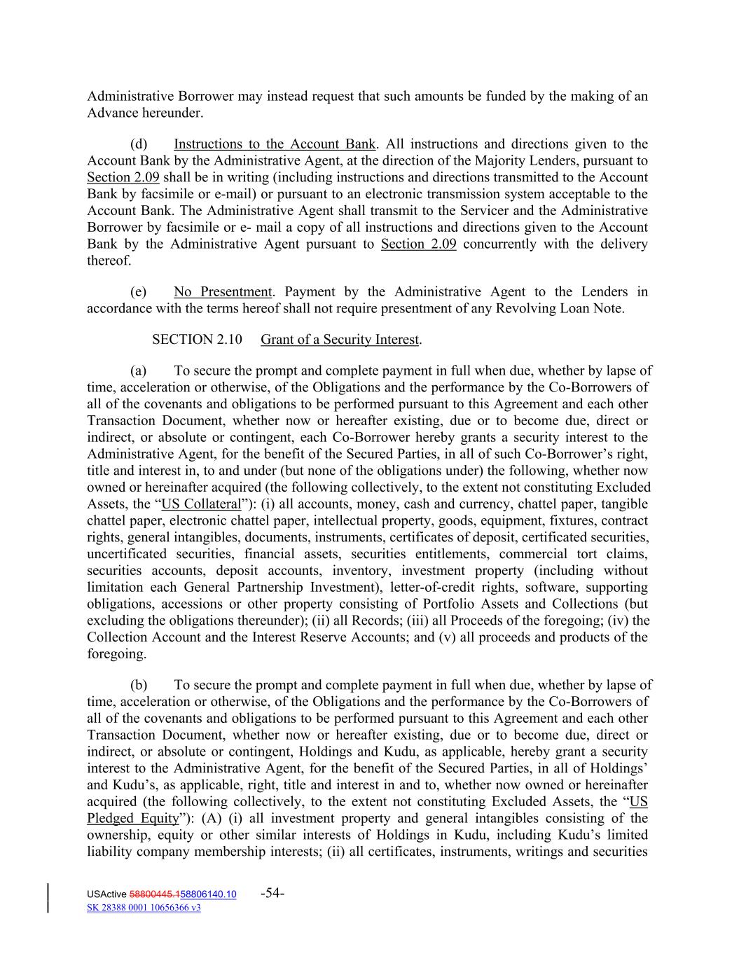 Administrative Borrower may instead request that such amounts be funded by the making of an Advance hereunder. (d) Instructions to the Account Bank. All instructions and directions given to the Account Bank by the Administrative Agent, at the direction of the Majority Lenders, pursuant to Section 2.09 shall be in writing (including instructions and directions transmitted to the Account Bank by facsimile or e‐mail) or pursuant to an electronic transmission system acceptable to the Account Bank. The Administrative Agent shall transmit to the Servicer and the Administrative Borrower by facsimile or e‐ mail a copy of all instructions and directions given to the Account Bank by the Administrative Agent pursuant to Section 2.09 concurrently with the delivery thereof. (e) No Presentment. Payment by the Administrative Agent to the Lenders in accordance with the terms hereof shall not require presentment of any Revolving Loan Note. SECTION 2.10 Grant of a Security Interest. (a) To secure the prompt and complete payment in full when due, whether by lapse of time, acceleration or otherwise, of the Obligations and the performance by the Co‐Borrowers of all of the covenants and obligations to be performed pursuant to this Agreement and each other Transaction Document, whether now or hereafter existing, due or to become due, direct or indirect, or absolute or contingent, each Co‐Borrower hereby grants a security interest to the Administrative Agent, for the benefit of the Secured Parties, in all of such Co‐Borrower’s right, title and interest in, to and under (but none of the obligations under) the following, whether now owned or hereinafter acquired (the following collectively, to the extent not constituting Excluded Assets, the “US Collateral”): (i) all accounts, money, cash and currency, chattel paper, tangible chattel paper, electronic chattel paper, intellectual property, goods, equipment, fixtures, contract rights, general intangibles, documents, instruments, certificates of deposit, certificated securities, uncertificated securities, financial assets, securities entitlements, commercial tort claims, securities accounts, deposit accounts, inventory, investment property (including without limitation each General Partnership Investment), letter‐of‐credit rights, software, supporting obligations, accessions or other property consisting of Portfolio Assets and Collections (but excluding the obligations thereunder); (ii) all Records; (iii) all Proceeds of the foregoing; (iv) the Collection Account and the Interest Reserve Accounts; and (v) all proceeds and products of the foregoing. (b) To secure the prompt and complete payment in full when due, whether by lapse of time, acceleration or otherwise, of the Obligations and the performance by the Co‐Borrowers of all of the covenants and obligations to be performed pursuant to this Agreement and each other Transaction Document, whether now or hereafter existing, due or to become due, direct or indirect, or absolute or contingent, Holdings and Kudu, as applicable, hereby grant a security interest to the Administrative Agent, for the benefit of the Secured Parties, in all of Holdings’ and Kudu’s, as applicable, right, title and interest in and to, whether now owned or hereinafter acquired (the following collectively, to the extent not constituting Excluded Assets, the “US Pledged Equity”): (A) (i) all investment property and general intangibles consisting of the ownership, equity or other similar interests of Holdings in Kudu, including Kudu’s limited liability company membership interests; (ii) all certificates, instruments, writings and securities USActive 58800445.158806140.10 -54- SK 28388 0001 10656366 v3