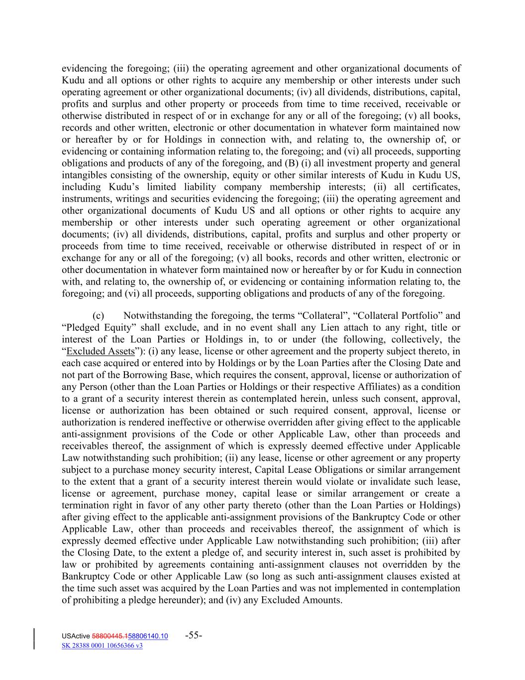 evidencing the foregoing; (iii) the operating agreement and other organizational documents of Kudu and all options or other rights to acquire any membership or other interests under such operating agreement or other organizational documents; (iv) all dividends, distributions, capital, profits and surplus and other property or proceeds from time to time received, receivable or otherwise distributed in respect of or in exchange for any or all of the foregoing; (v) all books, records and other written, electronic or other documentation in whatever form maintained now or hereafter by or for Holdings in connection with, and relating to, the ownership of, or evidencing or containing information relating to, the foregoing; and (vi) all proceeds, supporting obligations and products of any of the foregoing, and (B) (i) all investment property and general intangibles consisting of the ownership, equity or other similar interests of Kudu in Kudu US, including Kudu’s limited liability company membership interests; (ii) all certificates, instruments, writings and securities evidencing the foregoing; (iii) the operating agreement and other organizational documents of Kudu US and all options or other rights to acquire any membership or other interests under such operating agreement or other organizational documents; (iv) all dividends, distributions, capital, profits and surplus and other property or proceeds from time to time received, receivable or otherwise distributed in respect of or in exchange for any or all of the foregoing; (v) all books, records and other written, electronic or other documentation in whatever form maintained now or hereafter by or for Kudu in connection with, and relating to, the ownership of, or evidencing or containing information relating to, the foregoing; and (vi) all proceeds, supporting obligations and products of any of the foregoing. (c) Notwithstanding the foregoing, the terms “Collateral”, “Collateral Portfolio” and “Pledged Equity” shall exclude, and in no event shall any Lien attach to any right, title or interest of the Loan Parties or Holdings in, to or under (the following, collectively, the “Excluded Assets”): (i) any lease, license or other agreement and the property subject thereto, in each case acquired or entered into by Holdings or by the Loan Parties after the Closing Date and not part of the Borrowing Base, which requires the consent, approval, license or authorization of any Person (other than the Loan Parties or Holdings or their respective Affiliates) as a condition to a grant of a security interest therein as contemplated herein, unless such consent, approval, license or authorization has been obtained or such required consent, approval, license or authorization is rendered ineffective or otherwise overridden after giving effect to the applicable anti‐assignment provisions of the Code or other Applicable Law, other than proceeds and receivables thereof, the assignment of which is expressly deemed effective under Applicable Law notwithstanding such prohibition; (ii) any lease, license or other agreement or any property subject to a purchase money security interest, Capital Lease Obligations or similar arrangement to the extent that a grant of a security interest therein would violate or invalidate such lease, license or agreement, purchase money, capital lease or similar arrangement or create a termination right in favor of any other party thereto (other than the Loan Parties or Holdings) after giving effect to the applicable anti‐assignment provisions of the Bankruptcy Code or other Applicable Law, other than proceeds and receivables thereof, the assignment of which is expressly deemed effective under Applicable Law notwithstanding such prohibition; (iii) after the Closing Date, to the extent a pledge of, and security interest in, such asset is prohibited by law or prohibited by agreements containing anti‐assignment clauses not overridden by the Bankruptcy Code or other Applicable Law (so long as such anti‐assignment clauses existed at the time such asset was acquired by the Loan Parties and was not implemented in contemplation of prohibiting a pledge hereunder); and (iv) any Excluded Amounts. USActive 58800445.158806140.10 -55- SK 28388 0001 10656366 v3