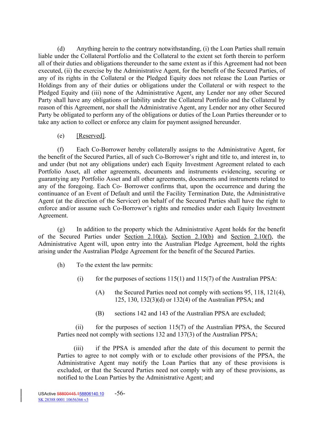(d) Anything herein to the contrary notwithstanding, (i) the Loan Parties shall remain liable under the Collateral Portfolio and the Collateral to the extent set forth therein to perform all of their duties and obligations thereunder to the same extent as if this Agreement had not been executed, (ii) the exercise by the Administrative Agent, for the benefit of the Secured Parties, of any of its rights in the Collateral or the Pledged Equity does not release the Loan Parties or Holdings from any of their duties or obligations under the Collateral or with respect to the Pledged Equity and (iii) none of the Administrative Agent, any Lender nor any other Secured Party shall have any obligations or liability under the Collateral Portfolio and the Collateral by reason of this Agreement, nor shall the Administrative Agent, any Lender nor any other Secured Party be obligated to perform any of the obligations or duties of the Loan Parties thereunder or to take any action to collect or enforce any claim for payment assigned hereunder. (e) [Reserved]. (f) Each Co‐Borrower hereby collaterally assigns to the Administrative Agent, for the benefit of the Secured Parties, all of such Co‐Borrower’s right and title to, and interest in, to and under (but not any obligations under) each Equity Investment Agreement related to each Portfolio Asset, all other agreements, documents and instruments evidencing, securing or guarantying any Portfolio Asset and all other agreements, documents and instruments related to any of the foregoing. Each Co‐ Borrower confirms that, upon the occurrence and during the continuance of an Event of Default and until the Facility Termination Date, the Administrative Agent (at the direction of the Servicer) on behalf of the Secured Parties shall have the right to enforce and/or assume such Co‐Borrower’s rights and remedies under each Equity Investment Agreement. (g) In addition to the property which the Administrative Agent holds for the benefit of the Secured Parties under Section 2.10(a), Section 2.10(b) and Section 2.10(f), the Administrative Agent will, upon entry into the Australian Pledge Agreement, hold the rights arising under the Australian Pledge Agreement for the benefit of the Secured Parties. (h) To the extent the law permits: (i) for the purposes of sections 115(1) and 115(7) of the Australian PPSA: (A) the Secured Parties need not comply with sections 95, 118, 121(4), 125, 130, 132(3)(d) or 132(4) of the Australian PPSA; and (B) sections 142 and 143 of the Australian PPSA are excluded; (ii) for the purposes of section 115(7) of the Australian PPSA, the Secured Parties need not comply with sections 132 and 137(3) of the Australian PPSA; (iii) if the PPSA is amended after the date of this document to permit the Parties to agree to not comply with or to exclude other provisions of the PPSA, the Administrative Agent may notify the Loan Parties that any of these provisions is excluded, or that the Secured Parties need not comply with any of these provisions, as notified to the Loan Parties by the Administrative Agent; and USActive 58800445.158806140.10 -56- SK 28388 0001 10656366 v3