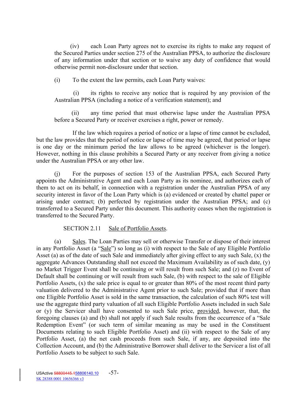(iv) each Loan Party agrees not to exercise its rights to make any request of the Secured Parties under section 275 of the Australian PPSA, to authorize the disclosure of any information under that section or to waive any duty of confidence that would otherwise permit non‐disclosure under that section. (i) To the extent the law permits, each Loan Party waives: (i) its rights to receive any notice that is required by any provision of the Australian PPSA (including a notice of a verification statement); and (ii) any time period that must otherwise lapse under the Australian PPSA before a Secured Party or receiver exercises a right, power or remedy. If the law which requires a period of notice or a lapse of time cannot be excluded, but the law provides that the period of notice or lapse of time may be agreed, that period or lapse is one day or the minimum period the law allows to be agreed (whichever is the longer). However, nothing in this clause prohibits a Secured Party or any receiver from giving a notice under the Australian PPSA or any other law. (j) For the purposes of section 153 of the Australian PPSA, each Secured Party appoints the Administrative Agent and each Loan Party as its nominee, and authorizes each of them to act on its behalf, in connection with a registration under the Australian PPSA of any security interest in favor of the Loan Party which is (a) evidenced or created by chattel paper or arising under contract; (b) perfected by registration under the Australian PPSA; and (c) transferred to a Secured Party under this document. This authority ceases when the registration is transferred to the Secured Party. SECTION 2.11 Sale of Portfolio Assets. (a) Sales. The Loan Parties may sell or otherwise Transfer or dispose of their interest in any Portfolio Asset (a “Sale”) so long as (i) with respect to the Sale of any Eligible Portfolio Asset (a) as of the date of such Sale and immediately after giving effect to any such Sale, (x) the aggregate Advances Outstanding shall not exceed the Maximum Availability as of such date, (y) no Market Trigger Event shall be continuing or will result from such Sale; and (z) no Event of Default shall be continuing or will result from such Sale, (b) with respect to the sale of Eligible Portfolio Assets, (x) the sale price is equal to or greater than 80% of the most recent third party valuation delivered to the Administrative Agent prior to such Sale; provided that if more than one Eligible Portfolio Asset is sold in the same transaction, the calculation of such 80% test will use the aggregate third party valuation of all such Eligible Portfolio Assets included in such Sale or (y) the Servicer shall have consented to such Sale price, provided, however, that, the foregoing clauses (a) and (b) shall not apply if such Sale results from the occurrence of a “Sale Redemption Event” (or such term of similar meaning as may be used in the Constituent Documents relating to such Eligible Portfolio Asset) and (ii) with respect to the Sale of any Portfolio Asset, (a) the net cash proceeds from such Sale, if any, are deposited into the Collection Account, and (b) the Administrative Borrower shall deliver to the Servicer a list of all Portfolio Assets to be subject to such Sale. USActive 58800445.158806140.10 -57- SK 28388 0001 10656366 v3