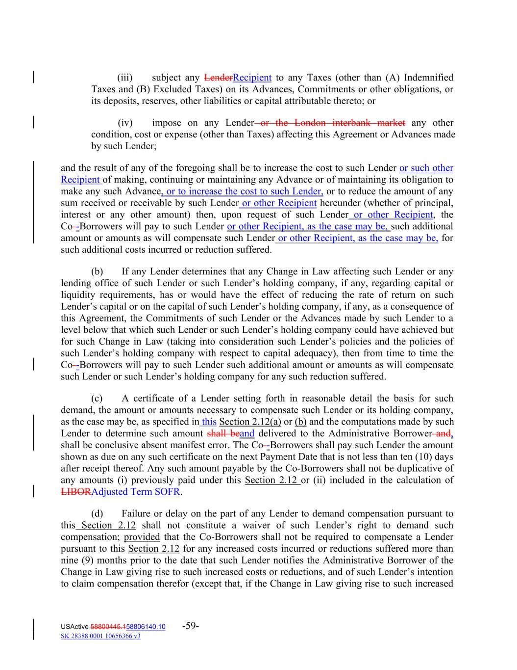(iii) subject any LenderRecipient to any Taxes (other than (A) Indemnified Taxes and (B) Excluded Taxes) on its Advances, Commitments or other obligations, or its deposits, reserves, other liabilities or capital attributable thereto; or (iv) impose on any Lender or the London interbank market any other condition, cost or expense (other than Taxes) affecting this Agreement or Advances made by such Lender; and the result of any of the foregoing shall be to increase the cost to such Lender or such other Recipient of making, continuing or maintaining any Advance or of maintaining its obligation to make any such Advance, or to increase the cost to such Lender, or to reduce the amount of any sum received or receivable by such Lender or other Recipient hereunder (whether of principal, interest or any other amount) then, upon request of such Lender or other Recipient, the Co -Borrowers will pay to such Lender or other Recipient, as the case may be, such additional amount or amounts as will compensate such Lender or other Recipient, as the case may be, for such additional costs incurred or reduction suffered. (b) If any Lender determines that any Change in Law affecting such Lender or any lending office of such Lender or such Lender’s holding company, if any, regarding capital or liquidity requirements, has or would have the effect of reducing the rate of return on such Lender’s capital or on the capital of such Lender’s holding company, if any, as a consequence of this Agreement, the Commitments of such Lender or the Advances made by such Lender to a level below that which such Lender or such Lender’s holding company could have achieved but for such Change in Law (taking into consideration such Lender’s policies and the policies of such Lender’s holding company with respect to capital adequacy), then from time to time the Co -Borrowers will pay to such Lender such additional amount or amounts as will compensate such Lender or such Lender’s holding company for any such reduction suffered. (c) A certificate of a Lender setting forth in reasonable detail the basis for such demand, the amount or amounts necessary to compensate such Lender or its holding company, as the case may be, as specified in this Section 2.12(a) or (b) and the computations made by such Lender to determine such amount shall beand delivered to the Administrative Borrower and, shall be conclusive absent manifest error. The Co -Borrowers shall pay such Lender the amount shown as due on any such certificate on the next Payment Date that is not less than ten (10) days after receipt thereof. Any such amount payable by the Co‐Borrowers shall not be duplicative of any amounts (i) previously paid under this Section 2.12 or (ii) included in the calculation of LIBORAdjusted Term SOFR. (d) Failure or delay on the part of any Lender to demand compensation pursuant to this Section 2.12 shall not constitute a waiver of such Lender’s right to demand such compensation; provided that the Co‐Borrowers shall not be required to compensate a Lender pursuant to this Section 2.12 for any increased costs incurred or reductions suffered more than nine (9) months prior to the date that such Lender notifies the Administrative Borrower of the Change in Law giving rise to such increased costs or reductions, and of such Lender’s intention to claim compensation therefor (except that, if the Change in Law giving rise to such increased USActive 58800445.158806140.10 -59- SK 28388 0001 10656366 v3