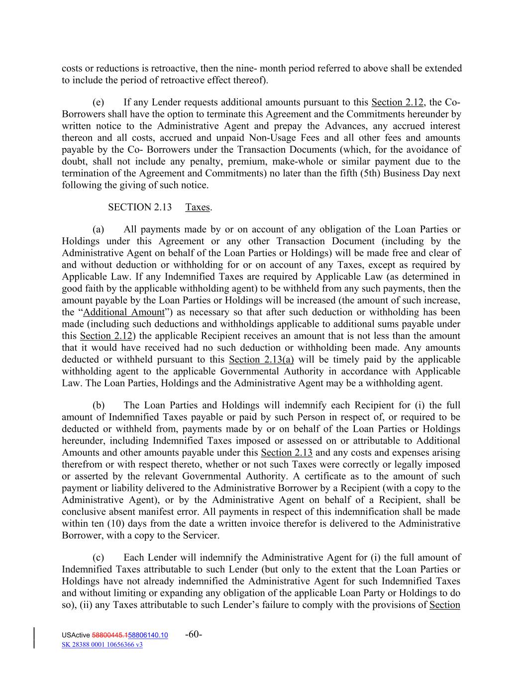 costs or reductions is retroactive, then the nine‐ month period referred to above shall be extended to include the period of retroactive effect thereof). (e) If any Lender requests additional amounts pursuant to this Section 2.12, the Co‐ Borrowers shall have the option to terminate this Agreement and the Commitments hereunder by written notice to the Administrative Agent and prepay the Advances, any accrued interest thereon and all costs, accrued and unpaid Non‐Usage Fees and all other fees and amounts payable by the Co‐ Borrowers under the Transaction Documents (which, for the avoidance of doubt, shall not include any penalty, premium, make‐whole or similar payment due to the termination of the Agreement and Commitments) no later than the fifth (5th) Business Day next following the giving of such notice. SECTION 2.13 Taxes. (a) All payments made by or on account of any obligation of the Loan Parties or Holdings under this Agreement or any other Transaction Document (including by the Administrative Agent on behalf of the Loan Parties or Holdings) will be made free and clear of and without deduction or withholding for or on account of any Taxes, except as required by Applicable Law. If any Indemnified Taxes are required by Applicable Law (as determined in good faith by the applicable withholding agent) to be withheld from any such payments, then the amount payable by the Loan Parties or Holdings will be increased (the amount of such increase, the “Additional Amount”) as necessary so that after such deduction or withholding has been made (including such deductions and withholdings applicable to additional sums payable under this Section 2.12) the applicable Recipient receives an amount that is not less than the amount that it would have received had no such deduction or withholding been made. Any amounts deducted or withheld pursuant to this Section 2.13(a) will be timely paid by the applicable withholding agent to the applicable Governmental Authority in accordance with Applicable Law. The Loan Parties, Holdings and the Administrative Agent may be a withholding agent. (b) The Loan Parties and Holdings will indemnify each Recipient for (i) the full amount of Indemnified Taxes payable or paid by such Person in respect of, or required to be deducted or withheld from, payments made by or on behalf of the Loan Parties or Holdings hereunder, including Indemnified Taxes imposed or assessed on or attributable to Additional Amounts and other amounts payable under this Section 2.13 and any costs and expenses arising therefrom or with respect thereto, whether or not such Taxes were correctly or legally imposed or asserted by the relevant Governmental Authority. A certificate as to the amount of such payment or liability delivered to the Administrative Borrower by a Recipient (with a copy to the Administrative Agent), or by the Administrative Agent on behalf of a Recipient, shall be conclusive absent manifest error. All payments in respect of this indemnification shall be made within ten (10) days from the date a written invoice therefor is delivered to the Administrative Borrower, with a copy to the Servicer. (c) Each Lender will indemnify the Administrative Agent for (i) the full amount of Indemnified Taxes attributable to such Lender (but only to the extent that the Loan Parties or Holdings have not already indemnified the Administrative Agent for such Indemnified Taxes and without limiting or expanding any obligation of the applicable Loan Party or Holdings to do so), (ii) any Taxes attributable to such Lender’s failure to comply with the provisions of Section USActive 58800445.158806140.10 -60- SK 28388 0001 10656366 v3