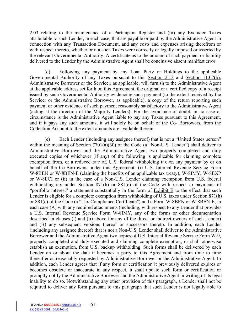 2.03 relating to the maintenance of a Participant Register and (iii) any Excluded Taxes attributable to such Lender, in each case, that are payable or paid by the Administrative Agent in connection with any Transaction Document, and any costs and expenses arising therefrom or with respect thereto, whether or not such Taxes were correctly or legally imposed or asserted by the relevant Governmental Authority. A certificate as to the amount of such payment or liability delivered to the Lender by the Administrative Agent shall be conclusive absent manifest error. (d) Following any payment by any Loan Party or Holdings to the applicable Governmental Authority of any Taxes pursuant to this Section 2.13 and Section 11.07(b), Administrative Borrower or the Servicer, as applicable, will furnish to the Administrative Agent at the applicable address set forth on this Agreement, the original or a certified copy of a receipt issued by such Governmental Authority evidencing such payment (to the extent received by the Servicer or the Administrative Borrower, as applicable), a copy of the return reporting such payment or other evidence of such payment reasonably satisfactory to the Administrative Agent (acting at the direction of the Majority Lenders). For the avoidance of doubt, in no case or circumstance is the Administrative Agent liable to pay any Taxes pursuant to this Agreement, and if it pays any such amounts, it will solely be on behalf of the Co‐ Borrowers, from the Collection Account to the extent amounts are available therein. (e) Each Lender (including any assignee thereof) that is not a “United States person” within the meaning of Section 7701(a)(30) of the Code (a “Non‐U.S. Lender”) shall deliver to Administrative Borrower and the Administrative Agent two properly completed and duly executed copies of whichever (if any) of the following is applicable for claiming complete exemption from, or a reduced rate of, U.S. federal withholding tax on any payment by or on behalf of the Co‐Borrowers under this Agreement: (i) U.S. Internal Revenue Service Form W‐8BEN or W‐8BEN‐E (claiming the benefits of an applicable tax treaty), W‐8IMY, W‐8EXP or W‐8ECI or (ii) in the case of a Non‐U.S. Lender claiming exemption from U.S. federal withholding tax under Section 871(h) or 881(c) of the Code with respect to payments of “portfolio interest” a statement substantially in the form of Exhibit E to the effect that such Lender is eligible for a complete exemption from withholding of U.S. taxes under Section 871(h) or 881(c) of the Code (a “Tax Compliance Certificate”) and a Form W‐8BEN or W‐8BEN‐E, in each case (A) with any required attachments (including, with respect to any Lender that provides a U.S. Internal Revenue Service Form W‐8IMY, any of the forms or other documentation described in clauses (i) and (ii) above for any of the direct or indirect owners of such Lender) and (B) any subsequent versions thereof or successors thereto. In addition, each Lender (including any assignee thereof) that is not a Non‐U.S. Lender shall deliver to the Administrative Borrower and the Administrative Agent two copies of U.S. Internal Revenue Service Form W‐9, properly completed and duly executed and claiming complete exemption, or shall otherwise establish an exemption, from U.S. backup withholding. Such forms shall be delivered by each Lender on or about the date it becomes a party to this Agreement and from time to time thereafter as reasonably requested by Administrative Borrower or the Administrative Agent. In addition, each Lender agrees that if any form or certification it previously delivered expires or becomes obsolete or inaccurate in any respect, it shall update such form or certification or promptly notify the Administrative Borrower and the Administrative Agent in writing of its legal inability to do so. Notwithstanding any other provision of this paragraph, a Lender shall not be required to deliver any form pursuant to this paragraph that such Lender is not legally able to USActive 58800445.158806140.10 -61- SK 28388 0001 10656366 v3