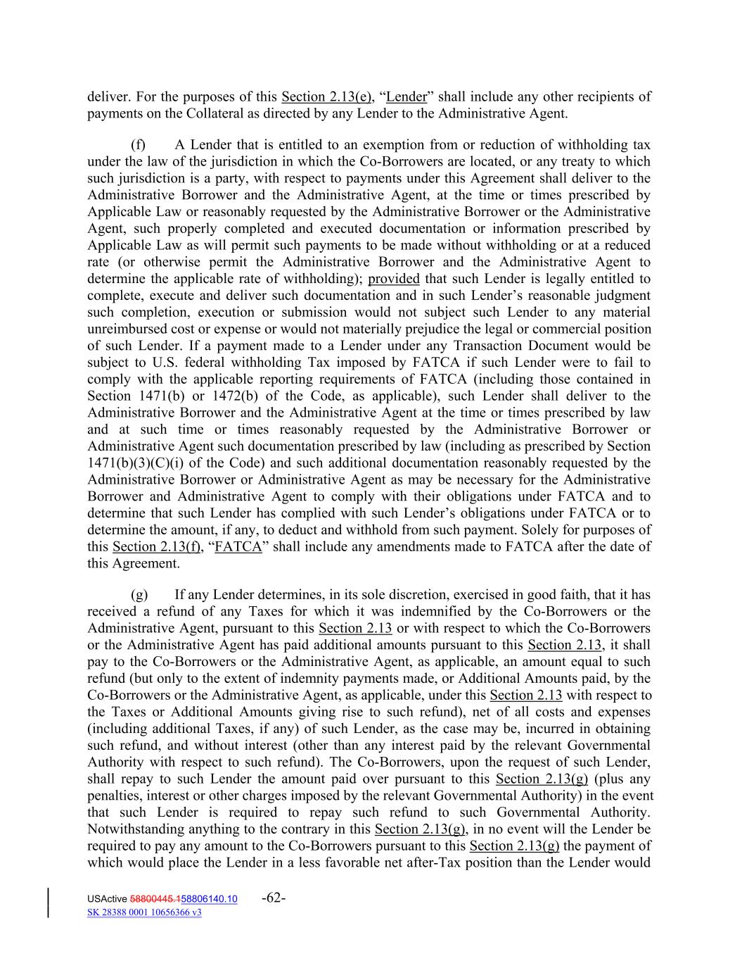 deliver. For the purposes of this Section 2.13(e), “Lender” shall include any other recipients of payments on the Collateral as directed by any Lender to the Administrative Agent. (f) A Lender that is entitled to an exemption from or reduction of withholding tax under the law of the jurisdiction in which the Co‐Borrowers are located, or any treaty to which such jurisdiction is a party, with respect to payments under this Agreement shall deliver to the Administrative Borrower and the Administrative Agent, at the time or times prescribed by Applicable Law or reasonably requested by the Administrative Borrower or the Administrative Agent, such properly completed and executed documentation or information prescribed by Applicable Law as will permit such payments to be made without withholding or at a reduced rate (or otherwise permit the Administrative Borrower and the Administrative Agent to determine the applicable rate of withholding); provided that such Lender is legally entitled to complete, execute and deliver such documentation and in such Lender’s reasonable judgment such completion, execution or submission would not subject such Lender to any material unreimbursed cost or expense or would not materially prejudice the legal or commercial position of such Lender. If a payment made to a Lender under any Transaction Document would be subject to U.S. federal withholding Tax imposed by FATCA if such Lender were to fail to comply with the applicable reporting requirements of FATCA (including those contained in Section 1471(b) or 1472(b) of the Code, as applicable), such Lender shall deliver to the Administrative Borrower and the Administrative Agent at the time or times prescribed by law and at such time or times reasonably requested by the Administrative Borrower or Administrative Agent such documentation prescribed by law (including as prescribed by Section 1471(b)(3)(C)(i) of the Code) and such additional documentation reasonably requested by the Administrative Borrower or Administrative Agent as may be necessary for the Administrative Borrower and Administrative Agent to comply with their obligations under FATCA and to determine that such Lender has complied with such Lender’s obligations under FATCA or to determine the amount, if any, to deduct and withhold from such payment. Solely for purposes of this Section 2.13(f), “FATCA” shall include any amendments made to FATCA after the date of this Agreement. (g) If any Lender determines, in its sole discretion, exercised in good faith, that it has received a refund of any Taxes for which it was indemnified by the Co‐Borrowers or the Administrative Agent, pursuant to this Section 2.13 or with respect to which the Co‐Borrowers or the Administrative Agent has paid additional amounts pursuant to this Section 2.13, it shall pay to the Co‐Borrowers or the Administrative Agent, as applicable, an amount equal to such refund (but only to the extent of indemnity payments made, or Additional Amounts paid, by the Co‐Borrowers or the Administrative Agent, as applicable, under this Section 2.13 with respect to the Taxes or Additional Amounts giving rise to such refund), net of all costs and expenses (including additional Taxes, if any) of such Lender, as the case may be, incurred in obtaining such refund, and without interest (other than any interest paid by the relevant Governmental Authority with respect to such refund). The Co‐Borrowers, upon the request of such Lender, shall repay to such Lender the amount paid over pursuant to this Section 2.13(g) (plus any penalties, interest or other charges imposed by the relevant Governmental Authority) in the event that such Lender is required to repay such refund to such Governmental Authority. Notwithstanding anything to the contrary in this Section 2.13(g), in no event will the Lender be required to pay any amount to the Co‐Borrowers pursuant to this Section 2.13(g) the payment of which would place the Lender in a less favorable net after‐Tax position than the Lender would USActive 58800445.158806140.10 -62- SK 28388 0001 10656366 v3