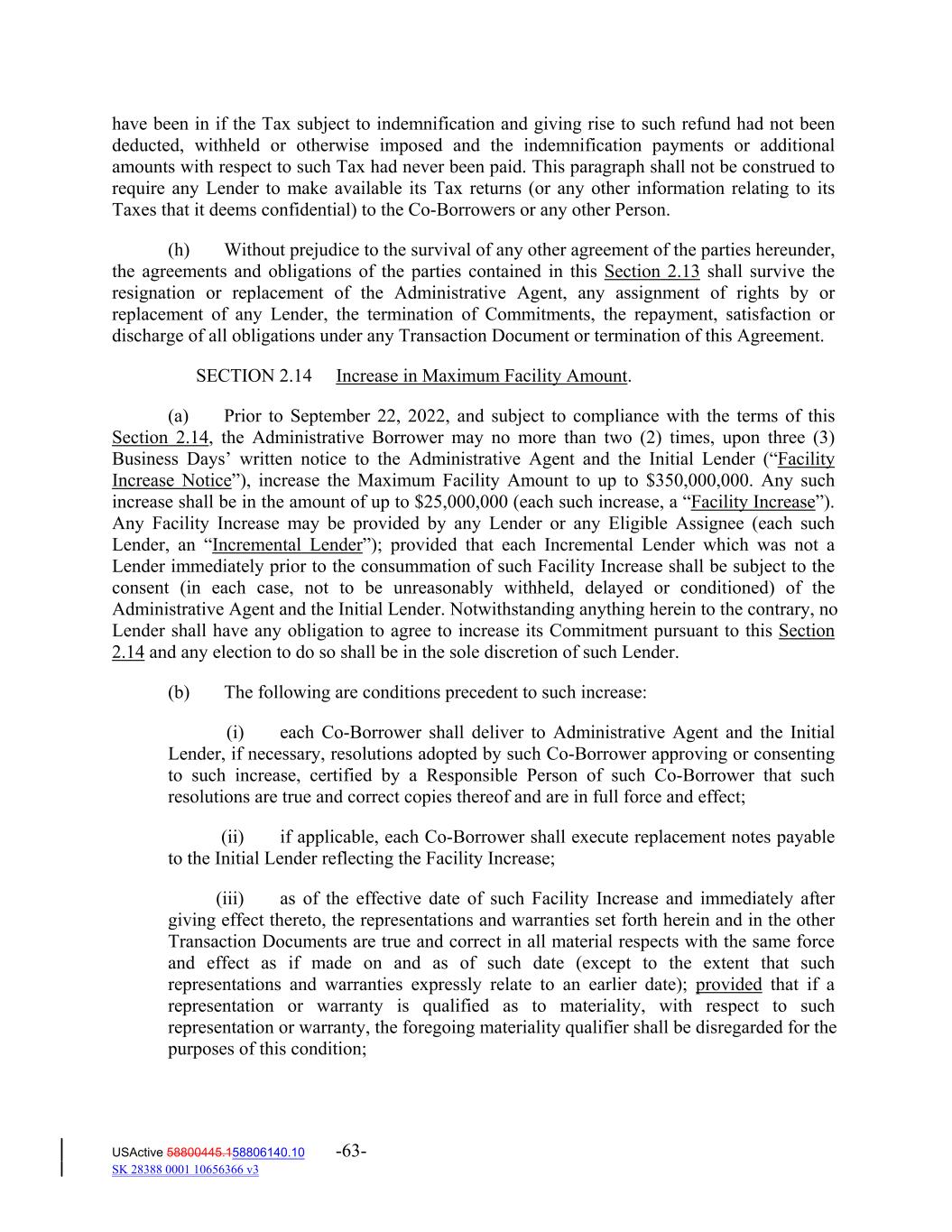 have been in if the Tax subject to indemnification and giving rise to such refund had not been deducted, withheld or otherwise imposed and the indemnification payments or additional amounts with respect to such Tax had never been paid. This paragraph shall not be construed to require any Lender to make available its Tax returns (or any other information relating to its Taxes that it deems confidential) to the Co‐Borrowers or any other Person. (h) Without prejudice to the survival of any other agreement of the parties hereunder, the agreements and obligations of the parties contained in this Section 2.13 shall survive the resignation or replacement of the Administrative Agent, any assignment of rights by or replacement of any Lender, the termination of Commitments, the repayment, satisfaction or discharge of all obligations under any Transaction Document or termination of this Agreement. SECTION 2.14 Increase in Maximum Facility Amount. (a) Prior to September 22, 2022, and subject to compliance with the terms of this Section 2.14, the Administrative Borrower may no more than two (2) times, upon three (3) Business Days’ written notice to the Administrative Agent and the Initial Lender (“Facility Increase Notice”), increase the Maximum Facility Amount to up to $350,000,000. Any such increase shall be in the amount of up to $25,000,000 (each such increase, a “Facility Increase”). Any Facility Increase may be provided by any Lender or any Eligible Assignee (each such Lender, an “Incremental Lender”); provided that each Incremental Lender which was not a Lender immediately prior to the consummation of such Facility Increase shall be subject to the consent (in each case, not to be unreasonably withheld, delayed or conditioned) of the Administrative Agent and the Initial Lender. Notwithstanding anything herein to the contrary, no Lender shall have any obligation to agree to increase its Commitment pursuant to this Section 2.14 and any election to do so shall be in the sole discretion of such Lender. (b) The following are conditions precedent to such increase: (i) each Co‐Borrower shall deliver to Administrative Agent and the Initial Lender, if necessary, resolutions adopted by such Co‐Borrower approving or consenting to such increase, certified by a Responsible Person of such Co‐Borrower that such resolutions are true and correct copies thereof and are in full force and effect; (ii) if applicable, each Co‐Borrower shall execute replacement notes payable to the Initial Lender reflecting the Facility Increase; (iii) as of the effective date of such Facility Increase and immediately after giving effect thereto, the representations and warranties set forth herein and in the other Transaction Documents are true and correct in all material respects with the same force and effect as if made on and as of such date (except to the extent that such representations and warranties expressly relate to an earlier date); provided that if a representation or warranty is qualified as to materiality, with respect to such representation or warranty, the foregoing materiality qualifier shall be disregarded for the purposes of this condition; USActive 58800445.158806140.10 -63- SK 28388 0001 10656366 v3