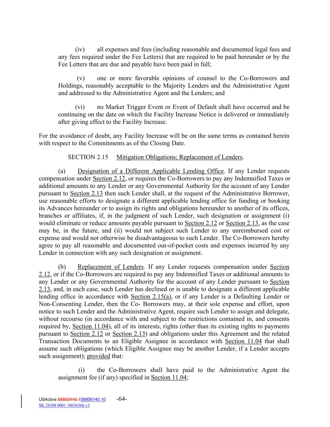 (iv) all expenses and fees (including reasonable and documented legal fees and any fees required under the Fee Letters) that are required to be paid hereunder or by the Fee Letters that are due and payable have been paid in full; (v) one or more favorable opinions of counsel to the Co‐Borrowers and Holdings, reasonably acceptable to the Majority Lenders and the Administrative Agent and addressed to the Administrative Agent and the Lenders; and (vi) no Market Trigger Event or Event of Default shall have occurred and be continuing on the date on which the Facility Increase Notice is delivered or immediately after giving effect to the Facility Increase. For the avoidance of doubt, any Facility Increase will be on the same terms as contained herein with respect to the Commitments as of the Closing Date. SECTION 2.15 Mitigation Obligations; Replacement of Lenders. (a) Designation of a Different Applicable Lending Office. If any Lender requests compensation under Section 2.12, or requires the Co‐Borrowers to pay any Indemnified Taxes or additional amounts to any Lender or any Governmental Authority for the account of any Lender pursuant to Section 2.13 then such Lender shall, at the request of the Administrative Borrower, use reasonable efforts to designate a different applicable lending office for funding or booking its Advances hereunder or to assign its rights and obligations hereunder to another of its offices, branches or affiliates, if, in the judgment of such Lender, such designation or assignment (i) would eliminate or reduce amounts payable pursuant to Section 2.12 or Section 2.13, as the case may be, in the future, and (ii) would not subject such Lender to any unreimbursed cost or expense and would not otherwise be disadvantageous to such Lender. The Co‐Borrowers hereby agree to pay all reasonable and documented out‐of‐pocket costs and expenses incurred by any Lender in connection with any such designation or assignment. (b) Replacement of Lenders. If any Lender requests compensation under Section 2.12, or if the Co‐Borrowers are required to pay any Indemnified Taxes or additional amounts to any Lender or any Governmental Authority for the account of any Lender pursuant to Section 2.13, and, in each case, such Lender has declined or is unable to designate a different applicable lending office in accordance with Section 2.15(a), or if any Lender is a Defaulting Lender or Non‐Consenting Lender, then the Co‐ Borrowers may, at their sole expense and effort, upon notice to such Lender and the Administrative Agent, require such Lender to assign and delegate, without recourse (in accordance with and subject to the restrictions contained in, and consents required by, Section 11.04), all of its interests, rights (other than its existing rights to payments pursuant to Section 2.12 or Section 2.13) and obligations under this Agreement and the related Transaction Documents to an Eligible Assignee in accordance with Section 11.04 that shall assume such obligations (which Eligible Assignee may be another Lender, if a Lender accepts such assignment); provided that: (i) the Co‐Borrowers shall have paid to the Administrative Agent the assignment fee (if any) specified in Section 11.04; USActive 58800445.158806140.10 -64- SK 28388 0001 10656366 v3
