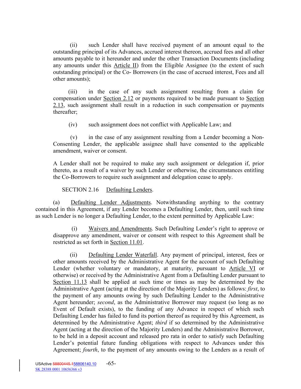 (ii) such Lender shall have received payment of an amount equal to the outstanding principal of its Advances, accrued interest thereon, accrued fees and all other amounts payable to it hereunder and under the other Transaction Documents (including any amounts under this Article II) from the Eligible Assignee (to the extent of such outstanding principal) or the Co‐ Borrowers (in the case of accrued interest, Fees and all other amounts); (iii) in the case of any such assignment resulting from a claim for compensation under Section 2.12 or payments required to be made pursuant to Section 2.13, such assignment shall result in a reduction in such compensation or payments thereafter; (iv) such assignment does not conflict with Applicable Law; and (v) in the case of any assignment resulting from a Lender becoming a Non‐ Consenting Lender, the applicable assignee shall have consented to the applicable amendment, waiver or consent. A Lender shall not be required to make any such assignment or delegation if, prior thereto, as a result of a waiver by such Lender or otherwise, the circumstances entitling the Co‐Borrowers to require such assignment and delegation cease to apply. SECTION 2.16 Defaulting Lenders. (a) Defaulting Lender Adjustments. Notwithstanding anything to the contrary contained in this Agreement, if any Lender becomes a Defaulting Lender, then, until such time as such Lender is no longer a Defaulting Lender, to the extent permitted by Applicable Law: (i) Waivers and Amendments. Such Defaulting Lender’s right to approve or disapprove any amendment, waiver or consent with respect to this Agreement shall be restricted as set forth in Section 11.01. (ii) Defaulting Lender Waterfall. Any payment of principal, interest, fees or other amounts received by the Administrative Agent for the account of such Defaulting Lender (whether voluntary or mandatory, at maturity, pursuant to Article VI or otherwise) or received by the Administrative Agent from a Defaulting Lender pursuant to Section 11.13 shall be applied at such time or times as may be determined by the Administrative Agent (acting at the direction of the Majority Lenders) as follows: first, to the payment of any amounts owing by such Defaulting Lender to the Administrative Agent hereunder; second, as the Administrative Borrower may request (so long as no Event of Default exists), to the funding of any Advance in respect of which such Defaulting Lender has failed to fund its portion thereof as required by this Agreement, as determined by the Administrative Agent; third if so determined by the Administrative Agent (acting at the direction of the Majority Lenders) and the Administrative Borrower, to be held in a deposit account and released pro rata in order to satisfy such Defaulting Lender’s potential future funding obligations with respect to Advances under this Agreement; fourth, to the payment of any amounts owing to the Lenders as a result of USActive 58800445.158806140.10 -65- SK 28388 0001 10656366 v3