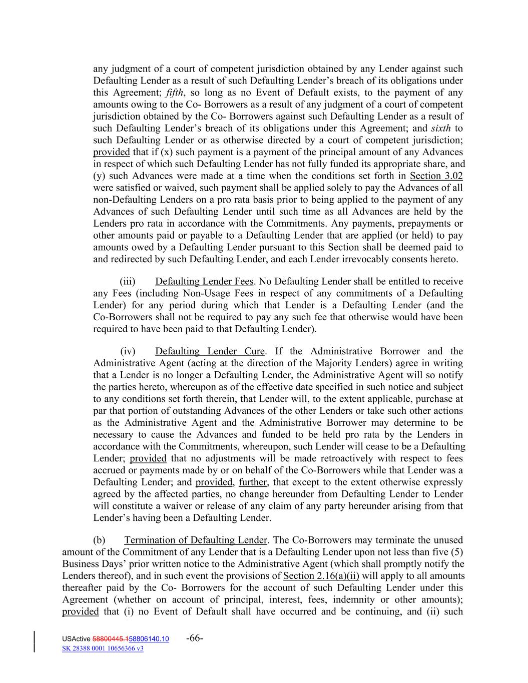 any judgment of a court of competent jurisdiction obtained by any Lender against such Defaulting Lender as a result of such Defaulting Lender’s breach of its obligations under this Agreement; fifth, so long as no Event of Default exists, to the payment of any amounts owing to the Co‐ Borrowers as a result of any judgment of a court of competent jurisdiction obtained by the Co‐ Borrowers against such Defaulting Lender as a result of such Defaulting Lender’s breach of its obligations under this Agreement; and sixth to such Defaulting Lender or as otherwise directed by a court of competent jurisdiction; provided that if (x) such payment is a payment of the principal amount of any Advances in respect of which such Defaulting Lender has not fully funded its appropriate share, and (y) such Advances were made at a time when the conditions set forth in Section 3.02 were satisfied or waived, such payment shall be applied solely to pay the Advances of all non‐Defaulting Lenders on a pro rata basis prior to being applied to the payment of any Advances of such Defaulting Lender until such time as all Advances are held by the Lenders pro rata in accordance with the Commitments. Any payments, prepayments or other amounts paid or payable to a Defaulting Lender that are applied (or held) to pay amounts owed by a Defaulting Lender pursuant to this Section shall be deemed paid to and redirected by such Defaulting Lender, and each Lender irrevocably consents hereto. (iii) Defaulting Lender Fees. No Defaulting Lender shall be entitled to receive any Fees (including Non‐Usage Fees in respect of any commitments of a Defaulting Lender) for any period during which that Lender is a Defaulting Lender (and the Co‐Borrowers shall not be required to pay any such fee that otherwise would have been required to have been paid to that Defaulting Lender). (iv) Defaulting Lender Cure. If the Administrative Borrower and the Administrative Agent (acting at the direction of the Majority Lenders) agree in writing that a Lender is no longer a Defaulting Lender, the Administrative Agent will so notify the parties hereto, whereupon as of the effective date specified in such notice and subject to any conditions set forth therein, that Lender will, to the extent applicable, purchase at par that portion of outstanding Advances of the other Lenders or take such other actions as the Administrative Agent and the Administrative Borrower may determine to be necessary to cause the Advances and funded to be held pro rata by the Lenders in accordance with the Commitments, whereupon, such Lender will cease to be a Defaulting Lender; provided that no adjustments will be made retroactively with respect to fees accrued or payments made by or on behalf of the Co‐Borrowers while that Lender was a Defaulting Lender; and provided, further, that except to the extent otherwise expressly agreed by the affected parties, no change hereunder from Defaulting Lender to Lender will constitute a waiver or release of any claim of any party hereunder arising from that Lender’s having been a Defaulting Lender. (b) Termination of Defaulting Lender. The Co‐Borrowers may terminate the unused amount of the Commitment of any Lender that is a Defaulting Lender upon not less than five (5) Business Days’ prior written notice to the Administrative Agent (which shall promptly notify the Lenders thereof), and in such event the provisions of Section 2.16(a)(ii) will apply to all amounts thereafter paid by the Co‐ Borrowers for the account of such Defaulting Lender under this Agreement (whether on account of principal, interest, fees, indemnity or other amounts); provided that (i) no Event of Default shall have occurred and be continuing, and (ii) such USActive 58800445.158806140.10 -66- SK 28388 0001 10656366 v3