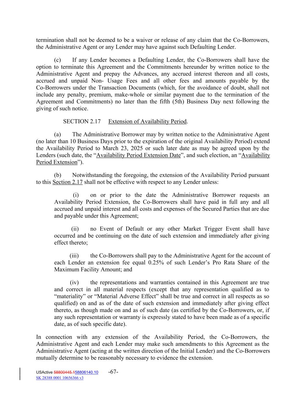 termination shall not be deemed to be a waiver or release of any claim that the Co‐Borrowers, the Administrative Agent or any Lender may have against such Defaulting Lender. (c) If any Lender becomes a Defaulting Lender, the Co‐Borrowers shall have the option to terminate this Agreement and the Commitments hereunder by written notice to the Administrative Agent and prepay the Advances, any accrued interest thereon and all costs, accrued and unpaid Non‐ Usage Fees and all other fees and amounts payable by the Co‐Borrowers under the Transaction Documents (which, for the avoidance of doubt, shall not include any penalty, premium, make‐whole or similar payment due to the termination of the Agreement and Commitments) no later than the fifth (5th) Business Day next following the giving of such notice. SECTION 2.17 Extension of Availability Period. (a) The Administrative Borrower may by written notice to the Administrative Agent (no later than 10 Business Days prior to the expiration of the original Availability Period) extend the Availability Period to March 23, 2025 or such later date as may be agreed upon by the Lenders (such date, the “Availability Period Extension Date”, and such election, an “Availability Period Extension”). (b) Notwithstanding the foregoing, the extension of the Availability Period pursuant to this Section 2.17 shall not be effective with respect to any Lender unless: (i) on or prior to the date the Administrative Borrower requests an Availability Period Extension, the Co‐Borrowers shall have paid in full any and all accrued and unpaid interest and all costs and expenses of the Secured Parties that are due and payable under this Agreement; (ii) no Event of Default or any other Market Trigger Event shall have occurred and be continuing on the date of such extension and immediately after giving effect thereto; (iii) the Co‐Borrowers shall pay to the Administrative Agent for the account of each Lender an extension fee equal 0.25% of such Lender’s Pro Rata Share of the Maximum Facility Amount; and (iv) the representations and warranties contained in this Agreement are true and correct in all material respects (except that any representation qualified as to “materiality” or “Material Adverse Effect” shall be true and correct in all respects as so qualified) on and as of the date of such extension and immediately after giving effect thereto, as though made on and as of such date (as certified by the Co‐Borrowers, or, if any such representation or warranty is expressly stated to have been made as of a specific date, as of such specific date). In connection with any extension of the Availability Period, the Co‐Borrowers, the Administrative Agent and each Lender may make such amendments to this Agreement as the Administrative Agent (acting at the written direction of the Initial Lender) and the Co‐Borrowers mutually determine to be reasonably necessary to evidence the extension. USActive 58800445.158806140.10 -67- SK 28388 0001 10656366 v3