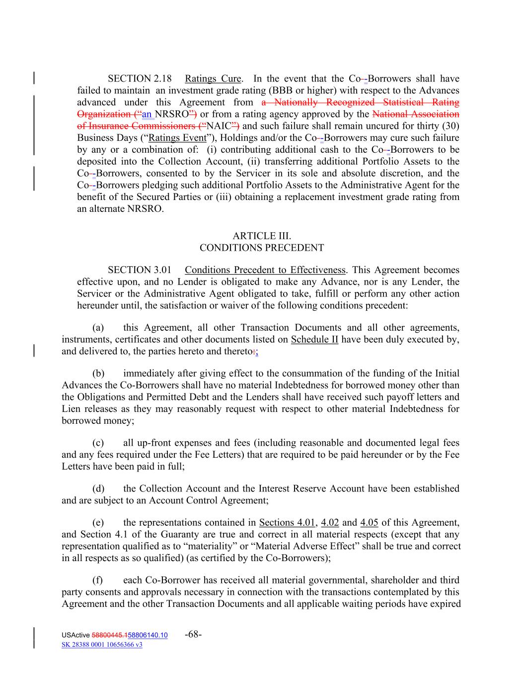 SECTION 2.18 Ratings Cure. In the event that the Co -Borrowers shall have failed to maintain an investment grade rating (BBB or higher) with respect to the Advances advanced under this Agreement from a Nationally Recognized Statistical Rating Organization (“an NRSRO”) or from a rating agency approved by the National Association of Insurance Commissioners (“NAIC”) and such failure shall remain uncured for thirty (30) Business Days (“Ratings Event”), Holdings and/or the Co -Borrowers may cure such failure by any or a combination of: (i) contributing additional cash to the Co -Borrowers to be deposited into the Collection Account, (ii) transferring additional Portfolio Assets to the Co -Borrowers, consented to by the Servicer in its sole and absolute discretion, and the Co -Borrowers pledging such additional Portfolio Assets to the Administrative Agent for the benefit of the Secured Parties or (iii) obtaining a replacement investment grade rating from an alternate NRSRO. ARTICLE III. CONDITIONS PRECEDENT SECTION 3.01 Conditions Precedent to Effectiveness. This Agreement becomes effective upon, and no Lender is obligated to make any Advance, nor is any Lender, the Servicer or the Administrative Agent obligated to take, fulfill or perform any other action hereunder until, the satisfaction or waiver of the following conditions precedent: (a) this Agreement, all other Transaction Documents and all other agreements, instruments, certificates and other documents listed on Schedule II have been duly executed by, and delivered to, the parties hereto and thereto:; (b) immediately after giving effect to the consummation of the funding of the Initial Advances the Co‐Borrowers shall have no material Indebtedness for borrowed money other than the Obligations and Permitted Debt and the Lenders shall have received such payoff letters and Lien releases as they may reasonably request with respect to other material Indebtedness for borrowed money; (c) all up‐front expenses and fees (including reasonable and documented legal fees and any fees required under the Fee Letters) that are required to be paid hereunder or by the Fee Letters have been paid in full; (d) the Collection Account and the Interest Reserve Account have been established and are subject to an Account Control Agreement; (e) the representations contained in Sections 4.01, 4.02 and 4.05 of this Agreement, and Section 4.1 of the Guaranty are true and correct in all material respects (except that any representation qualified as to “materiality” or “Material Adverse Effect” shall be true and correct in all respects as so qualified) (as certified by the Co‐Borrowers); (f) each Co‐Borrower has received all material governmental, shareholder and third party consents and approvals necessary in connection with the transactions contemplated by this Agreement and the other Transaction Documents and all applicable waiting periods have expired USActive 58800445.158806140.10 -68- SK 28388 0001 10656366 v3
