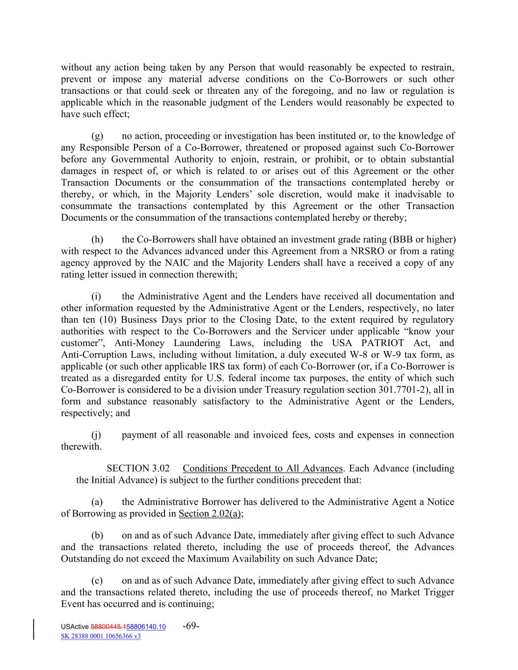 without any action being taken by any Person that would reasonably be expected to restrain, prevent or impose any material adverse conditions on the Co‐Borrowers or such other transactions or that could seek or threaten any of the foregoing, and no law or regulation is applicable which in the reasonable judgment of the Lenders would reasonably be expected to have such effect; (g) no action, proceeding or investigation has been instituted or, to the knowledge of any Responsible Person of a Co‐Borrower, threatened or proposed against such Co‐Borrower before any Governmental Authority to enjoin, restrain, or prohibit, or to obtain substantial damages in respect of, or which is related to or arises out of this Agreement or the other Transaction Documents or the consummation of the transactions contemplated hereby or thereby, or which, in the Majority Lenders’ sole discretion, would make it inadvisable to consummate the transactions contemplated by this Agreement or the other Transaction Documents or the consummation of the transactions contemplated hereby or thereby; (h) the Co‐Borrowers shall have obtained an investment grade rating (BBB or higher) with respect to the Advances advanced under this Agreement from a NRSRO or from a rating agency approved by the NAIC and the Majority Lenders shall have a received a copy of any rating letter issued in connection therewith; (i) the Administrative Agent and the Lenders have received all documentation and other information requested by the Administrative Agent or the Lenders, respectively, no later than ten (10) Business Days prior to the Closing Date, to the extent required by regulatory authorities with respect to the Co‐Borrowers and the Servicer under applicable “know your customer”, Anti‐Money Laundering Laws, including the USA PATRIOT Act, and Anti‐Corruption Laws, including without limitation, a duly executed W‐8 or W‐9 tax form, as applicable (or such other applicable IRS tax form) of each Co‐Borrower (or, if a Co‐Borrower is treated as a disregarded entity for U.S. federal income tax purposes, the entity of which such Co‐Borrower is considered to be a division under Treasury regulation section 301.7701‐2), all in form and substance reasonably satisfactory to the Administrative Agent or the Lenders, respectively; and (j) payment of all reasonable and invoiced fees, costs and expenses in connection therewith. SECTION 3.02 Conditions Precedent to All Advances. Each Advance (including the Initial Advance) is subject to the further conditions precedent that: (a) the Administrative Borrower has delivered to the Administrative Agent a Notice of Borrowing as provided in Section 2.02(a); (b) on and as of such Advance Date, immediately after giving effect to such Advance and the transactions related thereto, including the use of proceeds thereof, the Advances Outstanding do not exceed the Maximum Availability on such Advance Date; (c) on and as of such Advance Date, immediately after giving effect to such Advance and the transactions related thereto, including the use of proceeds thereof, no Market Trigger Event has occurred and is continuing; USActive 58800445.158806140.10 -69- SK 28388 0001 10656366 v3