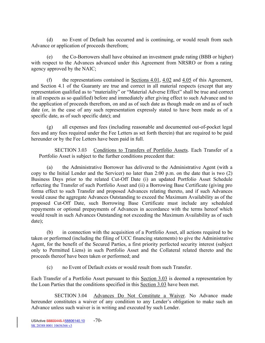 (d) no Event of Default has occurred and is continuing, or would result from such Advance or application of proceeds therefrom; (e) the Co‐Borrowers shall have obtained an investment grade rating (BBB or higher) with respect to the Advances advanced under this Agreement from NRSRO or from a rating agency approved by the NAIC; (f) the representations contained in Sections 4.01, 4.02 and 4.05 of this Agreement, and Section 4.1 of the Guaranty are true and correct in all material respects (except that any representation qualified as to “materiality” or “Material Adverse Effect” shall be true and correct in all respects as so qualified) before and immediately after giving effect to such Advance and to the application of proceeds therefrom, on and as of such date as though made on and as of such date (or, in the case of any such representation expressly stated to have been made as of a specific date, as of such specific date); and (g) all expenses and fees (including reasonable and documented out‐of‐pocket legal fees and any fees required under the Fee Letters as set forth therein) that are required to be paid hereunder or by the Fee Letters have been paid in full. SECTION 3.03 Conditions to Transfers of Portfolio Assets. Each Transfer of a Portfolio Asset is subject to the further conditions precedent that: (a) the Administrative Borrower has delivered to the Administrative Agent (with a copy to the Initial Lender and the Servicer) no later than 2:00 p.m. on the date that is two (2) Business Days prior to the related Cut‐Off Date (i) an updated Portfolio Asset Schedule reflecting the Transfer of such Portfolio Asset and (ii) a Borrowing Base Certificate (giving pro forma effect to such Transfer and proposed Advances relating thereto, and if such Advances would cause the aggregate Advances Outstanding to exceed the Maximum Availability as of the proposed Cut‐Off Date, such Borrowing Base Certificate must include any scheduled repayments or optional prepayments of Advances in accordance with the terms hereof which would result in such Advances Outstanding not exceeding the Maximum Availability as of such date); (b) in connection with the acquisition of a Portfolio Asset, all actions required to be taken or performed (including the filing of UCC financing statements) to give the Administrative Agent, for the benefit of the Secured Parties, a first priority perfected security interest (subject only to Permitted Liens) in such Portfolio Asset and the Collateral related thereto and the proceeds thereof have been taken or performed; and (c) no Event of Default exists or would result from such Transfer. Each Transfer of a Portfolio Asset pursuant to this Section 3.03 is deemed a representation by the Loan Parties that the conditions specified in this Section 3.03 have been met. SECTION 3.04 Advances Do Not Constitute a Waiver. No Advance made hereunder constitutes a waiver of any condition to any Lender’s obligation to make such an Advance unless such waiver is in writing and executed by such Lender. USActive 58800445.158806140.10 -70- SK 28388 0001 10656366 v3