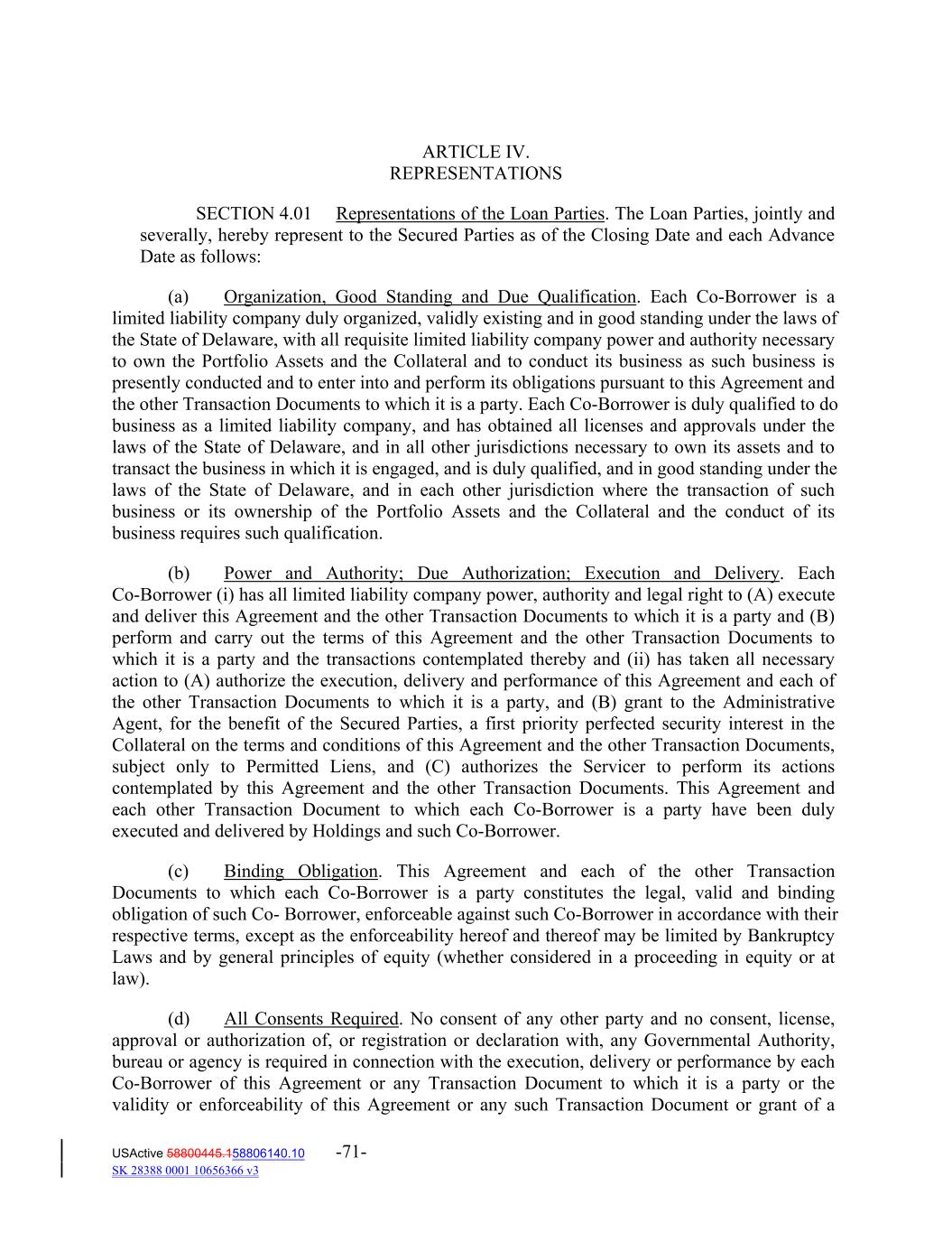 ARTICLE IV. REPRESENTATIONS SECTION 4.01 Representations of the Loan Parties. The Loan Parties, jointly and severally, hereby represent to the Secured Parties as of the Closing Date and each Advance Date as follows: (a) Organization, Good Standing and Due Qualification. Each Co‐Borrower is a limited liability company duly organized, validly existing and in good standing under the laws of the State of Delaware, with all requisite limited liability company power and authority necessary to own the Portfolio Assets and the Collateral and to conduct its business as such business is presently conducted and to enter into and perform its obligations pursuant to this Agreement and the other Transaction Documents to which it is a party. Each Co‐Borrower is duly qualified to do business as a limited liability company, and has obtained all licenses and approvals under the laws of the State of Delaware, and in all other jurisdictions necessary to own its assets and to transact the business in which it is engaged, and is duly qualified, and in good standing under the laws of the State of Delaware, and in each other jurisdiction where the transaction of such business or its ownership of the Portfolio Assets and the Collateral and the conduct of its business requires such qualification. (b) Power and Authority; Due Authorization; Execution and Delivery. Each Co‐Borrower (i) has all limited liability company power, authority and legal right to (A) execute and deliver this Agreement and the other Transaction Documents to which it is a party and (B) perform and carry out the terms of this Agreement and the other Transaction Documents to which it is a party and the transactions contemplated thereby and (ii) has taken all necessary action to (A) authorize the execution, delivery and performance of this Agreement and each of the other Transaction Documents to which it is a party, and (B) grant to the Administrative Agent, for the benefit of the Secured Parties, a first priority perfected security interest in the Collateral on the terms and conditions of this Agreement and the other Transaction Documents, subject only to Permitted Liens, and (C) authorizes the Servicer to perform its actions contemplated by this Agreement and the other Transaction Documents. This Agreement and each other Transaction Document to which each Co‐Borrower is a party have been duly executed and delivered by Holdings and such Co‐Borrower. (c) Binding Obligation. This Agreement and each of the other Transaction Documents to which each Co‐Borrower is a party constitutes the legal, valid and binding obligation of such Co‐ Borrower, enforceable against such Co‐Borrower in accordance with their respective terms, except as the enforceability hereof and thereof may be limited by Bankruptcy Laws and by general principles of equity (whether considered in a proceeding in equity or at law). (d) All Consents Required. No consent of any other party and no consent, license, approval or authorization of, or registration or declaration with, any Governmental Authority, bureau or agency is required in connection with the execution, delivery or performance by each Co‐Borrower of this Agreement or any Transaction Document to which it is a party or the validity or enforceability of this Agreement or any such Transaction Document or grant of a USActive 58800445.158806140.10 -71- SK 28388 0001 10656366 v3