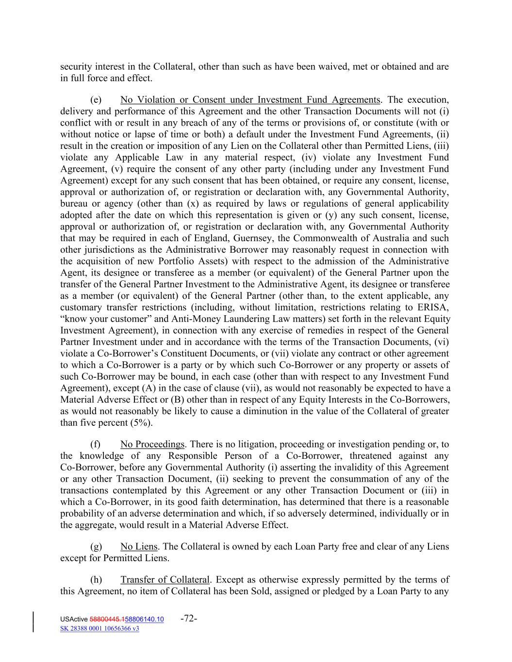 security interest in the Collateral, other than such as have been waived, met or obtained and are in full force and effect. (e) No Violation or Consent under Investment Fund Agreements. The execution, delivery and performance of this Agreement and the other Transaction Documents will not (i) conflict with or result in any breach of any of the terms or provisions of, or constitute (with or without notice or lapse of time or both) a default under the Investment Fund Agreements, (ii) result in the creation or imposition of any Lien on the Collateral other than Permitted Liens, (iii) violate any Applicable Law in any material respect, (iv) violate any Investment Fund Agreement, (v) require the consent of any other party (including under any Investment Fund Agreement) except for any such consent that has been obtained, or require any consent, license, approval or authorization of, or registration or declaration with, any Governmental Authority, bureau or agency (other than (x) as required by laws or regulations of general applicability adopted after the date on which this representation is given or (y) any such consent, license, approval or authorization of, or registration or declaration with, any Governmental Authority that may be required in each of England, Guernsey, the Commonwealth of Australia and such other jurisdictions as the Administrative Borrower may reasonably request in connection with the acquisition of new Portfolio Assets) with respect to the admission of the Administrative Agent, its designee or transferee as a member (or equivalent) of the General Partner upon the transfer of the General Partner Investment to the Administrative Agent, its designee or transferee as a member (or equivalent) of the General Partner (other than, to the extent applicable, any customary transfer restrictions (including, without limitation, restrictions relating to ERISA, “know your customer” and Anti‐Money Laundering Law matters) set forth in the relevant Equity Investment Agreement), in connection with any exercise of remedies in respect of the General Partner Investment under and in accordance with the terms of the Transaction Documents, (vi) violate a Co‐Borrower’s Constituent Documents, or (vii) violate any contract or other agreement to which a Co‐Borrower is a party or by which such Co‐Borrower or any property or assets of such Co‐Borrower may be bound, in each case (other than with respect to any Investment Fund Agreement), except (A) in the case of clause (vii), as would not reasonably be expected to have a Material Adverse Effect or (B) other than in respect of any Equity Interests in the Co‐Borrowers, as would not reasonably be likely to cause a diminution in the value of the Collateral of greater than five percent (5%). (f) No Proceedings. There is no litigation, proceeding or investigation pending or, to the knowledge of any Responsible Person of a Co‐Borrower, threatened against any Co‐Borrower, before any Governmental Authority (i) asserting the invalidity of this Agreement or any other Transaction Document, (ii) seeking to prevent the consummation of any of the transactions contemplated by this Agreement or any other Transaction Document or (iii) in which a Co‐Borrower, in its good faith determination, has determined that there is a reasonable probability of an adverse determination and which, if so adversely determined, individually or in the aggregate, would result in a Material Adverse Effect. (g) No Liens. The Collateral is owned by each Loan Party free and clear of any Liens except for Permitted Liens. (h) Transfer of Collateral. Except as otherwise expressly permitted by the terms of this Agreement, no item of Collateral has been Sold, assigned or pledged by a Loan Party to any USActive 58800445.158806140.10 -72- SK 28388 0001 10656366 v3