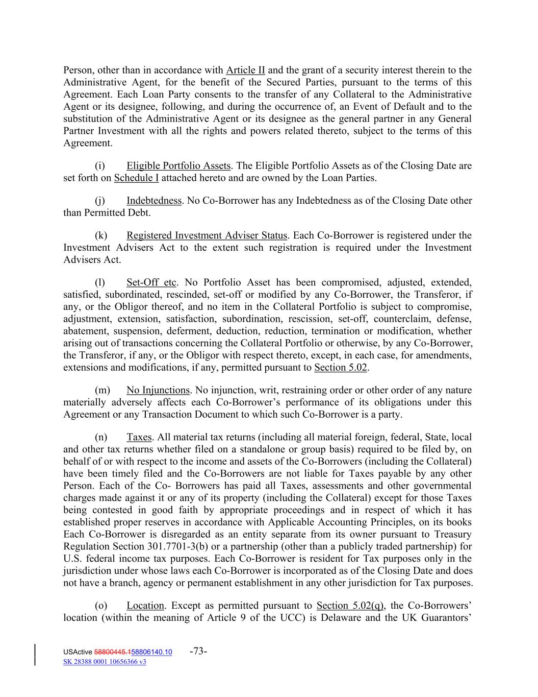 Person, other than in accordance with Article II and the grant of a security interest therein to the Administrative Agent, for the benefit of the Secured Parties, pursuant to the terms of this Agreement. Each Loan Party consents to the transfer of any Collateral to the Administrative Agent or its designee, following, and during the occurrence of, an Event of Default and to the substitution of the Administrative Agent or its designee as the general partner in any General Partner Investment with all the rights and powers related thereto, subject to the terms of this Agreement. (i) Eligible Portfolio Assets. The Eligible Portfolio Assets as of the Closing Date are set forth on Schedule I attached hereto and are owned by the Loan Parties. (j) Indebtedness. No Co‐Borrower has any Indebtedness as of the Closing Date other than Permitted Debt. (k) Registered Investment Adviser Status. Each Co‐Borrower is registered under the Investment Advisers Act to the extent such registration is required under the Investment Advisers Act. (l) Set‐Off etc. No Portfolio Asset has been compromised, adjusted, extended, satisfied, subordinated, rescinded, set‐off or modified by any Co‐Borrower, the Transferor, if any, or the Obligor thereof, and no item in the Collateral Portfolio is subject to compromise, adjustment, extension, satisfaction, subordination, rescission, set‐off, counterclaim, defense, abatement, suspension, deferment, deduction, reduction, termination or modification, whether arising out of transactions concerning the Collateral Portfolio or otherwise, by any Co‐Borrower, the Transferor, if any, or the Obligor with respect thereto, except, in each case, for amendments, extensions and modifications, if any, permitted pursuant to Section 5.02. (m) No Injunctions. No injunction, writ, restraining order or other order of any nature materially adversely affects each Co‐Borrower’s performance of its obligations under this Agreement or any Transaction Document to which such Co‐Borrower is a party. (n) Taxes. All material tax returns (including all material foreign, federal, State, local and other tax returns whether filed on a standalone or group basis) required to be filed by, on behalf of or with respect to the income and assets of the Co‐Borrowers (including the Collateral) have been timely filed and the Co‐Borrowers are not liable for Taxes payable by any other Person. Each of the Co‐ Borrowers has paid all Taxes, assessments and other governmental charges made against it or any of its property (including the Collateral) except for those Taxes being contested in good faith by appropriate proceedings and in respect of which it has established proper reserves in accordance with Applicable Accounting Principles, on its books Each Co‐Borrower is disregarded as an entity separate from its owner pursuant to Treasury Regulation Section 301.7701‐3(b) or a partnership (other than a publicly traded partnership) for U.S. federal income tax purposes. Each Co‐Borrower is resident for Tax purposes only in the jurisdiction under whose laws each Co‐Borrower is incorporated as of the Closing Date and does not have a branch, agency or permanent establishment in any other jurisdiction for Tax purposes. (o) Location. Except as permitted pursuant to Section 5.02(q), the Co‐Borrowers’ location (within the meaning of Article 9 of the UCC) is Delaware and the UK Guarantors’ USActive 58800445.158806140.10 -73- SK 28388 0001 10656366 v3