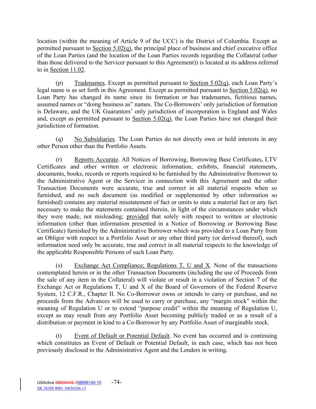 location (within the meaning of Article 9 of the UCC) is the District of Columbia. Except as permitted pursuant to Section 5.02(q), the principal place of business and chief executive office of the Loan Parties (and the location of the Loan Parties records regarding the Collateral (other than those delivered to the Servicer pursuant to this Agreement)) is located at its address referred to in Section 11.02. (p) Tradenames. Except as permitted pursuant to Section 5.02(q), each Loan Party’s legal name is as set forth in this Agreement. Except as permitted pursuant to Section 5.02(q), no Loan Party has changed its name since its formation or has tradenames, fictitious names, assumed names or “doing business as” names. The Co‐Borrowers’ only jurisdiction of formation is Delaware, and the UK Guarantors’ only jurisdiction of incorporation is England and Wales and, except as permitted pursuant to Section 5.02(q), the Loan Parties have not changed their jurisdiction of formation. (q) No Subsidiaries. The Loan Parties do not directly own or hold interests in any other Person other than the Portfolio Assets. (r) Reports Accurate. All Notices of Borrowing, Borrowing Base Certificates, LTV Certificates and other written or electronic information, exhibits, financial statements, documents, books, records or reports required to be furnished by the Administrative Borrower to the Administrative Agent or the Servicer in connection with this Agreement and the other Transaction Documents were accurate, true and correct in all material respects when so furnished, and no such document (as modified or supplemented by other information so furnished) contains any material misstatement of fact or omits to state a material fact or any fact necessary to make the statements contained therein, in light of the circumstances under which they were made, not misleading; provided that solely with respect to written or electronic information (other than information presented in a Notice of Borrowing or Borrowing Base Certificate) furnished by the Administrative Borrower which was provided to a Loan Party from an Obligor with respect to a Portfolio Asset or any other third party (or derived thereof), such information need only be accurate, true and correct in all material respects to the knowledge of the applicable Responsible Persons of such Loan Party. (s) Exchange Act Compliance; Regulations T, U and X. None of the transactions contemplated herein or in the other Transaction Documents (including the use of Proceeds from the sale of any item in the Collateral) will violate or result in a violation of Section 7 of the Exchange Act or Regulations T, U and X of the Board of Governors of the Federal Reserve System, 12 C.F.R., Chapter II. No Co‐Borrower owns or intends to carry or purchase, and no proceeds from the Advances will be used to carry or purchase, any “margin stock” within the meaning of Regulation U or to extend “purpose credit” within the meaning of Regulation U, except as may result from any Portfolio Asset becoming publicly traded or as a result of a distribution or payment in kind to a Co‐Borrower by any Portfolio Asset of marginable stock. (t) Event of Default or Potential Default. No event has occurred and is continuing which constitutes an Event of Default or Potential Default, in each case, which has not been previously disclosed to the Administrative Agent and the Lenders in writing. USActive 58800445.158806140.10 -74- SK 28388 0001 10656366 v3