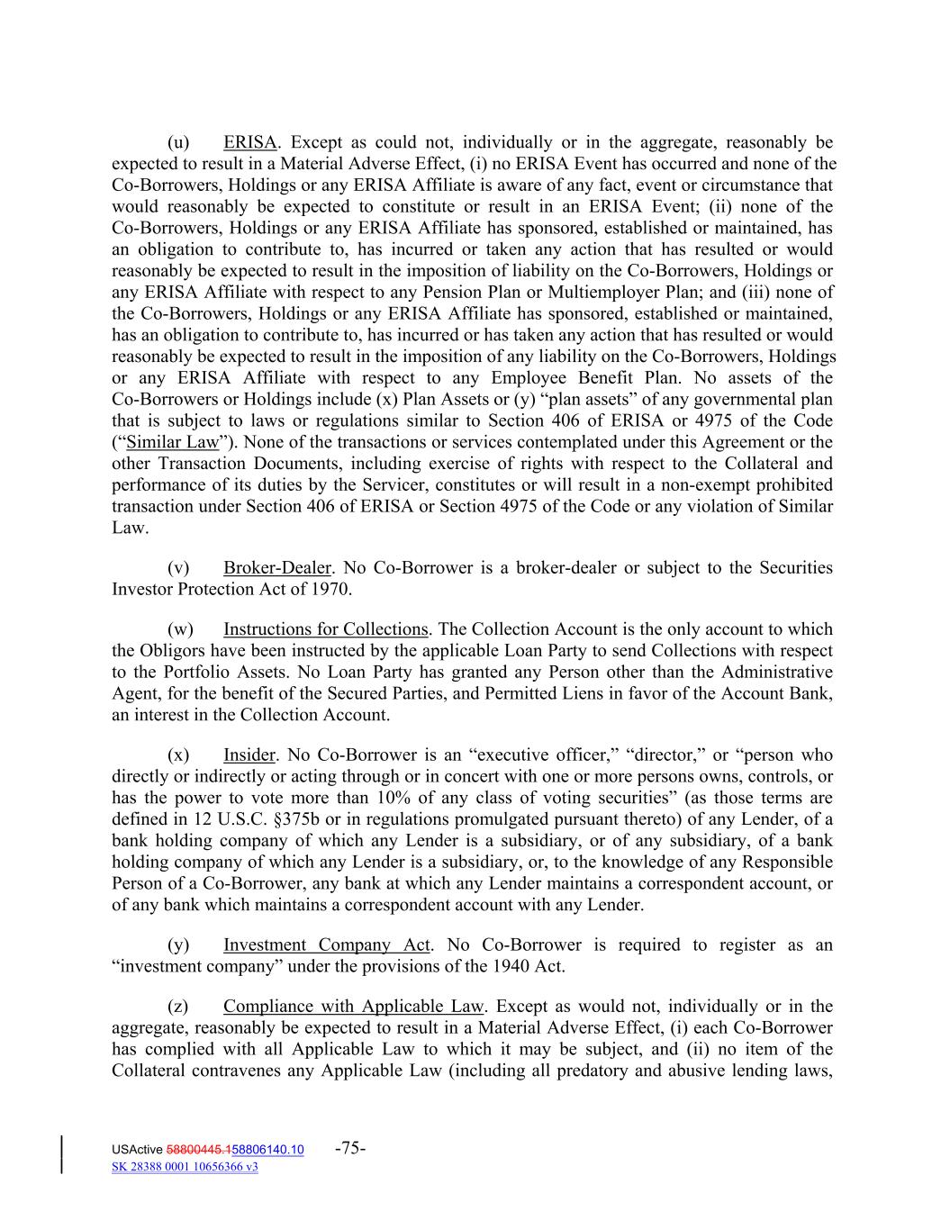 (u) ERISA. Except as could not, individually or in the aggregate, reasonably be expected to result in a Material Adverse Effect, (i) no ERISA Event has occurred and none of the Co‐Borrowers, Holdings or any ERISA Affiliate is aware of any fact, event or circumstance that would reasonably be expected to constitute or result in an ERISA Event; (ii) none of the Co‐Borrowers, Holdings or any ERISA Affiliate has sponsored, established or maintained, has an obligation to contribute to, has incurred or taken any action that has resulted or would reasonably be expected to result in the imposition of liability on the Co‐Borrowers, Holdings or any ERISA Affiliate with respect to any Pension Plan or Multiemployer Plan; and (iii) none of the Co‐Borrowers, Holdings or any ERISA Affiliate has sponsored, established or maintained, has an obligation to contribute to, has incurred or has taken any action that has resulted or would reasonably be expected to result in the imposition of any liability on the Co‐Borrowers, Holdings or any ERISA Affiliate with respect to any Employee Benefit Plan. No assets of the Co‐Borrowers or Holdings include (x) Plan Assets or (y) “plan assets” of any governmental plan that is subject to laws or regulations similar to Section 406 of ERISA or 4975 of the Code (“Similar Law”). None of the transactions or services contemplated under this Agreement or the other Transaction Documents, including exercise of rights with respect to the Collateral and performance of its duties by the Servicer, constitutes or will result in a non‐exempt prohibited transaction under Section 406 of ERISA or Section 4975 of the Code or any violation of Similar Law. (v) Broker‐Dealer. No Co‐Borrower is a broker‐dealer or subject to the Securities Investor Protection Act of 1970. (w) Instructions for Collections. The Collection Account is the only account to which the Obligors have been instructed by the applicable Loan Party to send Collections with respect to the Portfolio Assets. No Loan Party has granted any Person other than the Administrative Agent, for the benefit of the Secured Parties, and Permitted Liens in favor of the Account Bank, an interest in the Collection Account. (x) Insider. No Co‐Borrower is an “executive officer,” “director,” or “person who directly or indirectly or acting through or in concert with one or more persons owns, controls, or has the power to vote more than 10% of any class of voting securities” (as those terms are defined in 12 U.S.C. §375b or in regulations promulgated pursuant thereto) of any Lender, of a bank holding company of which any Lender is a subsidiary, or of any subsidiary, of a bank holding company of which any Lender is a subsidiary, or, to the knowledge of any Responsible Person of a Co‐Borrower, any bank at which any Lender maintains a correspondent account, or of any bank which maintains a correspondent account with any Lender. (y) Investment Company Act. No Co‐Borrower is required to register as an “investment company” under the provisions of the 1940 Act. (z) Compliance with Applicable Law. Except as would not, individually or in the aggregate, reasonably be expected to result in a Material Adverse Effect, (i) each Co‐Borrower has complied with all Applicable Law to which it may be subject, and (ii) no item of the Collateral contravenes any Applicable Law (including all predatory and abusive lending laws, USActive 58800445.158806140.10 -75- SK 28388 0001 10656366 v3