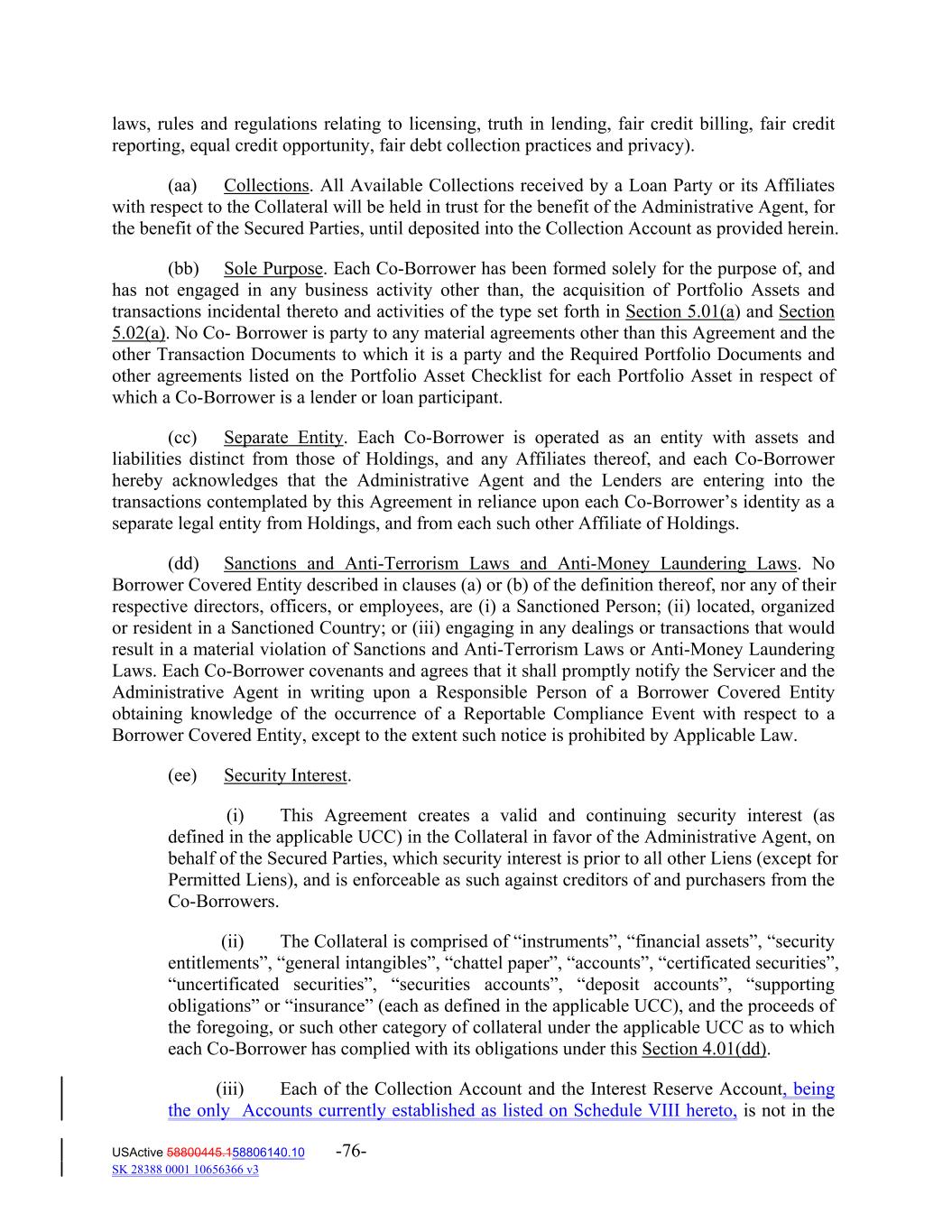 laws, rules and regulations relating to licensing, truth in lending, fair credit billing, fair credit reporting, equal credit opportunity, fair debt collection practices and privacy). (aa) Collections. All Available Collections received by a Loan Party or its Affiliates with respect to the Collateral will be held in trust for the benefit of the Administrative Agent, for the benefit of the Secured Parties, until deposited into the Collection Account as provided herein. (bb) Sole Purpose. Each Co‐Borrower has been formed solely for the purpose of, and has not engaged in any business activity other than, the acquisition of Portfolio Assets and transactions incidental thereto and activities of the type set forth in Section 5.01(a) and Section 5.02(a). No Co‐ Borrower is party to any material agreements other than this Agreement and the other Transaction Documents to which it is a party and the Required Portfolio Documents and other agreements listed on the Portfolio Asset Checklist for each Portfolio Asset in respect of which a Co‐Borrower is a lender or loan participant. (cc) Separate Entity. Each Co‐Borrower is operated as an entity with assets and liabilities distinct from those of Holdings, and any Affiliates thereof, and each Co‐Borrower hereby acknowledges that the Administrative Agent and the Lenders are entering into the transactions contemplated by this Agreement in reliance upon each Co‐Borrower’s identity as a separate legal entity from Holdings, and from each such other Affiliate of Holdings. (dd) Sanctions and Anti‐Terrorism Laws and Anti‐Money Laundering Laws. No Borrower Covered Entity described in clauses (a) or (b) of the definition thereof, nor any of their respective directors, officers, or employees, are (i) a Sanctioned Person; (ii) located, organized or resident in a Sanctioned Country; or (iii) engaging in any dealings or transactions that would result in a material violation of Sanctions and Anti‐Terrorism Laws or Anti‐Money Laundering Laws. Each Co‐Borrower covenants and agrees that it shall promptly notify the Servicer and the Administrative Agent in writing upon a Responsible Person of a Borrower Covered Entity obtaining knowledge of the occurrence of a Reportable Compliance Event with respect to a Borrower Covered Entity, except to the extent such notice is prohibited by Applicable Law. (ee) Security Interest. (i) This Agreement creates a valid and continuing security interest (as defined in the applicable UCC) in the Collateral in favor of the Administrative Agent, on behalf of the Secured Parties, which security interest is prior to all other Liens (except for Permitted Liens), and is enforceable as such against creditors of and purchasers from the Co‐Borrowers. (ii) The Collateral is comprised of “instruments”, “financial assets”, “security entitlements”, “general intangibles”, “chattel paper”, “accounts”, “certificated securities”, “uncertificated securities”, “securities accounts”, “deposit accounts”, “supporting obligations” or “insurance” (each as defined in the applicable UCC), and the proceeds of the foregoing, or such other category of collateral under the applicable UCC as to which each Co‐Borrower has complied with its obligations under this Section 4.01(dd). (iii) Each of the Collection Account and the Interest Reserve Account, being the only Accounts currently established as listed on Schedule VIII hereto, is not in the USActive 58800445.158806140.10 -76- SK 28388 0001 10656366 v3