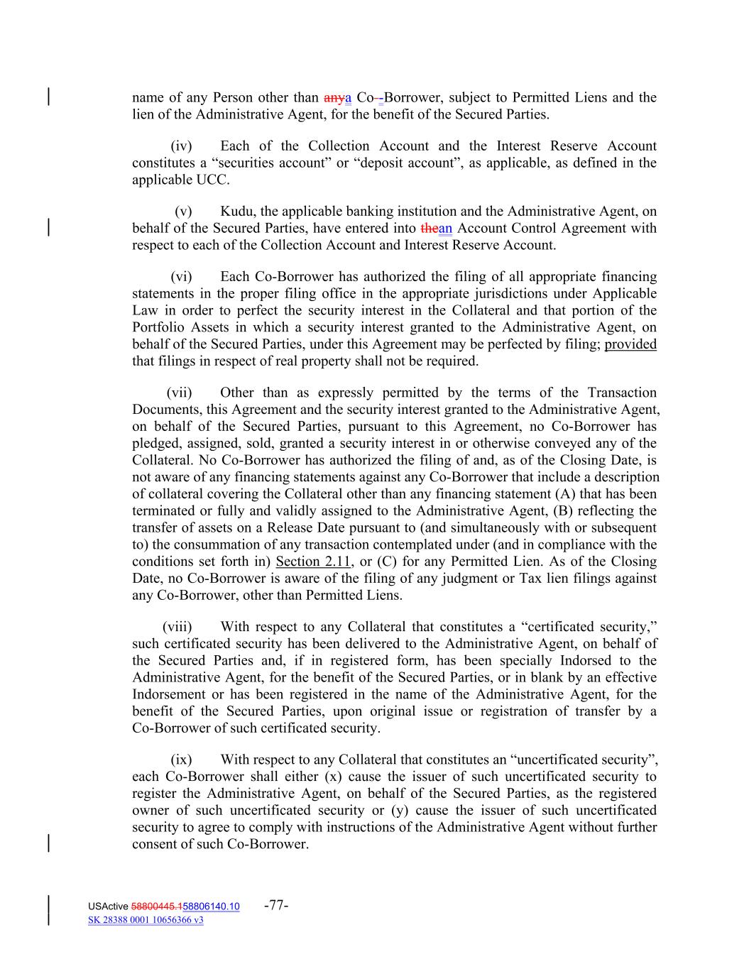 name of any Person other than anya Co -Borrower, subject to Permitted Liens and the lien of the Administrative Agent, for the benefit of the Secured Parties. (iv) Each of the Collection Account and the Interest Reserve Account constitutes a “securities account” or “deposit account”, as applicable, as defined in the applicable UCC. (v) Kudu, the applicable banking institution and the Administrative Agent, on behalf of the Secured Parties, have entered into thean Account Control Agreement with respect to each of the Collection Account and Interest Reserve Account. (vi) Each Co‐Borrower has authorized the filing of all appropriate financing statements in the proper filing office in the appropriate jurisdictions under Applicable Law in order to perfect the security interest in the Collateral and that portion of the Portfolio Assets in which a security interest granted to the Administrative Agent, on behalf of the Secured Parties, under this Agreement may be perfected by filing; provided that filings in respect of real property shall not be required. (vii) Other than as expressly permitted by the terms of the Transaction Documents, this Agreement and the security interest granted to the Administrative Agent, on behalf of the Secured Parties, pursuant to this Agreement, no Co‐Borrower has pledged, assigned, sold, granted a security interest in or otherwise conveyed any of the Collateral. No Co‐Borrower has authorized the filing of and, as of the Closing Date, is not aware of any financing statements against any Co‐Borrower that include a description of collateral covering the Collateral other than any financing statement (A) that has been terminated or fully and validly assigned to the Administrative Agent, (B) reflecting the transfer of assets on a Release Date pursuant to (and simultaneously with or subsequent to) the consummation of any transaction contemplated under (and in compliance with the conditions set forth in) Section 2.11, or (C) for any Permitted Lien. As of the Closing Date, no Co‐Borrower is aware of the filing of any judgment or Tax lien filings against any Co‐Borrower, other than Permitted Liens. (viii) With respect to any Collateral that constitutes a “certificated security,” such certificated security has been delivered to the Administrative Agent, on behalf of the Secured Parties and, if in registered form, has been specially Indorsed to the Administrative Agent, for the benefit of the Secured Parties, or in blank by an effective Indorsement or has been registered in the name of the Administrative Agent, for the benefit of the Secured Parties, upon original issue or registration of transfer by a Co‐Borrower of such certificated security. (ix) With respect to any Collateral that constitutes an “uncertificated security”, each Co‐Borrower shall either (x) cause the issuer of such uncertificated security to register the Administrative Agent, on behalf of the Secured Parties, as the registered owner of such uncertificated security or (y) cause the issuer of such uncertificated security to agree to comply with instructions of the Administrative Agent without further consent of such Co‐Borrower. USActive 58800445.158806140.10 -77- SK 28388 0001 10656366 v3