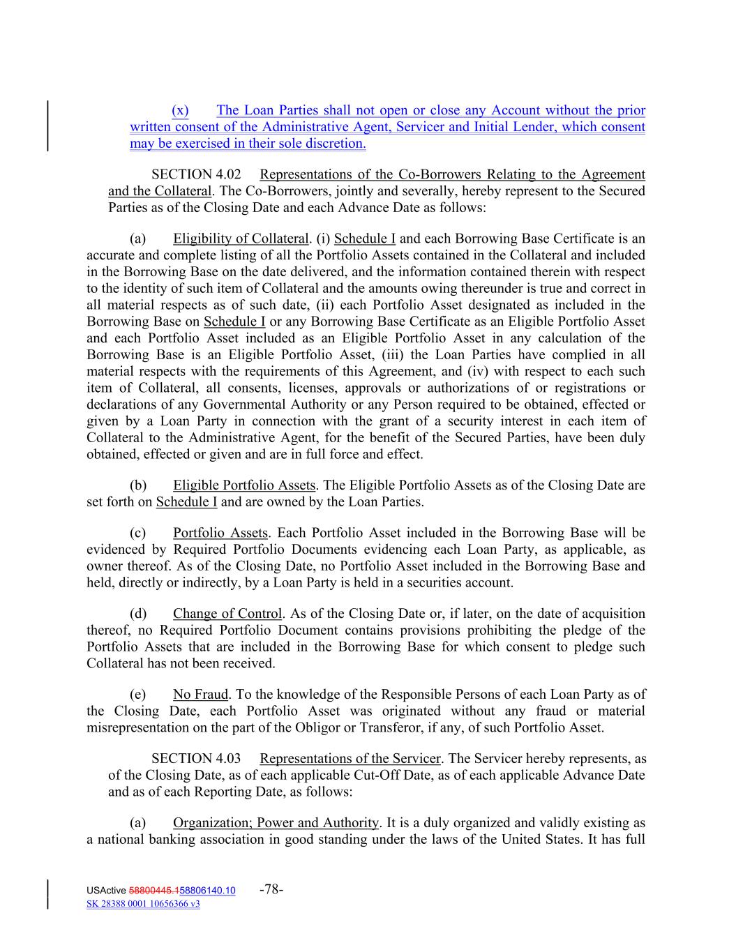 (x) The Loan Parties shall not open or close any Account without the prior written consent of the Administrative Agent, Servicer and Initial Lender, which consent may be exercised in their sole discretion. SECTION 4.02 Representations of the Co‐Borrowers Relating to the Agreement and the Collateral. The Co‐Borrowers, jointly and severally, hereby represent to the Secured Parties as of the Closing Date and each Advance Date as follows: (a) Eligibility of Collateral. (i) Schedule I and each Borrowing Base Certificate is an accurate and complete listing of all the Portfolio Assets contained in the Collateral and included in the Borrowing Base on the date delivered, and the information contained therein with respect to the identity of such item of Collateral and the amounts owing thereunder is true and correct in all material respects as of such date, (ii) each Portfolio Asset designated as included in the Borrowing Base on Schedule I or any Borrowing Base Certificate as an Eligible Portfolio Asset and each Portfolio Asset included as an Eligible Portfolio Asset in any calculation of the Borrowing Base is an Eligible Portfolio Asset, (iii) the Loan Parties have complied in all material respects with the requirements of this Agreement, and (iv) with respect to each such item of Collateral, all consents, licenses, approvals or authorizations of or registrations or declarations of any Governmental Authority or any Person required to be obtained, effected or given by a Loan Party in connection with the grant of a security interest in each item of Collateral to the Administrative Agent, for the benefit of the Secured Parties, have been duly obtained, effected or given and are in full force and effect. (b) Eligible Portfolio Assets. The Eligible Portfolio Assets as of the Closing Date are set forth on Schedule I and are owned by the Loan Parties. (c) Portfolio Assets. Each Portfolio Asset included in the Borrowing Base will be evidenced by Required Portfolio Documents evidencing each Loan Party, as applicable, as owner thereof. As of the Closing Date, no Portfolio Asset included in the Borrowing Base and held, directly or indirectly, by a Loan Party is held in a securities account. (d) Change of Control. As of the Closing Date or, if later, on the date of acquisition thereof, no Required Portfolio Document contains provisions prohibiting the pledge of the Portfolio Assets that are included in the Borrowing Base for which consent to pledge such Collateral has not been received. (e) No Fraud. To the knowledge of the Responsible Persons of each Loan Party as of the Closing Date, each Portfolio Asset was originated without any fraud or material misrepresentation on the part of the Obligor or Transferor, if any, of such Portfolio Asset. SECTION 4.03 Representations of the Servicer. The Servicer hereby represents, as of the Closing Date, as of each applicable Cut‐Off Date, as of each applicable Advance Date and as of each Reporting Date, as follows: (a) Organization; Power and Authority. It is a duly organized and validly existing as a national banking association in good standing under the laws of the United States. It has full USActive 58800445.158806140.10 -78- SK 28388 0001 10656366 v3