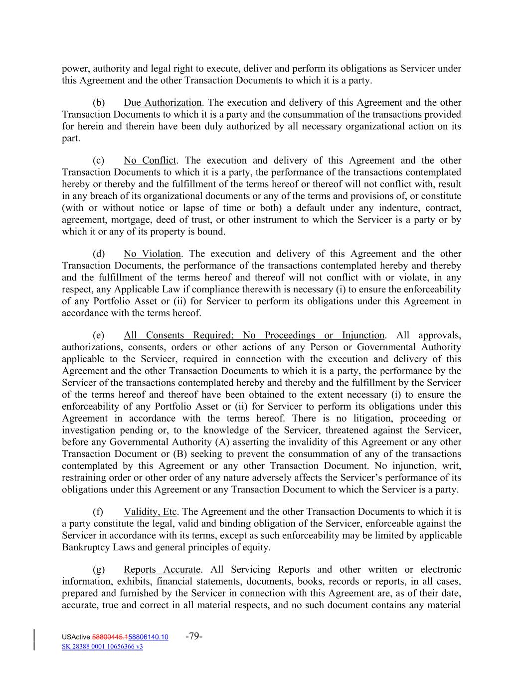 power, authority and legal right to execute, deliver and perform its obligations as Servicer under this Agreement and the other Transaction Documents to which it is a party. (b) Due Authorization. The execution and delivery of this Agreement and the other Transaction Documents to which it is a party and the consummation of the transactions provided for herein and therein have been duly authorized by all necessary organizational action on its part. (c) No Conflict. The execution and delivery of this Agreement and the other Transaction Documents to which it is a party, the performance of the transactions contemplated hereby or thereby and the fulfillment of the terms hereof or thereof will not conflict with, result in any breach of its organizational documents or any of the terms and provisions of, or constitute (with or without notice or lapse of time or both) a default under any indenture, contract, agreement, mortgage, deed of trust, or other instrument to which the Servicer is a party or by which it or any of its property is bound. (d) No Violation. The execution and delivery of this Agreement and the other Transaction Documents, the performance of the transactions contemplated hereby and thereby and the fulfillment of the terms hereof and thereof will not conflict with or violate, in any respect, any Applicable Law if compliance therewith is necessary (i) to ensure the enforceability of any Portfolio Asset or (ii) for Servicer to perform its obligations under this Agreement in accordance with the terms hereof. (e) All Consents Required; No Proceedings or Injunction. All approvals, authorizations, consents, orders or other actions of any Person or Governmental Authority applicable to the Servicer, required in connection with the execution and delivery of this Agreement and the other Transaction Documents to which it is a party, the performance by the Servicer of the transactions contemplated hereby and thereby and the fulfillment by the Servicer of the terms hereof and thereof have been obtained to the extent necessary (i) to ensure the enforceability of any Portfolio Asset or (ii) for Servicer to perform its obligations under this Agreement in accordance with the terms hereof. There is no litigation, proceeding or investigation pending or, to the knowledge of the Servicer, threatened against the Servicer, before any Governmental Authority (A) asserting the invalidity of this Agreement or any other Transaction Document or (B) seeking to prevent the consummation of any of the transactions contemplated by this Agreement or any other Transaction Document. No injunction, writ, restraining order or other order of any nature adversely affects the Servicer’s performance of its obligations under this Agreement or any Transaction Document to which the Servicer is a party. (f) Validity, Etc. The Agreement and the other Transaction Documents to which it is a party constitute the legal, valid and binding obligation of the Servicer, enforceable against the Servicer in accordance with its terms, except as such enforceability may be limited by applicable Bankruptcy Laws and general principles of equity. (g) Reports Accurate. All Servicing Reports and other written or electronic information, exhibits, financial statements, documents, books, records or reports, in all cases, prepared and furnished by the Servicer in connection with this Agreement are, as of their date, accurate, true and correct in all material respects, and no such document contains any material USActive 58800445.158806140.10 -79- SK 28388 0001 10656366 v3