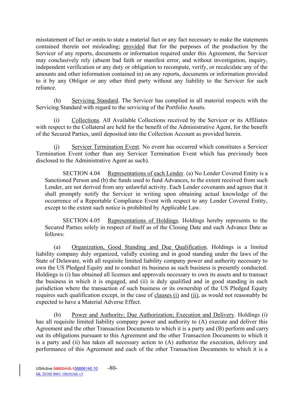 misstatement of fact or omits to state a material fact or any fact necessary to make the statements contained therein not misleading; provided that for the purposes of the production by the Servicer of any reports, documents or information required under this Agreement, the Servicer may conclusively rely (absent bad faith or manifest error, and without investigation, inquiry, independent verification or any duty or obligation to recompute, verify, or recalculate any of the amounts and other information contained in) on any reports, documents or information provided to it by any Obligor or any other third party without any liability to the Servicer for such reliance. (h) Servicing Standard. The Servicer has complied in all material respects with the Servicing Standard with regard to the servicing of the Portfolio Assets. (i) Collections. All Available Collections received by the Servicer or its Affiliates with respect to the Collateral are held for the benefit of the Administrative Agent, for the benefit of the Secured Parties, until deposited into the Collection Account as provided herein. (j) Servicer Termination Event. No event has occurred which constitutes a Servicer Termination Event (other than any Servicer Termination Event which has previously been disclosed to the Administrative Agent as such). SECTION 4.04 Representations of each Lender. (a) No Lender Covered Entity is a Sanctioned Person and (b) the funds used to fund Advances, to the extent received from such Lender, are not derived from any unlawful activity. Each Lender covenants and agrees that it shall promptly notify the Servicer in writing upon obtaining actual knowledge of the occurrence of a Reportable Compliance Event with respect to any Lender Covered Entity, except to the extent such notice is prohibited by Applicable Law. SECTION 4.05 Representations of Holdings. Holdings hereby represents to the Secured Parties solely in respect of itself as of the Closing Date and each Advance Date as follows: (a) Organization, Good Standing and Due Qualification. Holdings is a limited liability company duly organized, validly existing and in good standing under the laws of the State of Delaware, with all requisite limited liability company power and authority necessary to own the US Pledged Equity and to conduct its business as such business is presently conducted. Holdings is (i) has obtained all licenses and approvals necessary to own its assets and to transact the business in which it is engaged, and (ii) is duly qualified and in good standing in each jurisdiction where the transaction of such business or its ownership of the US Pledged Equity requires such qualification except, in the case of clauses (i) and (ii), as would not reasonably be expected to have a Material Adverse Effect. (b) Power and Authority; Due Authorization; Execution and Delivery. Holdings (i) has all requisite limited liability company power and authority to (A) execute and deliver this Agreement and the other Transaction Documents to which it is a party and (B) perform and carry out its obligations pursuant to this Agreement and the other Transaction Documents to which it is a party and (ii) has taken all necessary action to (A) authorize the execution, delivery and performance of this Agreement and each of the other Transaction Documents to which it is a USActive 58800445.158806140.10 -80- SK 28388 0001 10656366 v3