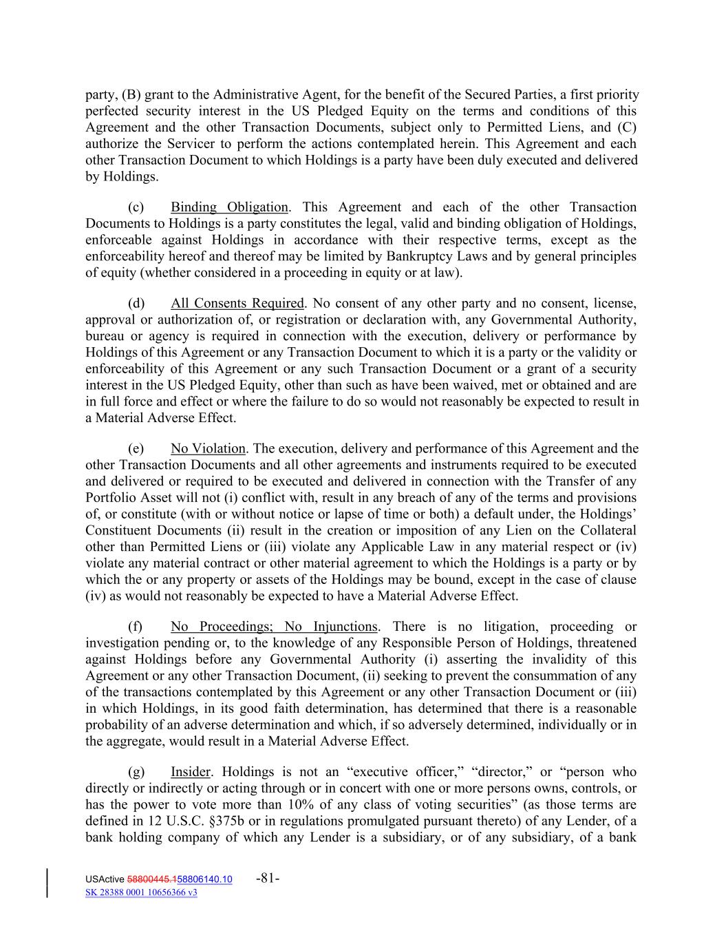 party, (B) grant to the Administrative Agent, for the benefit of the Secured Parties, a first priority perfected security interest in the US Pledged Equity on the terms and conditions of this Agreement and the other Transaction Documents, subject only to Permitted Liens, and (C) authorize the Servicer to perform the actions contemplated herein. This Agreement and each other Transaction Document to which Holdings is a party have been duly executed and delivered by Holdings. (c) Binding Obligation. This Agreement and each of the other Transaction Documents to Holdings is a party constitutes the legal, valid and binding obligation of Holdings, enforceable against Holdings in accordance with their respective terms, except as the enforceability hereof and thereof may be limited by Bankruptcy Laws and by general principles of equity (whether considered in a proceeding in equity or at law). (d) All Consents Required. No consent of any other party and no consent, license, approval or authorization of, or registration or declaration with, any Governmental Authority, bureau or agency is required in connection with the execution, delivery or performance by Holdings of this Agreement or any Transaction Document to which it is a party or the validity or enforceability of this Agreement or any such Transaction Document or a grant of a security interest in the US Pledged Equity, other than such as have been waived, met or obtained and are in full force and effect or where the failure to do so would not reasonably be expected to result in a Material Adverse Effect. (e) No Violation. The execution, delivery and performance of this Agreement and the other Transaction Documents and all other agreements and instruments required to be executed and delivered or required to be executed and delivered in connection with the Transfer of any Portfolio Asset will not (i) conflict with, result in any breach of any of the terms and provisions of, or constitute (with or without notice or lapse of time or both) a default under, the Holdings’ Constituent Documents (ii) result in the creation or imposition of any Lien on the Collateral other than Permitted Liens or (iii) violate any Applicable Law in any material respect or (iv) violate any material contract or other material agreement to which the Holdings is a party or by which the or any property or assets of the Holdings may be bound, except in the case of clause (iv) as would not reasonably be expected to have a Material Adverse Effect. (f) No Proceedings; No Injunctions. There is no litigation, proceeding or investigation pending or, to the knowledge of any Responsible Person of Holdings, threatened against Holdings before any Governmental Authority (i) asserting the invalidity of this Agreement or any other Transaction Document, (ii) seeking to prevent the consummation of any of the transactions contemplated by this Agreement or any other Transaction Document or (iii) in which Holdings, in its good faith determination, has determined that there is a reasonable probability of an adverse determination and which, if so adversely determined, individually or in the aggregate, would result in a Material Adverse Effect. (g) Insider. Holdings is not an “executive officer,” “director,” or “person who directly or indirectly or acting through or in concert with one or more persons owns, controls, or has the power to vote more than 10% of any class of voting securities” (as those terms are defined in 12 U.S.C. §375b or in regulations promulgated pursuant thereto) of any Lender, of a bank holding company of which any Lender is a subsidiary, or of any subsidiary, of a bank USActive 58800445.158806140.10 -81- SK 28388 0001 10656366 v3