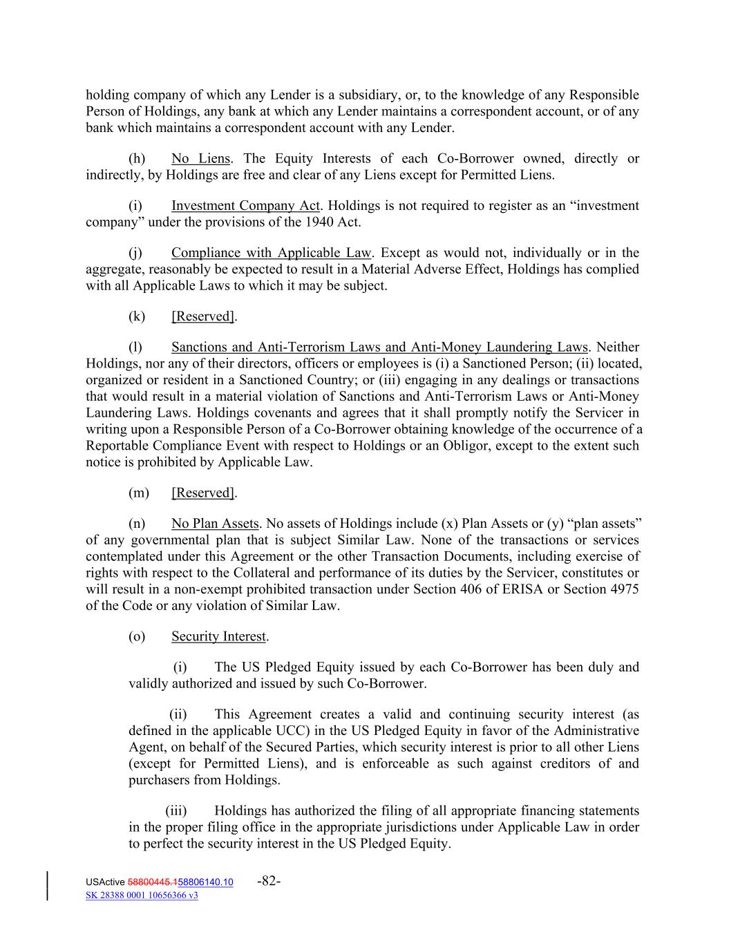 holding company of which any Lender is a subsidiary, or, to the knowledge of any Responsible Person of Holdings, any bank at which any Lender maintains a correspondent account, or of any bank which maintains a correspondent account with any Lender. (h) No Liens. The Equity Interests of each Co‐Borrower owned, directly or indirectly, by Holdings are free and clear of any Liens except for Permitted Liens. (i) Investment Company Act. Holdings is not required to register as an “investment company” under the provisions of the 1940 Act. (j) Compliance with Applicable Law. Except as would not, individually or in the aggregate, reasonably be expected to result in a Material Adverse Effect, Holdings has complied with all Applicable Laws to which it may be subject. (k) [Reserved]. (l) Sanctions and Anti‐Terrorism Laws and Anti‐Money Laundering Laws. Neither Holdings, nor any of their directors, officers or employees is (i) a Sanctioned Person; (ii) located, organized or resident in a Sanctioned Country; or (iii) engaging in any dealings or transactions that would result in a material violation of Sanctions and Anti‐Terrorism Laws or Anti‐Money Laundering Laws. Holdings covenants and agrees that it shall promptly notify the Servicer in writing upon a Responsible Person of a Co‐Borrower obtaining knowledge of the occurrence of a Reportable Compliance Event with respect to Holdings or an Obligor, except to the extent such notice is prohibited by Applicable Law. (m) [Reserved]. (n) No Plan Assets. No assets of Holdings include (x) Plan Assets or (y) “plan assets” of any governmental plan that is subject Similar Law. None of the transactions or services contemplated under this Agreement or the other Transaction Documents, including exercise of rights with respect to the Collateral and performance of its duties by the Servicer, constitutes or will result in a non‐exempt prohibited transaction under Section 406 of ERISA or Section 4975 of the Code or any violation of Similar Law. (o) Security Interest. (i) The US Pledged Equity issued by each Co‐Borrower has been duly and validly authorized and issued by such Co‐Borrower. (ii) This Agreement creates a valid and continuing security interest (as defined in the applicable UCC) in the US Pledged Equity in favor of the Administrative Agent, on behalf of the Secured Parties, which security interest is prior to all other Liens (except for Permitted Liens), and is enforceable as such against creditors of and purchasers from Holdings. (iii) Holdings has authorized the filing of all appropriate financing statements in the proper filing office in the appropriate jurisdictions under Applicable Law in order to perfect the security interest in the US Pledged Equity. USActive 58800445.158806140.10 -82- SK 28388 0001 10656366 v3