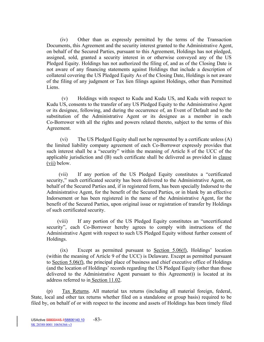 (iv) Other than as expressly permitted by the terms of the Transaction Documents, this Agreement and the security interest granted to the Administrative Agent, on behalf of the Secured Parties, pursuant to this Agreement, Holdings has not pledged, assigned, sold, granted a security interest in or otherwise conveyed any of the US Pledged Equity. Holdings has not authorized the filing of, and as of the Closing Date is not aware of any financing statements against Holdings that include a description of collateral covering the US Pledged Equity As of the Closing Date, Holdings is not aware of the filing of any judgment or Tax lien filings against Holdings, other than Permitted Liens. (v) Holdings with respect to Kudu and Kudu US, and Kudu with respect to Kudu US, consents to the transfer of any US Pledged Equity to the Administrative Agent or its designee, following, and during the occurrence of, an Event of Default and to the substitution of the Administrative Agent or its designee as a member in each Co‐Borrower with all the rights and powers related thereto, subject to the terms of this Agreement. (vi) The US Pledged Equity shall not be represented by a certificate unless (A) the limited liability company agreement of each Co‐Borrower expressly provides that such interest shall be a “security” within the meaning of Article 8 of the UCC of the applicable jurisdiction and (B) such certificate shall be delivered as provided in clause (vii) below. (vii) If any portion of the US Pledged Equity constitutes a “certificated security,” such certificated security has been delivered to the Administrative Agent, on behalf of the Secured Parties and, if in registered form, has been specially Indorsed to the Administrative Agent, for the benefit of the Secured Parties, or in blank by an effective Indorsement or has been registered in the name of the Administrative Agent, for the benefit of the Secured Parties, upon original issue or registration of transfer by Holdings of such certificated security. (viii) If any portion of the US Pledged Equity constitutes an “uncertificated security”, each Co‐Borrower hereby agrees to comply with instructions of the Administrative Agent with respect to such US Pledged Equity without further consent of Holdings. (ix) Except as permitted pursuant to Section 5.06(f), Holdings’ location (within the meaning of Article 9 of the UCC) is Delaware. Except as permitted pursuant to Section 5.06(f), the principal place of business and chief executive office of Holdings (and the location of Holdings’ records regarding the US Pledged Equity (other than those delivered to the Administrative Agent pursuant to this Agreement)) is located at its address referred to in Section 11.02. (p) Tax Returns. All material tax returns (including all material foreign, federal, State, local and other tax returns whether filed on a standalone or group basis) required to be filed by, on behalf of or with respect to the income and assets of Holdings has been timely filed USActive 58800445.158806140.10 -83- SK 28388 0001 10656366 v3