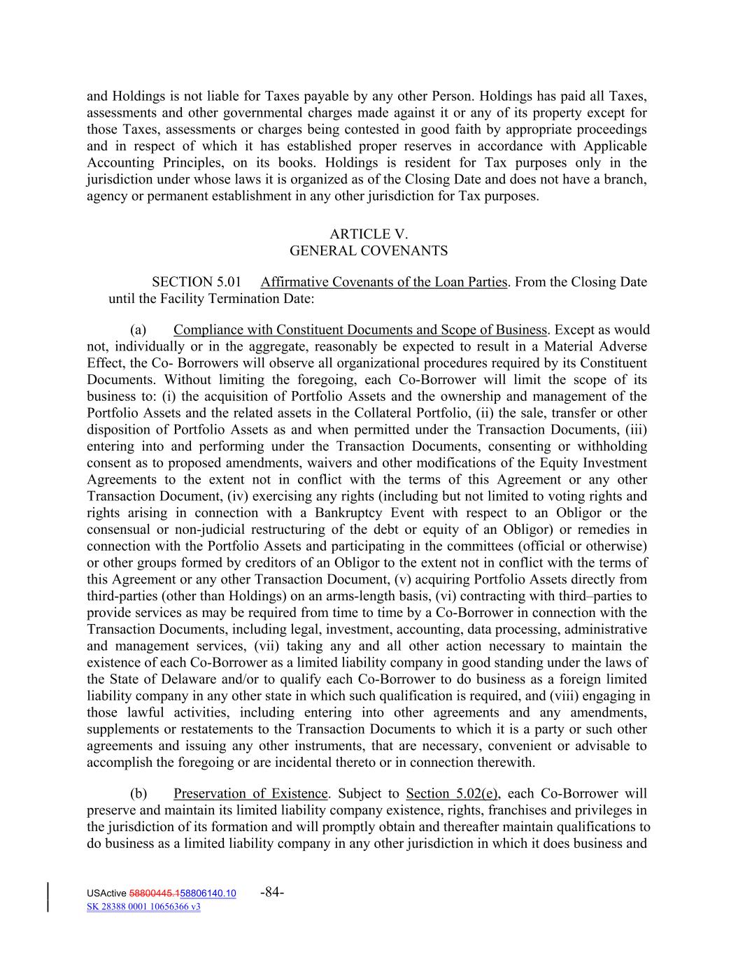 and Holdings is not liable for Taxes payable by any other Person. Holdings has paid all Taxes, assessments and other governmental charges made against it or any of its property except for those Taxes, assessments or charges being contested in good faith by appropriate proceedings and in respect of which it has established proper reserves in accordance with Applicable Accounting Principles, on its books. Holdings is resident for Tax purposes only in the jurisdiction under whose laws it is organized as of the Closing Date and does not have a branch, agency or permanent establishment in any other jurisdiction for Tax purposes. ARTICLE V. GENERAL COVENANTS SECTION 5.01 Affirmative Covenants of the Loan Parties. From the Closing Date until the Facility Termination Date: (a) Compliance with Constituent Documents and Scope of Business. Except as would not, individually or in the aggregate, reasonably be expected to result in a Material Adverse Effect, the Co‐ Borrowers will observe all organizational procedures required by its Constituent Documents. Without limiting the foregoing, each Co‐Borrower will limit the scope of its business to: (i) the acquisition of Portfolio Assets and the ownership and management of the Portfolio Assets and the related assets in the Collateral Portfolio, (ii) the sale, transfer or other disposition of Portfolio Assets as and when permitted under the Transaction Documents, (iii) entering into and performing under the Transaction Documents, consenting or withholding consent as to proposed amendments, waivers and other modifications of the Equity Investment Agreements to the extent not in conflict with the terms of this Agreement or any other Transaction Document, (iv) exercising any rights (including but not limited to voting rights and rights arising in connection with a Bankruptcy Event with respect to an Obligor or the consensual or non‐judicial restructuring of the debt or equity of an Obligor) or remedies in connection with the Portfolio Assets and participating in the committees (official or otherwise) or other groups formed by creditors of an Obligor to the extent not in conflict with the terms of this Agreement or any other Transaction Document, (v) acquiring Portfolio Assets directly from third‐parties (other than Holdings) on an arms‐length basis, (vi) contracting with third–parties to provide services as may be required from time to time by a Co‐Borrower in connection with the Transaction Documents, including legal, investment, accounting, data processing, administrative and management services, (vii) taking any and all other action necessary to maintain the existence of each Co‐Borrower as a limited liability company in good standing under the laws of the State of Delaware and/or to qualify each Co‐Borrower to do business as a foreign limited liability company in any other state in which such qualification is required, and (viii) engaging in those lawful activities, including entering into other agreements and any amendments, supplements or restatements to the Transaction Documents to which it is a party or such other agreements and issuing any other instruments, that are necessary, convenient or advisable to accomplish the foregoing or are incidental thereto or in connection therewith. (b) Preservation of Existence. Subject to Section 5.02(e), each Co‐Borrower will preserve and maintain its limited liability company existence, rights, franchises and privileges in the jurisdiction of its formation and will promptly obtain and thereafter maintain qualifications to do business as a limited liability company in any other jurisdiction in which it does business and USActive 58800445.158806140.10 -84- SK 28388 0001 10656366 v3