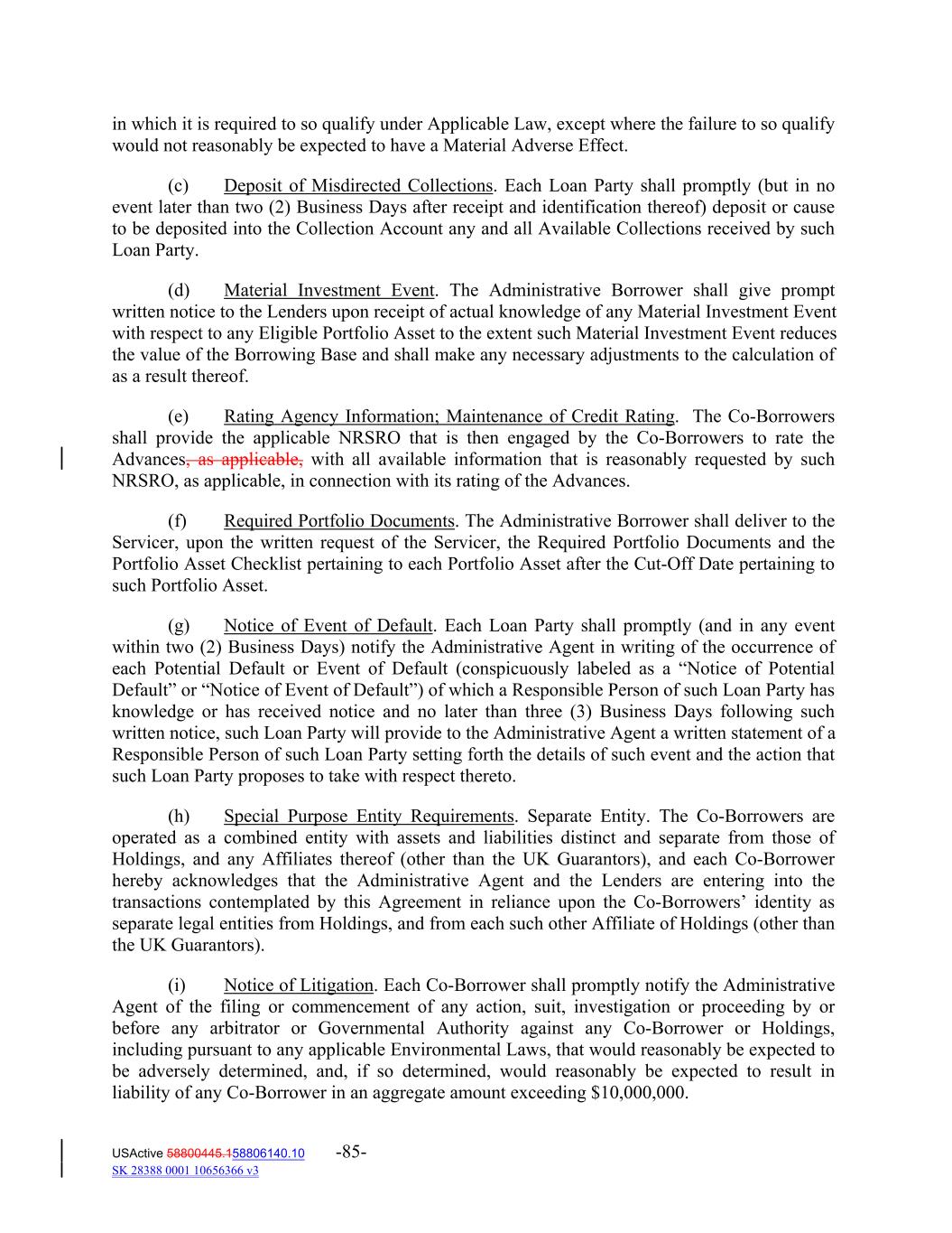 in which it is required to so qualify under Applicable Law, except where the failure to so qualify would not reasonably be expected to have a Material Adverse Effect. (c) Deposit of Misdirected Collections. Each Loan Party shall promptly (but in no event later than two (2) Business Days after receipt and identification thereof) deposit or cause to be deposited into the Collection Account any and all Available Collections received by such Loan Party. (d) Material Investment Event. The Administrative Borrower shall give prompt written notice to the Lenders upon receipt of actual knowledge of any Material Investment Event with respect to any Eligible Portfolio Asset to the extent such Material Investment Event reduces the value of the Borrowing Base and shall make any necessary adjustments to the calculation of as a result thereof. (e) Rating Agency Information; Maintenance of Credit Rating. The Co‐Borrowers shall provide the applicable NRSRO that is then engaged by the Co‐Borrowers to rate the Advances, as applicable, with all available information that is reasonably requested by such NRSRO, as applicable, in connection with its rating of the Advances. (f) Required Portfolio Documents. The Administrative Borrower shall deliver to the Servicer, upon the written request of the Servicer, the Required Portfolio Documents and the Portfolio Asset Checklist pertaining to each Portfolio Asset after the Cut‐Off Date pertaining to such Portfolio Asset. (g) Notice of Event of Default. Each Loan Party shall promptly (and in any event within two (2) Business Days) notify the Administrative Agent in writing of the occurrence of each Potential Default or Event of Default (conspicuously labeled as a “Notice of Potential Default” or “Notice of Event of Default”) of which a Responsible Person of such Loan Party has knowledge or has received notice and no later than three (3) Business Days following such written notice, such Loan Party will provide to the Administrative Agent a written statement of a Responsible Person of such Loan Party setting forth the details of such event and the action that such Loan Party proposes to take with respect thereto. (h) Special Purpose Entity Requirements. Separate Entity. The Co‐Borrowers are operated as a combined entity with assets and liabilities distinct and separate from those of Holdings, and any Affiliates thereof (other than the UK Guarantors), and each Co‐Borrower hereby acknowledges that the Administrative Agent and the Lenders are entering into the transactions contemplated by this Agreement in reliance upon the Co‐Borrowers’ identity as separate legal entities from Holdings, and from each such other Affiliate of Holdings (other than the UK Guarantors). (i) Notice of Litigation. Each Co‐Borrower shall promptly notify the Administrative Agent of the filing or commencement of any action, suit, investigation or proceeding by or before any arbitrator or Governmental Authority against any Co‐Borrower or Holdings, including pursuant to any applicable Environmental Laws, that would reasonably be expected to be adversely determined, and, if so determined, would reasonably be expected to result in liability of any Co‐Borrower in an aggregate amount exceeding $10,000,000. USActive 58800445.158806140.10 -85- SK 28388 0001 10656366 v3