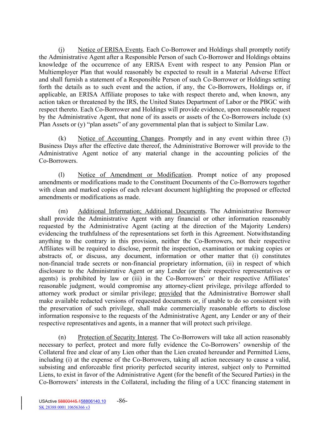 (j) Notice of ERISA Events. Each Co‐Borrower and Holdings shall promptly notify the Administrative Agent after a Responsible Person of such Co‐Borrower and Holdings obtains knowledge of the occurrence of any ERISA Event with respect to any Pension Plan or Multiemployer Plan that would reasonably be expected to result in a Material Adverse Effect and shall furnish a statement of a Responsible Person of such Co‐Borrower or Holdings setting forth the details as to such event and the action, if any, the Co‐Borrowers, Holdings or, if applicable, an ERISA Affiliate proposes to take with respect thereto and, when known, any action taken or threatened by the IRS, the United States Department of Labor or the PBGC with respect thereto. Each Co‐Borrower and Holdings will provide evidence, upon reasonable request by the Administrative Agent, that none of its assets or assets of the Co‐Borrowers include (x) Plan Assets or (y) “plan assets” of any governmental plan that is subject to Similar Law. (k) Notice of Accounting Changes. Promptly and in any event within three (3) Business Days after the effective date thereof, the Administrative Borrower will provide to the Administrative Agent notice of any material change in the accounting policies of the Co‐Borrowers. (l) Notice of Amendment or Modification. Prompt notice of any proposed amendments or modifications made to the Constituent Documents of the Co‐Borrowers together with clean and marked copies of each relevant document highlighting the proposed or effected amendments or modifications as made. (m) Additional Information; Additional Documents. The Administrative Borrower shall provide the Administrative Agent with any financial or other information reasonably requested by the Administrative Agent (acting at the direction of the Majority Lenders) evidencing the truthfulness of the representations set forth in this Agreement. Notwithstanding anything to the contrary in this provision, neither the Co‐Borrowers, not their respective Affiliates will be required to disclose, permit the inspection, examination or making copies or abstracts of, or discuss, any document, information or other matter that (i) constitutes non‐financial trade secrets or non‐financial proprietary information, (ii) in respect of which disclosure to the Administrative Agent or any Lender (or their respective representatives or agents) is prohibited by law or (iii) in the Co‐Borrowers’ or their respective Affiliates’ reasonable judgment, would compromise any attorney‐client privilege, privilege afforded to attorney work product or similar privilege; provided that the Administrative Borrower shall make available redacted versions of requested documents or, if unable to do so consistent with the preservation of such privilege, shall make commercially reasonable efforts to disclose information responsive to the requests of the Administrative Agent, any Lender or any of their respective representatives and agents, in a manner that will protect such privilege. (n) Protection of Security Interest. The Co‐Borrowers will take all action reasonably necessary to perfect, protect and more fully evidence the Co‐Borrowers’ ownership of the Collateral free and clear of any Lien other than the Lien created hereunder and Permitted Liens, including (i) at the expense of the Co‐Borrowers, taking all action necessary to cause a valid, subsisting and enforceable first priority perfected security interest, subject only to Permitted Liens, to exist in favor of the Administrative Agent (for the benefit of the Secured Parties) in the Co‐Borrowers’ interests in the Collateral, including the filing of a UCC financing statement in USActive 58800445.158806140.10 -86- SK 28388 0001 10656366 v3