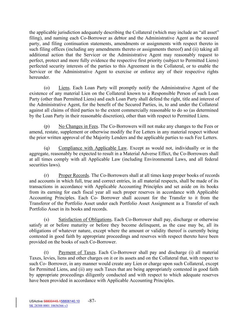 the applicable jurisdiction adequately describing the Collateral (which may include an “all asset” filing), and naming each Co‐Borrower as debtor and the Administrative Agent as the secured party, and filing continuation statements, amendments or assignments with respect thereto in such filing offices (including any amendments thereto or assignments thereof) and (ii) taking all additional action that the Servicer or the Administrative Agent may reasonably request to perfect, protect and more fully evidence the respective first priority (subject to Permitted Liens) perfected security interests of the parties to this Agreement in the Collateral, or to enable the Servicer or the Administrative Agent to exercise or enforce any of their respective rights hereunder. (o) Liens. Each Loan Party will promptly notify the Administrative Agent of the existence of any material Lien on the Collateral known to a Responsible Person of such Loan Party (other than Permitted Liens) and each Loan Party shall defend the right, title and interest of the Administrative Agent, for the benefit of the Secured Parties, in, to and under the Collateral against all claims of third parties to the extent commercially reasonable to do so (as determined by the Loan Party in their reasonable discretion), other than with respect to Permitted Liens. (p) No Changes in Fees. The Co‐Borrowers will not make any changes to the Fees or amend, restate, supplement or otherwise modify the Fee Letters in any material respect without the prior written approval of the Majority Lenders and the applicable parties to such Fee Letters. (q) Compliance with Applicable Law. Except as would not, individually or in the aggregate, reasonably be expected to result in a Material Adverse Effect, the Co‐Borrowers shall at all times comply with all Applicable Law (including Environmental Laws, and all federal securities laws). (r) Proper Records. The Co‐Borrowers shall at all times keep proper books of records and accounts in which full, true and correct entries, in all material respects, shall be made of its transactions in accordance with Applicable Accounting Principles and set aside on its books from its earning for each fiscal year all such proper reserves in accordance with Applicable Accounting Principles. Each Co‐ Borrower shall account for the Transfer to it from the Transferor of the Portfolio Asset under each Portfolio Asset Assignment as a Transfer of such Portfolio Asset in its books and records. (s) Satisfaction of Obligations. Each Co‐Borrower shall pay, discharge or otherwise satisfy at or before maturity or before they become delinquent, as the case may be, all its obligations of whatever nature, except where the amount or validity thereof is currently being contested in good faith by appropriate proceedings and reserves with respect thereto have been provided on the books of such Co‐Borrower. (t) Payment of Taxes. Each Co‐Borrower shall pay and discharge (i) all material Taxes, levies, liens and other charges on it or its assets and on the Collateral that, with respect to such Co‐ Borrower, in any manner would create any Lien or charge upon such Collateral, except for Permitted Liens, and (ii) any such Taxes that are being appropriately contested in good faith by appropriate proceedings diligently conducted and with respect to which adequate reserves have been provided in accordance with Applicable Accounting Principles. USActive 58800445.158806140.10 -87- SK 28388 0001 10656366 v3