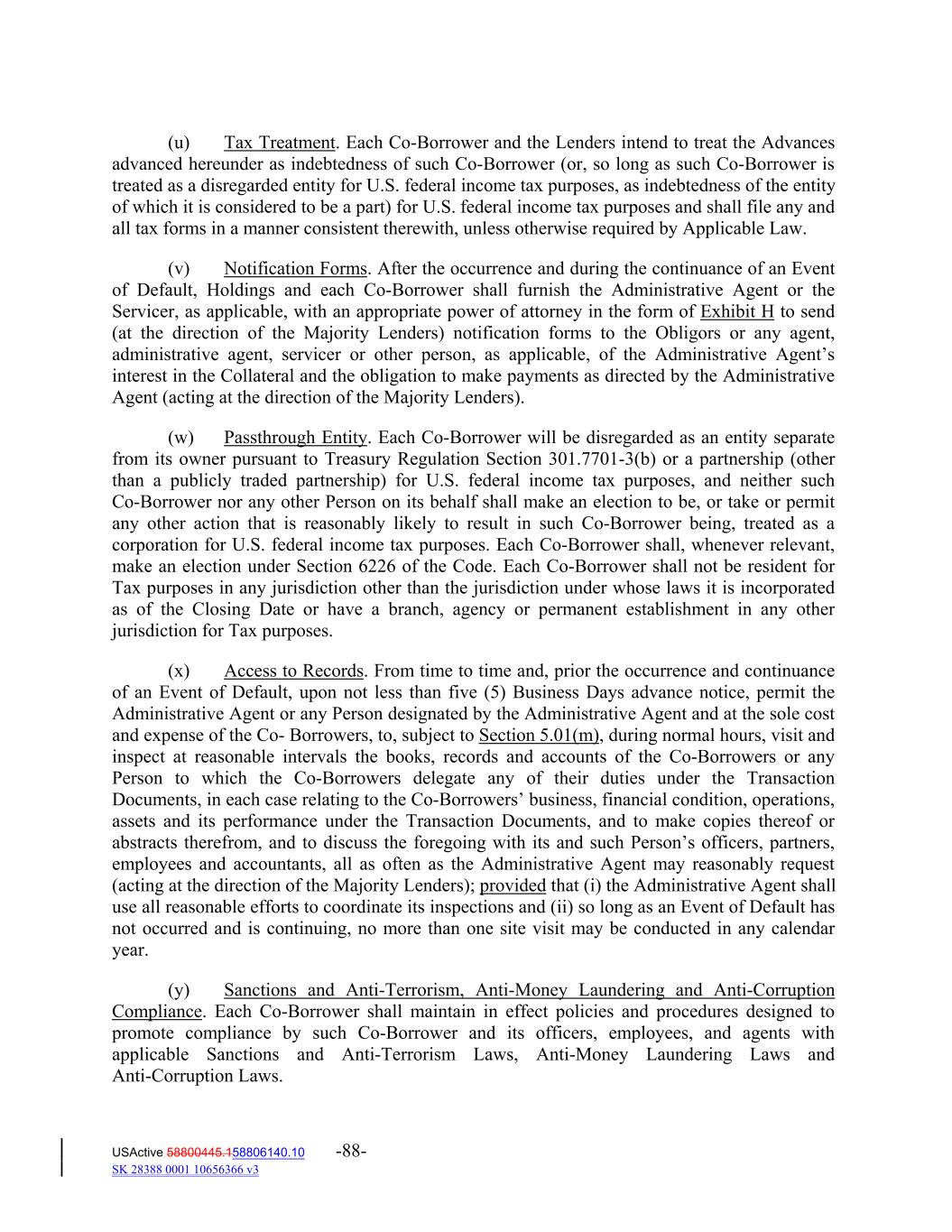 (u) Tax Treatment. Each Co‐Borrower and the Lenders intend to treat the Advances advanced hereunder as indebtedness of such Co‐Borrower (or, so long as such Co‐Borrower is treated as a disregarded entity for U.S. federal income tax purposes, as indebtedness of the entity of which it is considered to be a part) for U.S. federal income tax purposes and shall file any and all tax forms in a manner consistent therewith, unless otherwise required by Applicable Law. (v) Notification Forms. After the occurrence and during the continuance of an Event of Default, Holdings and each Co‐Borrower shall furnish the Administrative Agent or the Servicer, as applicable, with an appropriate power of attorney in the form of Exhibit H to send (at the direction of the Majority Lenders) notification forms to the Obligors or any agent, administrative agent, servicer or other person, as applicable, of the Administrative Agent’s interest in the Collateral and the obligation to make payments as directed by the Administrative Agent (acting at the direction of the Majority Lenders). (w) Passthrough Entity. Each Co‐Borrower will be disregarded as an entity separate from its owner pursuant to Treasury Regulation Section 301.7701‐3(b) or a partnership (other than a publicly traded partnership) for U.S. federal income tax purposes, and neither such Co‐Borrower nor any other Person on its behalf shall make an election to be, or take or permit any other action that is reasonably likely to result in such Co‐Borrower being, treated as a corporation for U.S. federal income tax purposes. Each Co‐Borrower shall, whenever relevant, make an election under Section 6226 of the Code. Each Co‐Borrower shall not be resident for Tax purposes in any jurisdiction other than the jurisdiction under whose laws it is incorporated as of the Closing Date or have a branch, agency or permanent establishment in any other jurisdiction for Tax purposes. (x) Access to Records. From time to time and, prior the occurrence and continuance of an Event of Default, upon not less than five (5) Business Days advance notice, permit the Administrative Agent or any Person designated by the Administrative Agent and at the sole cost and expense of the Co‐ Borrowers, to, subject to Section 5.01(m), during normal hours, visit and inspect at reasonable intervals the books, records and accounts of the Co‐Borrowers or any Person to which the Co‐Borrowers delegate any of their duties under the Transaction Documents, in each case relating to the Co‐Borrowers’ business, financial condition, operations, assets and its performance under the Transaction Documents, and to make copies thereof or abstracts therefrom, and to discuss the foregoing with its and such Person’s officers, partners, employees and accountants, all as often as the Administrative Agent may reasonably request (acting at the direction of the Majority Lenders); provided that (i) the Administrative Agent shall use all reasonable efforts to coordinate its inspections and (ii) so long as an Event of Default has not occurred and is continuing, no more than one site visit may be conducted in any calendar year. (y) Sanctions and Anti‐Terrorism, Anti‐Money Laundering and Anti‐Corruption Compliance. Each Co‐Borrower shall maintain in effect policies and procedures designed to promote compliance by such Co‐Borrower and its officers, employees, and agents with applicable Sanctions and Anti‐Terrorism Laws, Anti‐Money Laundering Laws and Anti‐Corruption Laws. USActive 58800445.158806140.10 -88- SK 28388 0001 10656366 v3