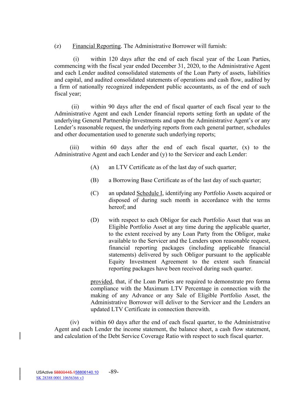 (z) Financial Reporting. The Administrative Borrower will furnish: (i) within 120 days after the end of each fiscal year of the Loan Parties, commencing with the fiscal year ended December 31, 2020, to the Administrative Agent and each Lender audited consolidated statements of the Loan Party of assets, liabilities and capital, and audited consolidated statements of operations and cash flow, audited by a firm of nationally recognized independent public accountants, as of the end of such fiscal year; (ii) within 90 days after the end of fiscal quarter of each fiscal year to the Administrative Agent and each Lender financial reports setting forth an update of the underlying General Partnership Investments and upon the Administrative Agent’s or any Lender’s reasonable request, the underlying reports from each general partner, schedules and other documentation used to generate such underlying reports; (iii) within 60 days after the end of each fiscal quarter, (x) to the Administrative Agent and each Lender and (y) to the Servicer and each Lender: (A) an LTV Certificate as of the last day of such quarter; (B) a Borrowing Base Certificate as of the last day of such quarter; (C) an updated Schedule I, identifying any Portfolio Assets acquired or disposed of during such month in accordance with the terms hereof; and (D) with respect to each Obligor for each Portfolio Asset that was an Eligible Portfolio Asset at any time during the applicable quarter, to the extent received by any Loan Party from the Obligor, make available to the Servicer and the Lenders upon reasonable request, financial reporting packages (including applicable financial statements) delivered by such Obligor pursuant to the applicable Equity Investment Agreement to the extent such financial reporting packages have been received during such quarter. provided, that, if the Loan Parties are required to demonstrate pro forma compliance with the Maximum LTV Percentage in connection with the making of any Advance or any Sale of Eligible Portfolio Asset, the Administrative Borrower will deliver to the Servicer and the Lenders an updated LTV Certificate in connection therewith. (iv) within 60 days after the end of each fiscal quarter, to the Administrative Agent and each Lender the income statement, the balance sheet, a cash flow statement, and calculation of the Debt Service Coverage Ratio with respect to such fiscal quarter. USActive 58800445.158806140.10 -89- SK 28388 0001 10656366 v3