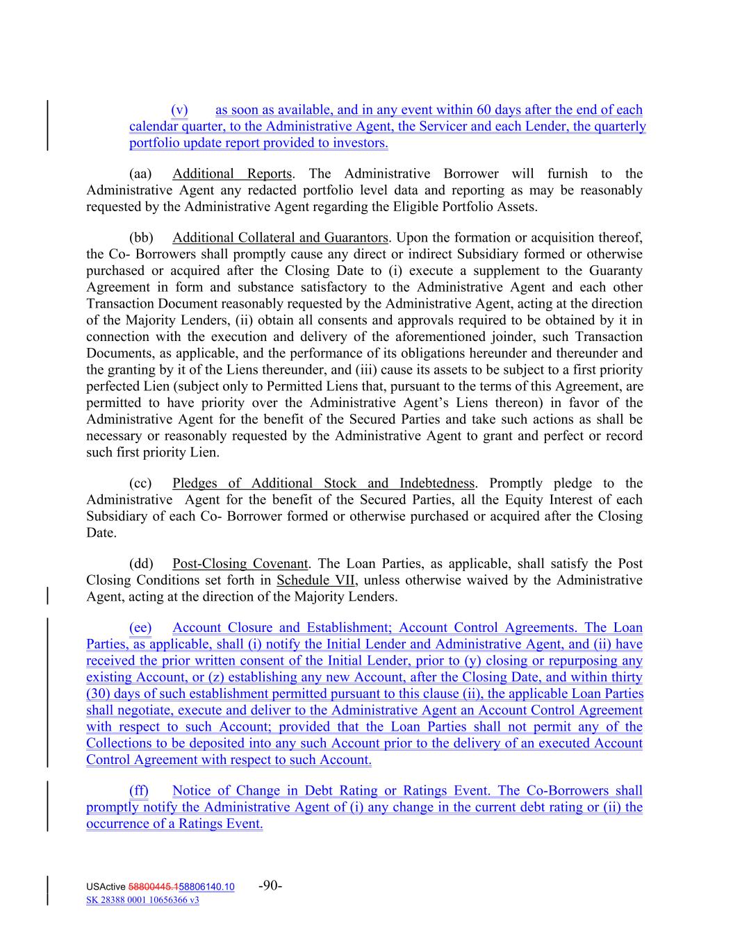 (v) as soon as available, and in any event within 60 days after the end of each calendar quarter, to the Administrative Agent, the Servicer and each Lender, the quarterly portfolio update report provided to investors. (aa) Additional Reports. The Administrative Borrower will furnish to the Administrative Agent any redacted portfolio level data and reporting as may be reasonably requested by the Administrative Agent regarding the Eligible Portfolio Assets. (bb) Additional Collateral and Guarantors. Upon the formation or acquisition thereof, the Co‐ Borrowers shall promptly cause any direct or indirect Subsidiary formed or otherwise purchased or acquired after the Closing Date to (i) execute a supplement to the Guaranty Agreement in form and substance satisfactory to the Administrative Agent and each other Transaction Document reasonably requested by the Administrative Agent, acting at the direction of the Majority Lenders, (ii) obtain all consents and approvals required to be obtained by it in connection with the execution and delivery of the aforementioned joinder, such Transaction Documents, as applicable, and the performance of its obligations hereunder and thereunder and the granting by it of the Liens thereunder, and (iii) cause its assets to be subject to a first priority perfected Lien (subject only to Permitted Liens that, pursuant to the terms of this Agreement, are permitted to have priority over the Administrative Agent’s Liens thereon) in favor of the Administrative Agent for the benefit of the Secured Parties and take such actions as shall be necessary or reasonably requested by the Administrative Agent to grant and perfect or record such first priority Lien. (cc) Pledges of Additional Stock and Indebtedness. Promptly pledge to the Administrative Agent for the benefit of the Secured Parties, all the Equity Interest of each Subsidiary of each Co‐ Borrower formed or otherwise purchased or acquired after the Closing Date. (dd) Post‐Closing Covenant. The Loan Parties, as applicable, shall satisfy the Post Closing Conditions set forth in Schedule VII, unless otherwise waived by the Administrative Agent, acting at the direction of the Majority Lenders. (ee) Account Closure and Establishment; Account Control Agreements. The Loan Parties, as applicable, shall (i) notify the Initial Lender and Administrative Agent, and (ii) have received the prior written consent of the Initial Lender, prior to (y) closing or repurposing any existing Account, or (z) establishing any new Account, after the Closing Date, and within thirty (30) days of such establishment permitted pursuant to this clause (ii), the applicable Loan Parties shall negotiate, execute and deliver to the Administrative Agent an Account Control Agreement with respect to such Account; provided that the Loan Parties shall not permit any of the Collections to be deposited into any such Account prior to the delivery of an executed Account Control Agreement with respect to such Account. (ff) Notice of Change in Debt Rating or Ratings Event. The Co-Borrowers shall promptly notify the Administrative Agent of (i) any change in the current debt rating or (ii) the occurrence of a Ratings Event. USActive 58800445.158806140.10 -90- SK 28388 0001 10656366 v3