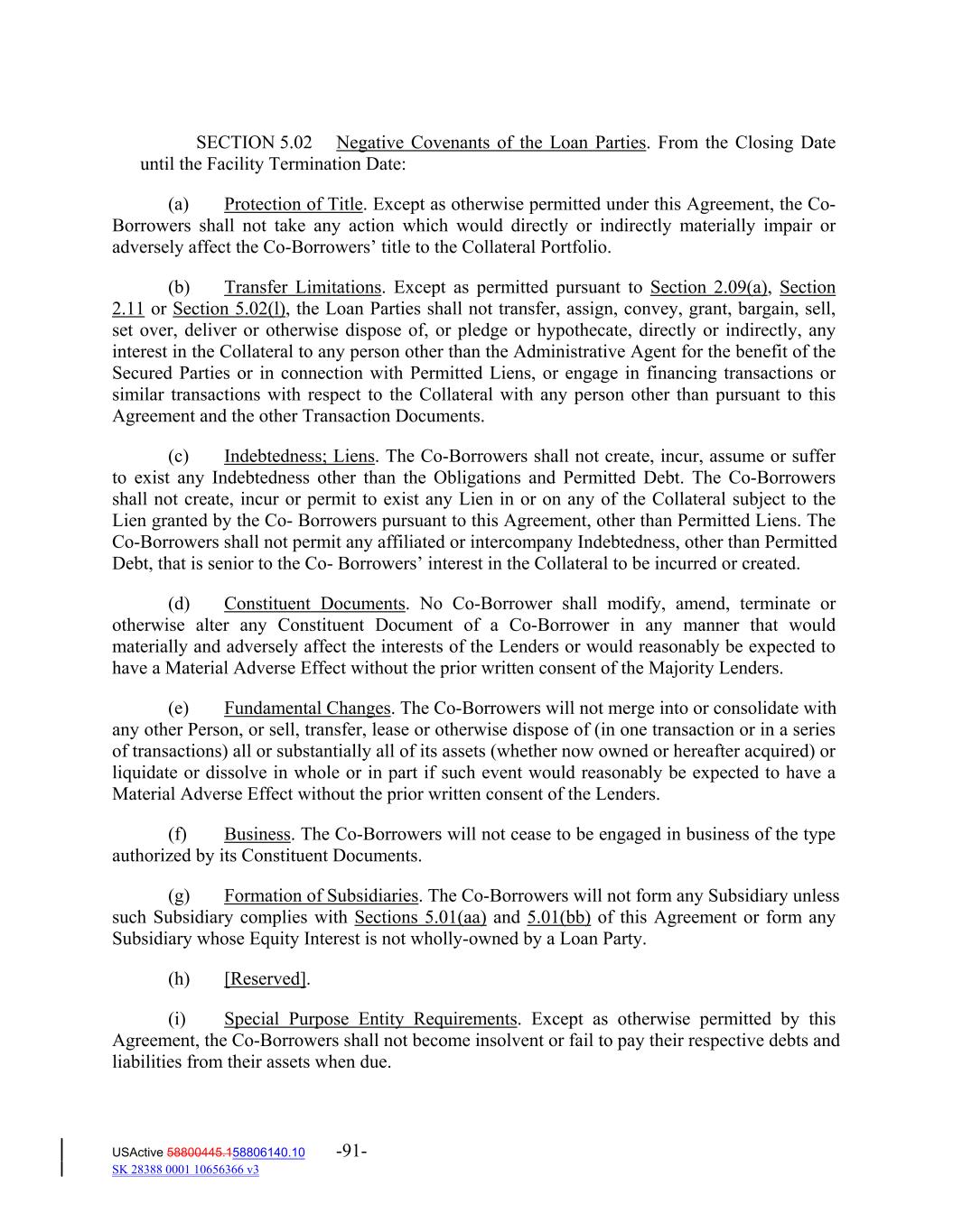 SECTION 5.02 Negative Covenants of the Loan Parties. From the Closing Date until the Facility Termination Date: (a) Protection of Title. Except as otherwise permitted under this Agreement, the Co‐ Borrowers shall not take any action which would directly or indirectly materially impair or adversely affect the Co‐Borrowers’ title to the Collateral Portfolio. (b) Transfer Limitations. Except as permitted pursuant to Section 2.09(a), Section 2.11 or Section 5.02(l), the Loan Parties shall not transfer, assign, convey, grant, bargain, sell, set over, deliver or otherwise dispose of, or pledge or hypothecate, directly or indirectly, any interest in the Collateral to any person other than the Administrative Agent for the benefit of the Secured Parties or in connection with Permitted Liens, or engage in financing transactions or similar transactions with respect to the Collateral with any person other than pursuant to this Agreement and the other Transaction Documents. (c) Indebtedness; Liens. The Co‐Borrowers shall not create, incur, assume or suffer to exist any Indebtedness other than the Obligations and Permitted Debt. The Co‐Borrowers shall not create, incur or permit to exist any Lien in or on any of the Collateral subject to the Lien granted by the Co‐ Borrowers pursuant to this Agreement, other than Permitted Liens. The Co‐Borrowers shall not permit any affiliated or intercompany Indebtedness, other than Permitted Debt, that is senior to the Co‐ Borrowers’ interest in the Collateral to be incurred or created. (d) Constituent Documents. No Co‐Borrower shall modify, amend, terminate or otherwise alter any Constituent Document of a Co‐Borrower in any manner that would materially and adversely affect the interests of the Lenders or would reasonably be expected to have a Material Adverse Effect without the prior written consent of the Majority Lenders. (e) Fundamental Changes. The Co‐Borrowers will not merge into or consolidate with any other Person, or sell, transfer, lease or otherwise dispose of (in one transaction or in a series of transactions) all or substantially all of its assets (whether now owned or hereafter acquired) or liquidate or dissolve in whole or in part if such event would reasonably be expected to have a Material Adverse Effect without the prior written consent of the Lenders. (f) Business. The Co‐Borrowers will not cease to be engaged in business of the type authorized by its Constituent Documents. (g) Formation of Subsidiaries. The Co‐Borrowers will not form any Subsidiary unless such Subsidiary complies with Sections 5.01(aa) and 5.01(bb) of this Agreement or form any Subsidiary whose Equity Interest is not wholly‐owned by a Loan Party. (h) [Reserved]. (i) Special Purpose Entity Requirements. Except as otherwise permitted by this Agreement, the Co‐Borrowers shall not become insolvent or fail to pay their respective debts and liabilities from their assets when due. USActive 58800445.158806140.10 -91- SK 28388 0001 10656366 v3
