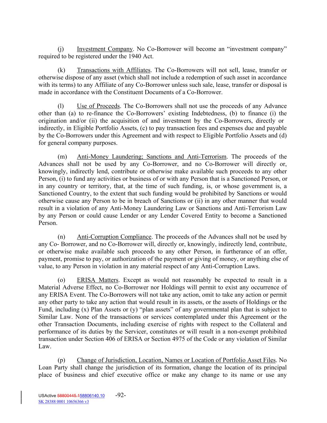 (j) Investment Company. No Co‐Borrower will become an “investment company” required to be registered under the 1940 Act. (k) Transactions with Affiliates. The Co‐Borrowers will not sell, lease, transfer or otherwise dispose of any asset (which shall not include a redemption of such asset in accordance with its terms) to any Affiliate of any Co‐Borrower unless such sale, lease, transfer or disposal is made in accordance with the Constituent Documents of a Co‐Borrower. (l) Use of Proceeds. The Co‐Borrowers shall not use the proceeds of any Advance other than (a) to re‐finance the Co‐Borrowers’ existing Indebtedness, (b) to finance (i) the origination and/or (ii) the acquisition of and investment by the Co‐Borrowers, directly or indirectly, in Eligible Portfolio Assets, (c) to pay transaction fees and expenses due and payable by the Co‐Borrowers under this Agreement and with respect to Eligible Portfolio Assets and (d) for general company purposes. (m) Anti‐Money Laundering; Sanctions and Anti‐Terrorism. The proceeds of the Advances shall not be used by any Co‐Borrower, and no Co‐Borrower will directly or, knowingly, indirectly lend, contribute or otherwise make available such proceeds to any other Person, (i) to fund any activities or business of or with any Person that is a Sanctioned Person, or in any country or territory, that, at the time of such funding, is, or whose government is, a Sanctioned Country, to the extent that such funding would be prohibited by Sanctions or would otherwise cause any Person to be in breach of Sanctions or (ii) in any other manner that would result in a violation of any Anti‐Money Laundering Law or Sanctions and Anti‐Terrorism Law by any Person or could cause Lender or any Lender Covered Entity to become a Sanctioned Person. (n) Anti‐Corruption Compliance. The proceeds of the Advances shall not be used by any Co‐ Borrower, and no Co‐Borrower will, directly or, knowingly, indirectly lend, contribute, or otherwise make available such proceeds to any other Person, in furtherance of an offer, payment, promise to pay, or authorization of the payment or giving of money, or anything else of value, to any Person in violation in any material respect of any Anti‐Corruption Laws. (o) ERISA Matters. Except as would not reasonably be expected to result in a Material Adverse Effect, no Co‐Borrower nor Holdings will permit to exist any occurrence of any ERISA Event. The Co‐Borrowers will not take any action, omit to take any action or permit any other party to take any action that would result in its assets, or the assets of Holdings or the Fund, including (x) Plan Assets or (y) “plan assets” of any governmental plan that is subject to Similar Law. None of the transactions or services contemplated under this Agreement or the other Transaction Documents, including exercise of rights with respect to the Collateral and performance of its duties by the Servicer, constitutes or will result in a non‐exempt prohibited transaction under Section 406 of ERISA or Section 4975 of the Code or any violation of Similar Law. (p) Change of Jurisdiction, Location, Names or Location of Portfolio Asset Files. No Loan Party shall change the jurisdiction of its formation, change the location of its principal place of business and chief executive office or make any change to its name or use any USActive 58800445.158806140.10 -92- SK 28388 0001 10656366 v3