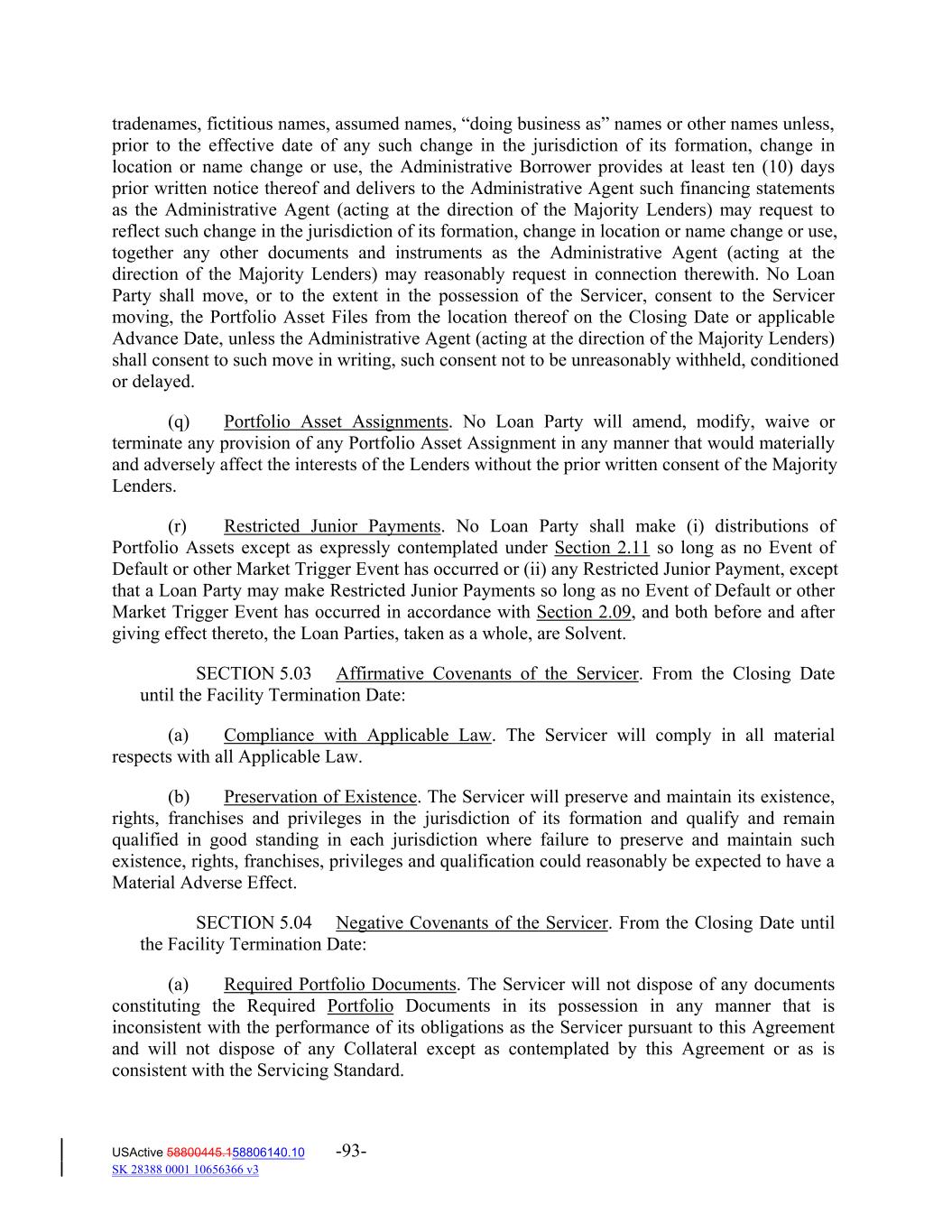 tradenames, fictitious names, assumed names, “doing business as” names or other names unless, prior to the effective date of any such change in the jurisdiction of its formation, change in location or name change or use, the Administrative Borrower provides at least ten (10) days prior written notice thereof and delivers to the Administrative Agent such financing statements as the Administrative Agent (acting at the direction of the Majority Lenders) may request to reflect such change in the jurisdiction of its formation, change in location or name change or use, together any other documents and instruments as the Administrative Agent (acting at the direction of the Majority Lenders) may reasonably request in connection therewith. No Loan Party shall move, or to the extent in the possession of the Servicer, consent to the Servicer moving, the Portfolio Asset Files from the location thereof on the Closing Date or applicable Advance Date, unless the Administrative Agent (acting at the direction of the Majority Lenders) shall consent to such move in writing, such consent not to be unreasonably withheld, conditioned or delayed. (q) Portfolio Asset Assignments. No Loan Party will amend, modify, waive or terminate any provision of any Portfolio Asset Assignment in any manner that would materially and adversely affect the interests of the Lenders without the prior written consent of the Majority Lenders. (r) Restricted Junior Payments. No Loan Party shall make (i) distributions of Portfolio Assets except as expressly contemplated under Section 2.11 so long as no Event of Default or other Market Trigger Event has occurred or (ii) any Restricted Junior Payment, except that a Loan Party may make Restricted Junior Payments so long as no Event of Default or other Market Trigger Event has occurred in accordance with Section 2.09, and both before and after giving effect thereto, the Loan Parties, taken as a whole, are Solvent. SECTION 5.03 Affirmative Covenants of the Servicer. From the Closing Date until the Facility Termination Date: (a) Compliance with Applicable Law. The Servicer will comply in all material respects with all Applicable Law. (b) Preservation of Existence. The Servicer will preserve and maintain its existence, rights, franchises and privileges in the jurisdiction of its formation and qualify and remain qualified in good standing in each jurisdiction where failure to preserve and maintain such existence, rights, franchises, privileges and qualification could reasonably be expected to have a Material Adverse Effect. SECTION 5.04 Negative Covenants of the Servicer. From the Closing Date until the Facility Termination Date: (a) Required Portfolio Documents. The Servicer will not dispose of any documents constituting the Required Portfolio Documents in its possession in any manner that is inconsistent with the performance of its obligations as the Servicer pursuant to this Agreement and will not dispose of any Collateral except as contemplated by this Agreement or as is consistent with the Servicing Standard. USActive 58800445.158806140.10 -93- SK 28388 0001 10656366 v3