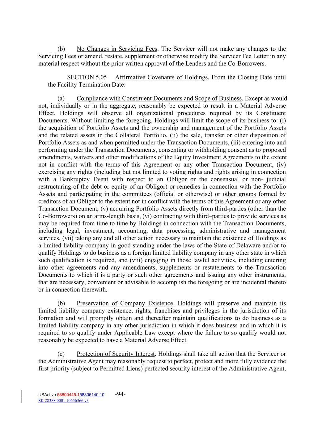 (b) No Changes in Servicing Fees. The Servicer will not make any changes to the Servicing Fees or amend, restate, supplement or otherwise modify the Servicer Fee Letter in any material respect without the prior written approval of the Lenders and the Co‐Borrowers. SECTION 5.05 Affirmative Covenants of Holdings. From the Closing Date until the Facility Termination Date: (a) Compliance with Constituent Documents and Scope of Business. Except as would not, individually or in the aggregate, reasonably be expected to result in a Material Adverse Effect, Holdings will observe all organizational procedures required by its Constituent Documents. Without limiting the foregoing, Holdings will limit the scope of its business to: (i) the acquisition of Portfolio Assets and the ownership and management of the Portfolio Assets and the related assets in the Collateral Portfolio, (ii) the sale, transfer or other disposition of Portfolio Assets as and when permitted under the Transaction Documents, (iii) entering into and performing under the Transaction Documents, consenting or withholding consent as to proposed amendments, waivers and other modifications of the Equity Investment Agreements to the extent not in conflict with the terms of this Agreement or any other Transaction Document, (iv) exercising any rights (including but not limited to voting rights and rights arising in connection with a Bankruptcy Event with respect to an Obligor or the consensual or non‐ judicial restructuring of the debt or equity of an Obligor) or remedies in connection with the Portfolio Assets and participating in the committees (official or otherwise) or other groups formed by creditors of an Obligor to the extent not in conflict with the terms of this Agreement or any other Transaction Document, (v) acquiring Portfolio Assets directly from third‐parties (other than the Co‐Borrowers) on an arms‐length basis, (vi) contracting with third–parties to provide services as may be required from time to time by Holdings in connection with the Transaction Documents, including legal, investment, accounting, data processing, administrative and management services, (vii) taking any and all other action necessary to maintain the existence of Holdings as a limited liability company in good standing under the laws of the State of Delaware and/or to qualify Holdings to do business as a foreign limited liability company in any other state in which such qualification is required, and (viii) engaging in those lawful activities, including entering into other agreements and any amendments, supplements or restatements to the Transaction Documents to which it is a party or such other agreements and issuing any other instruments, that are necessary, convenient or advisable to accomplish the foregoing or are incidental thereto or in connection therewith. (b) Preservation of Company Existence. Holdings will preserve and maintain its limited liability company existence, rights, franchises and privileges in the jurisdiction of its formation and will promptly obtain and thereafter maintain qualifications to do business as a limited liability company in any other jurisdiction in which it does business and in which it is required to so qualify under Applicable Law except where the failure to so qualify would not reasonably be expected to have a Material Adverse Effect. (c) Protection of Security Interest. Holdings shall take all action that the Servicer or the Administrative Agent may reasonably request to perfect, protect and more fully evidence the first priority (subject to Permitted Liens) perfected security interest of the Administrative Agent, USActive 58800445.158806140.10 -94- SK 28388 0001 10656366 v3